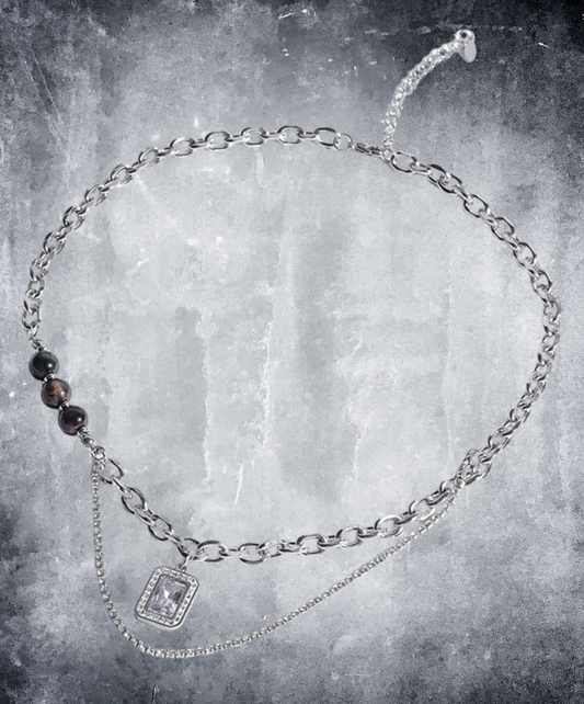 square clear stone x black round beads necklace EN2740