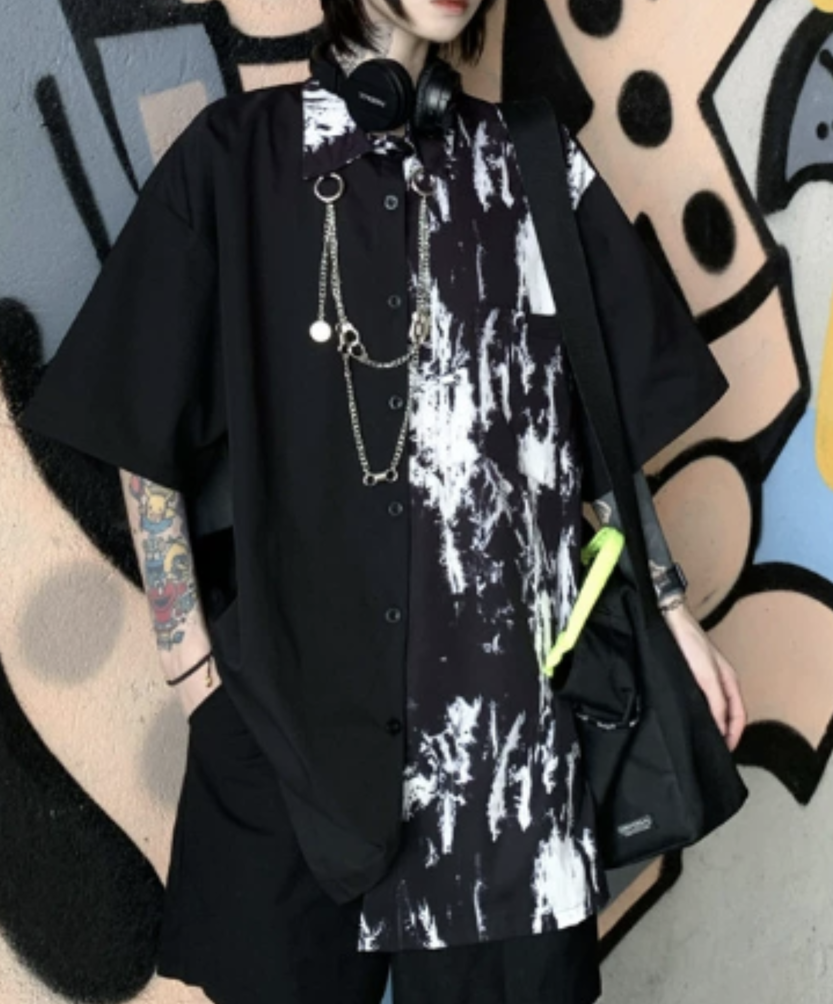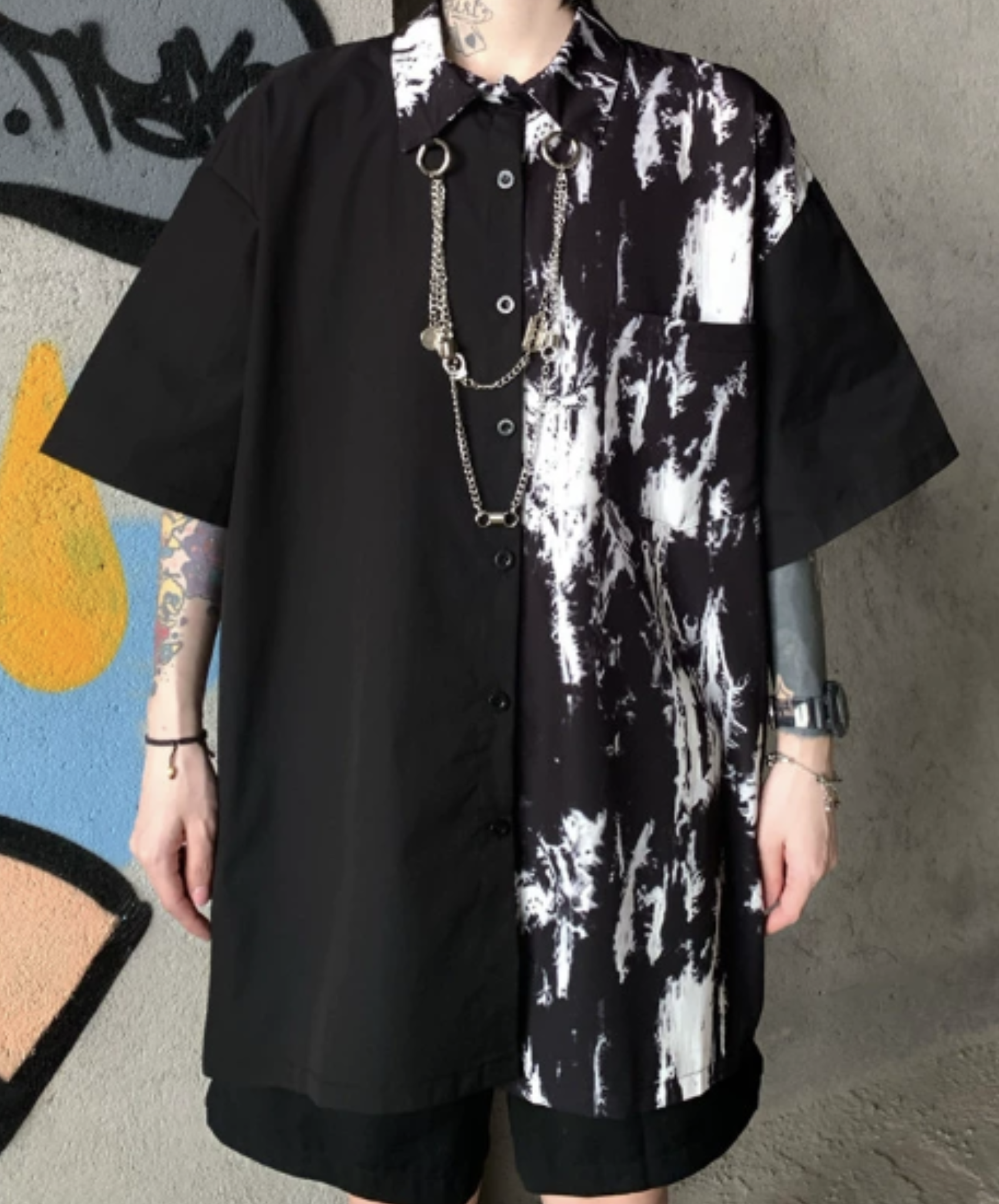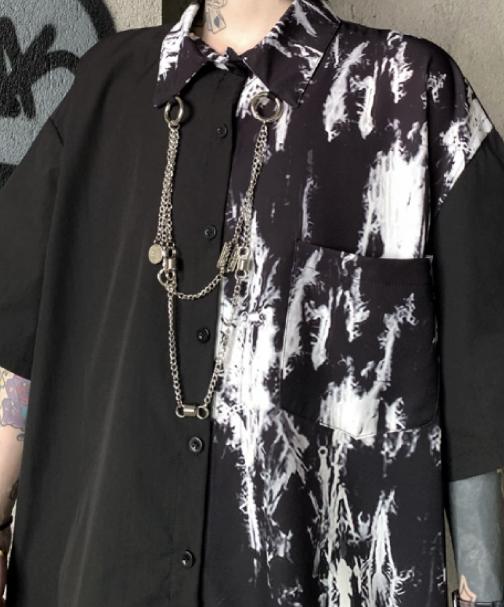 ・人目を惹く切り替えデザインとチェーン飾りが魅力のシャツ。