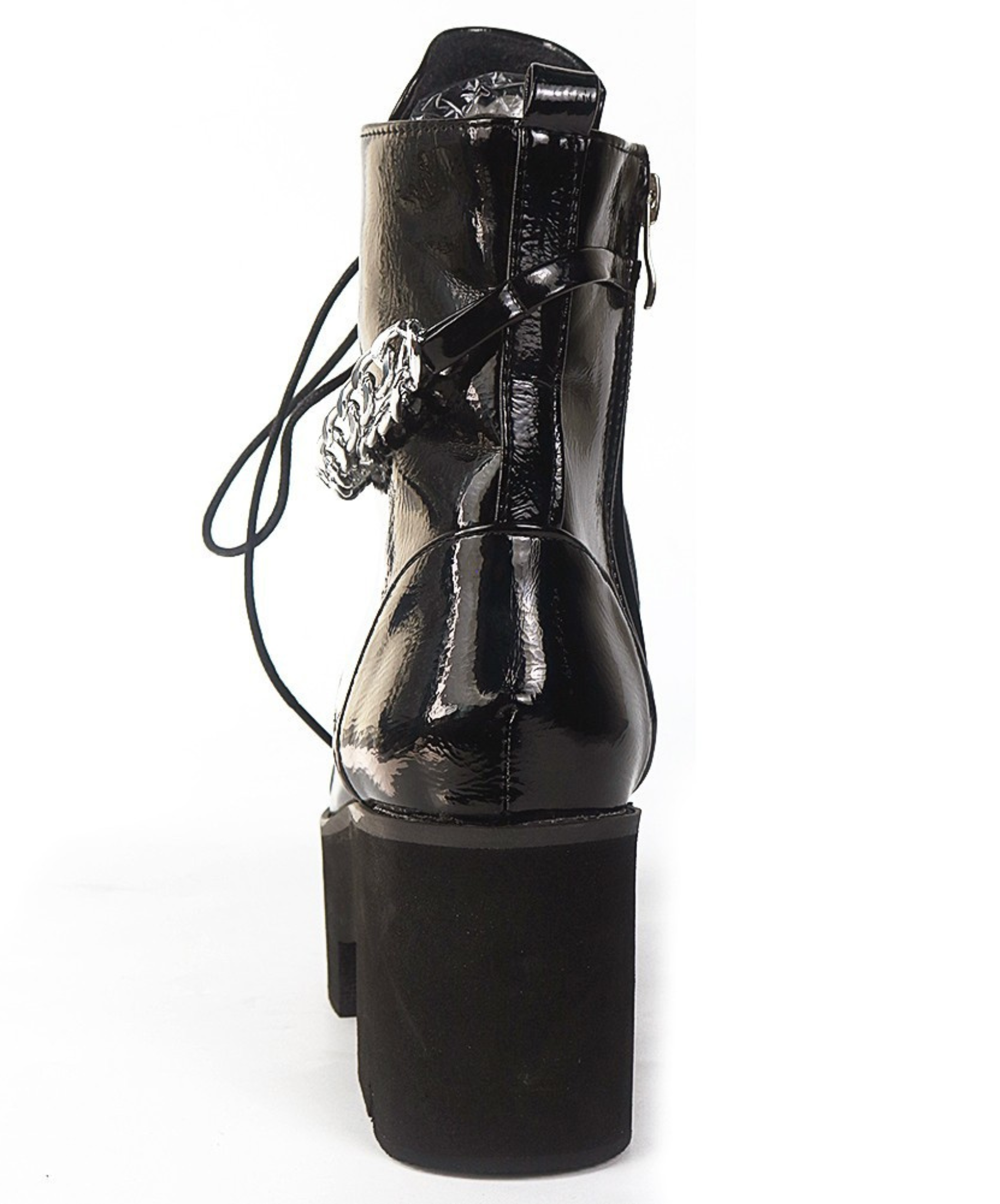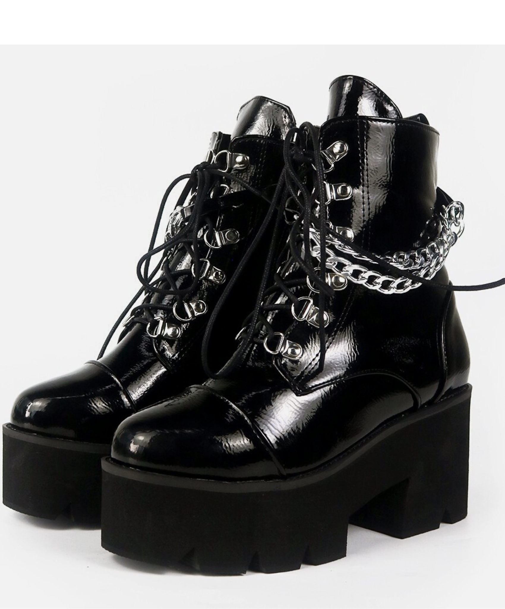 ・光沢感のあるボディとダブルチェーンが上品な足元を創り上げる厚底ブーツ。