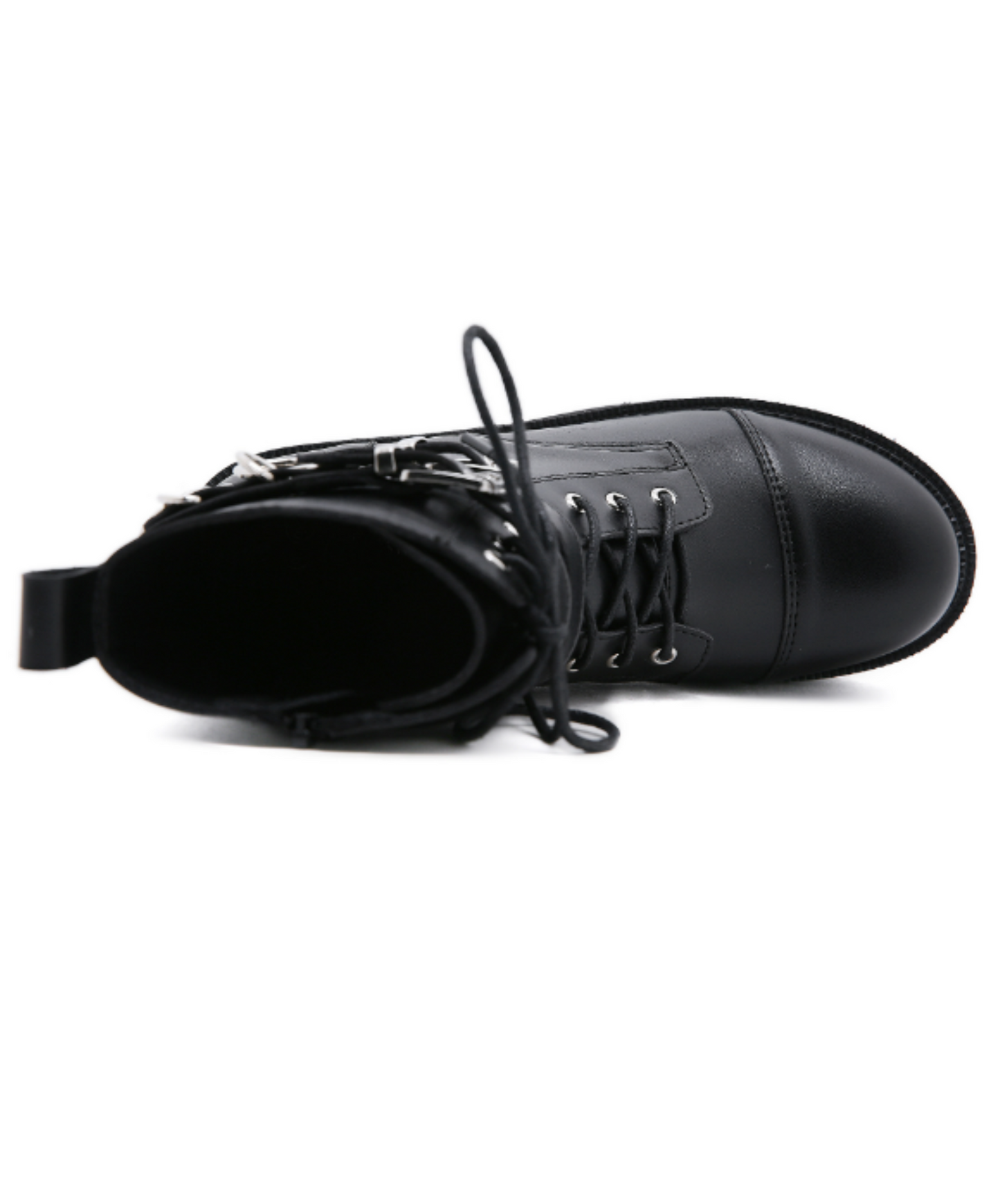 ・サイドジップアップのダブルベルト厚底ブーツ。