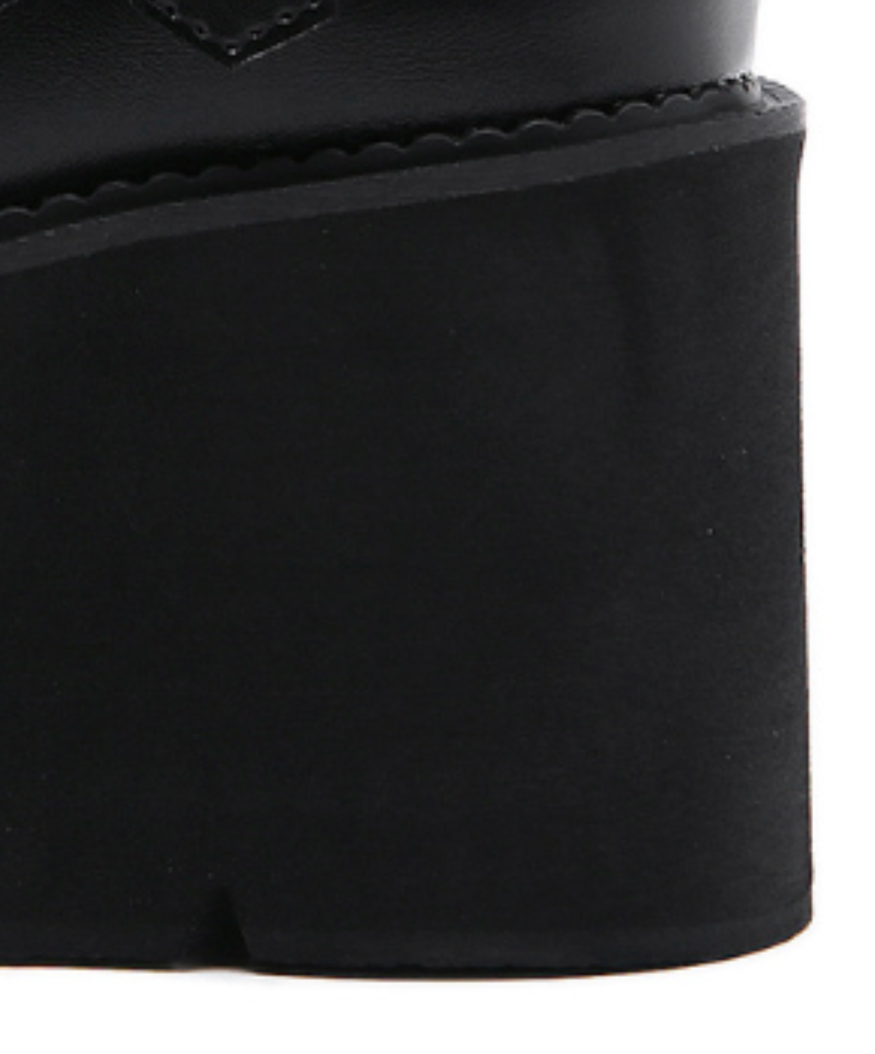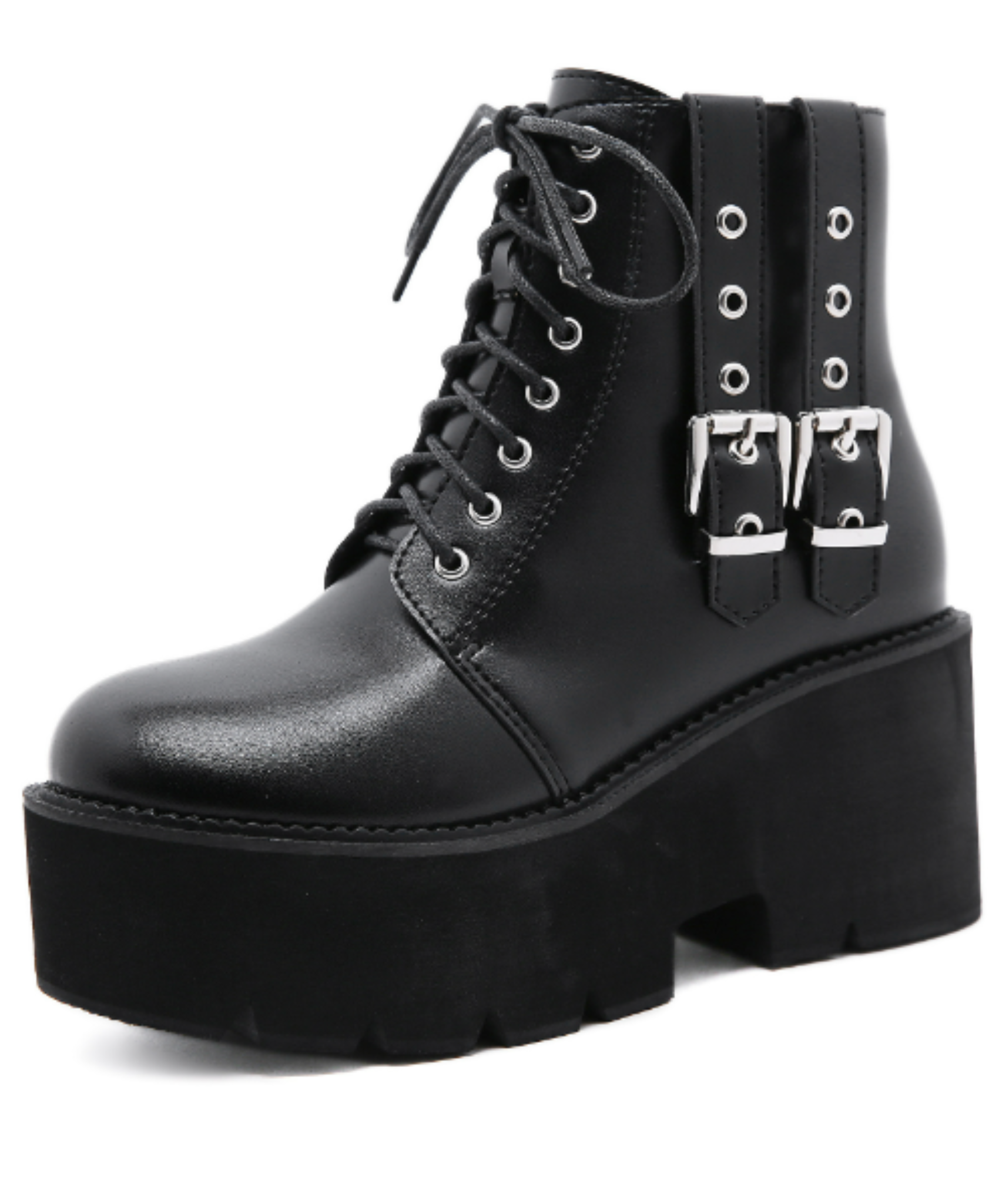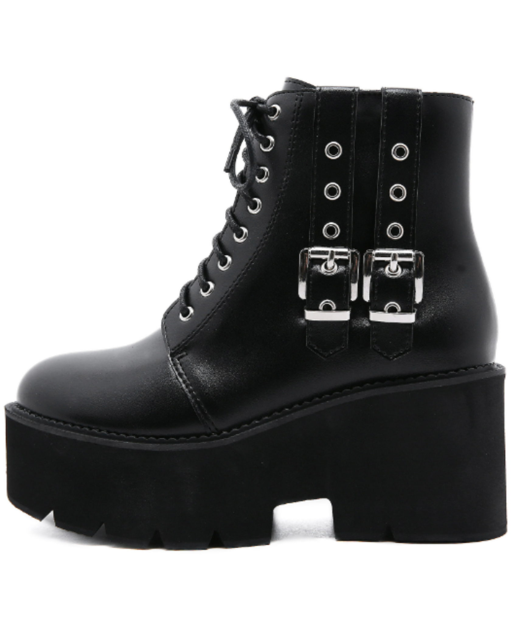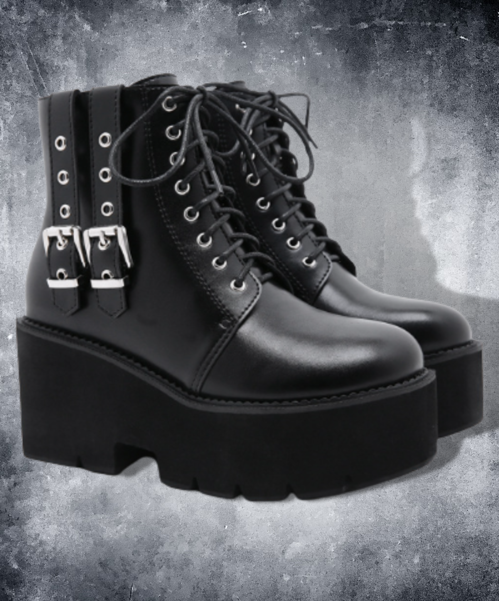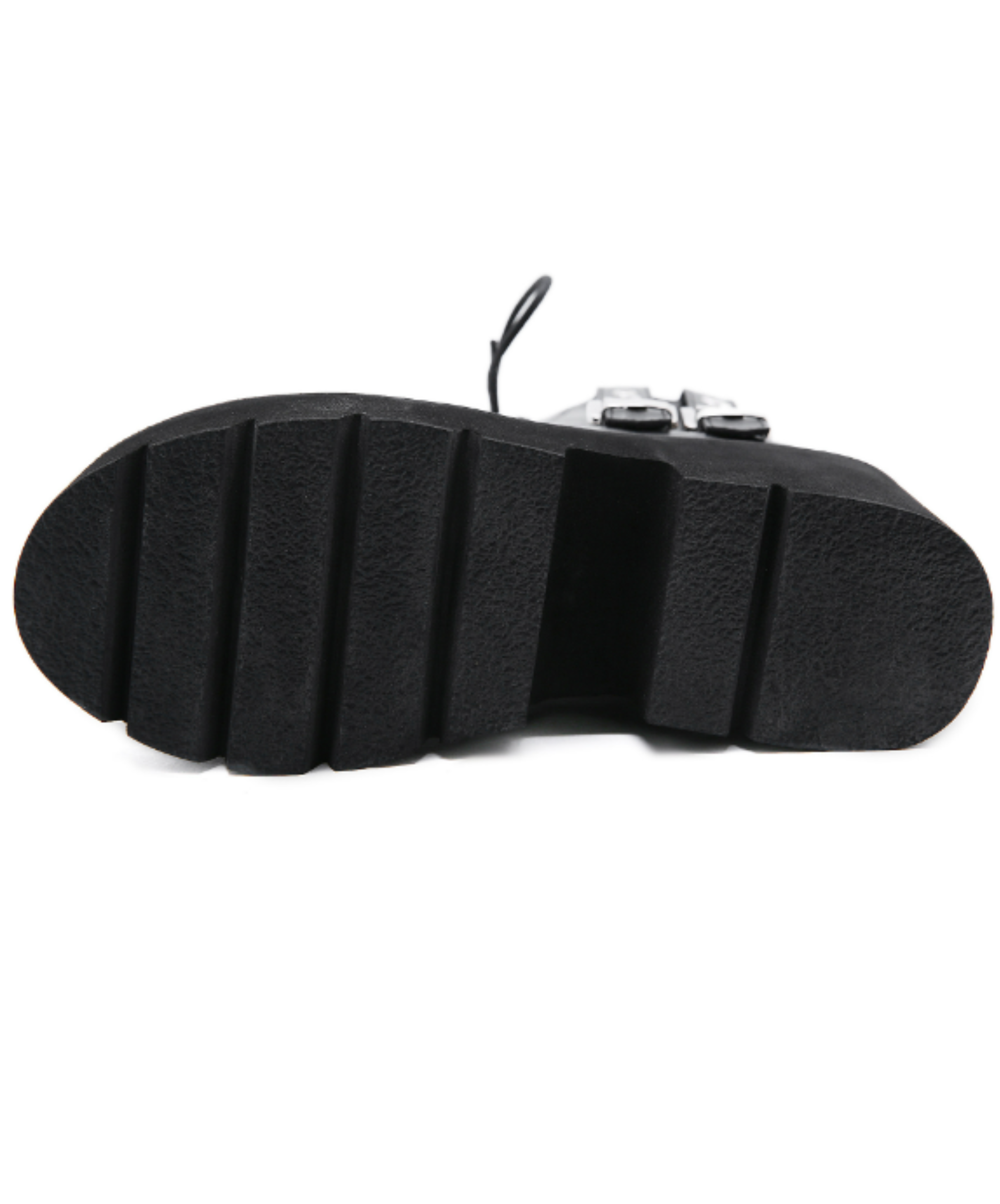 ・サイドのダブルバックルがシャープな印象の厚底ブーツ。
