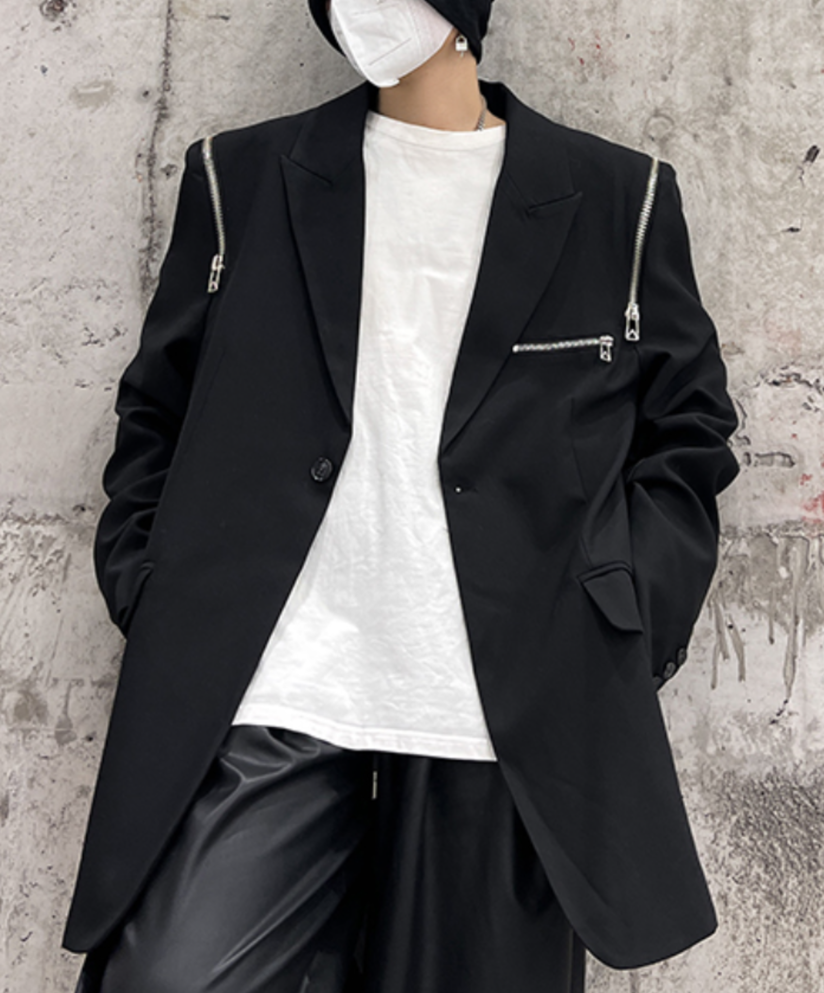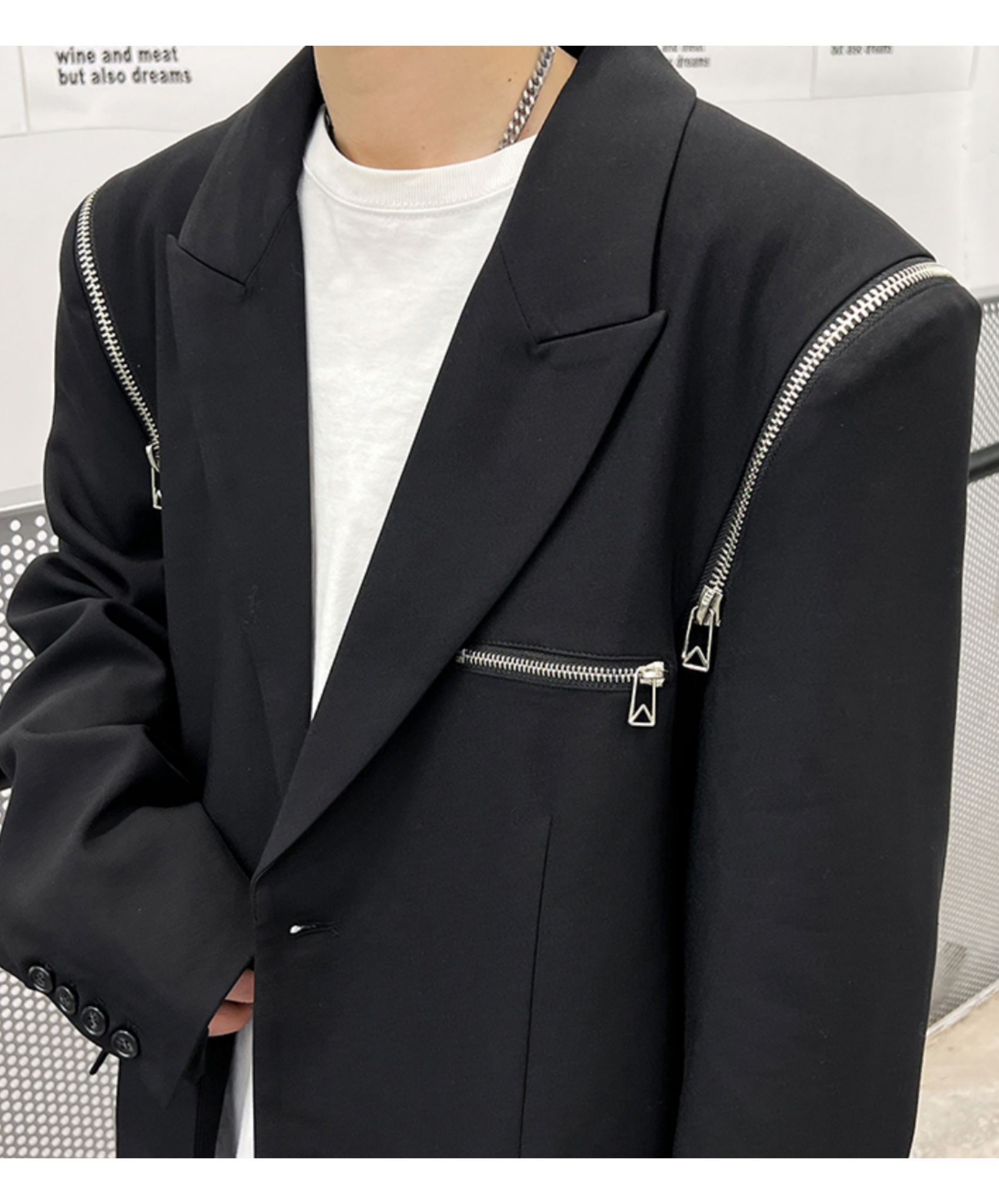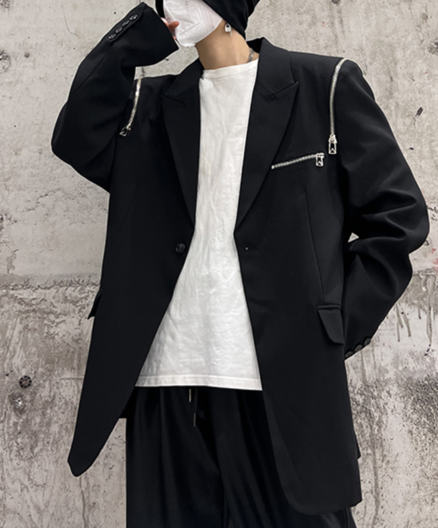 ・ショルダーと胸元のジップアップ装飾デザインが珍しいジャケット。