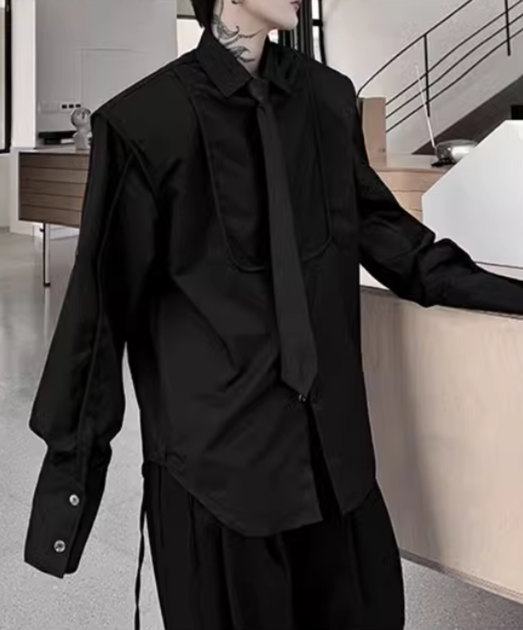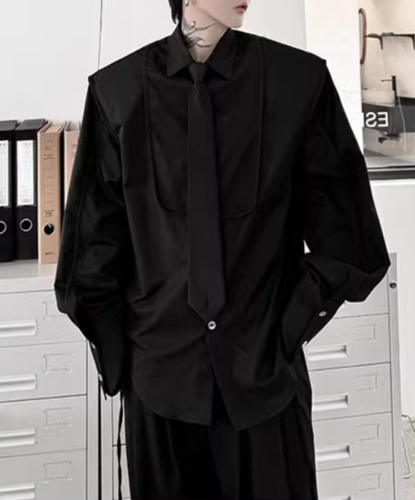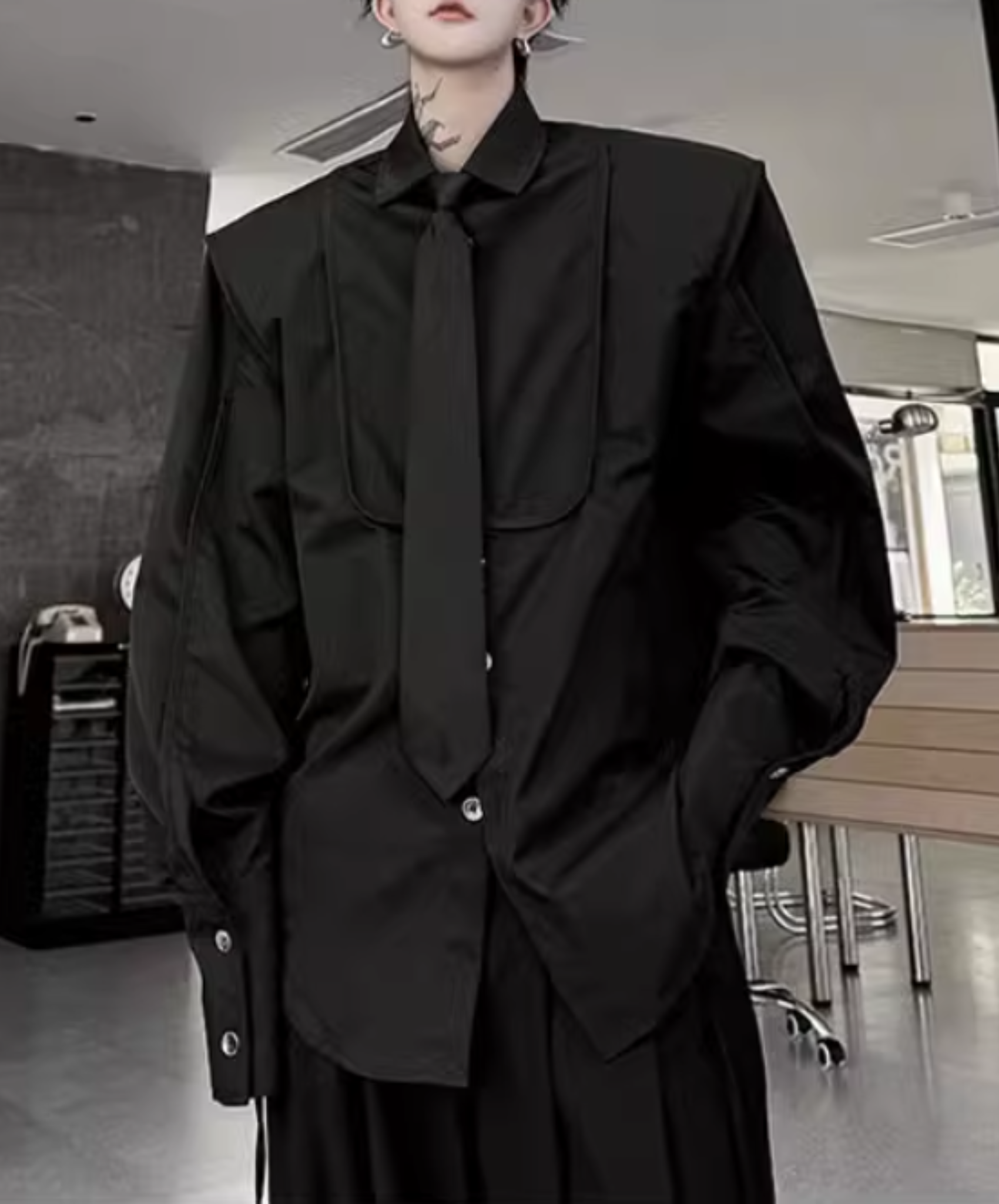 ・シルバーのボタンとシックなネクタイがスタイリッシュなコーデを実現するシャツ。