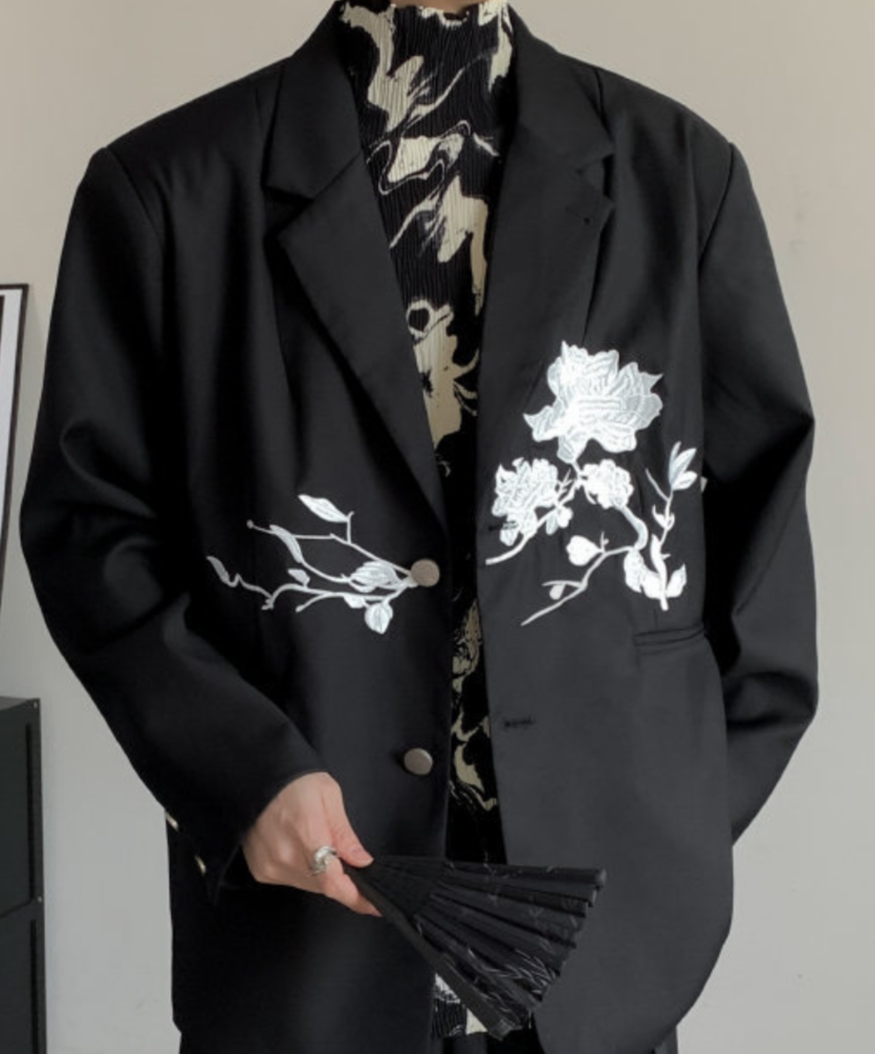 ・胸元にあしらわれた大きな薔薇の刺繍が高級感のあるテーラードジャケット