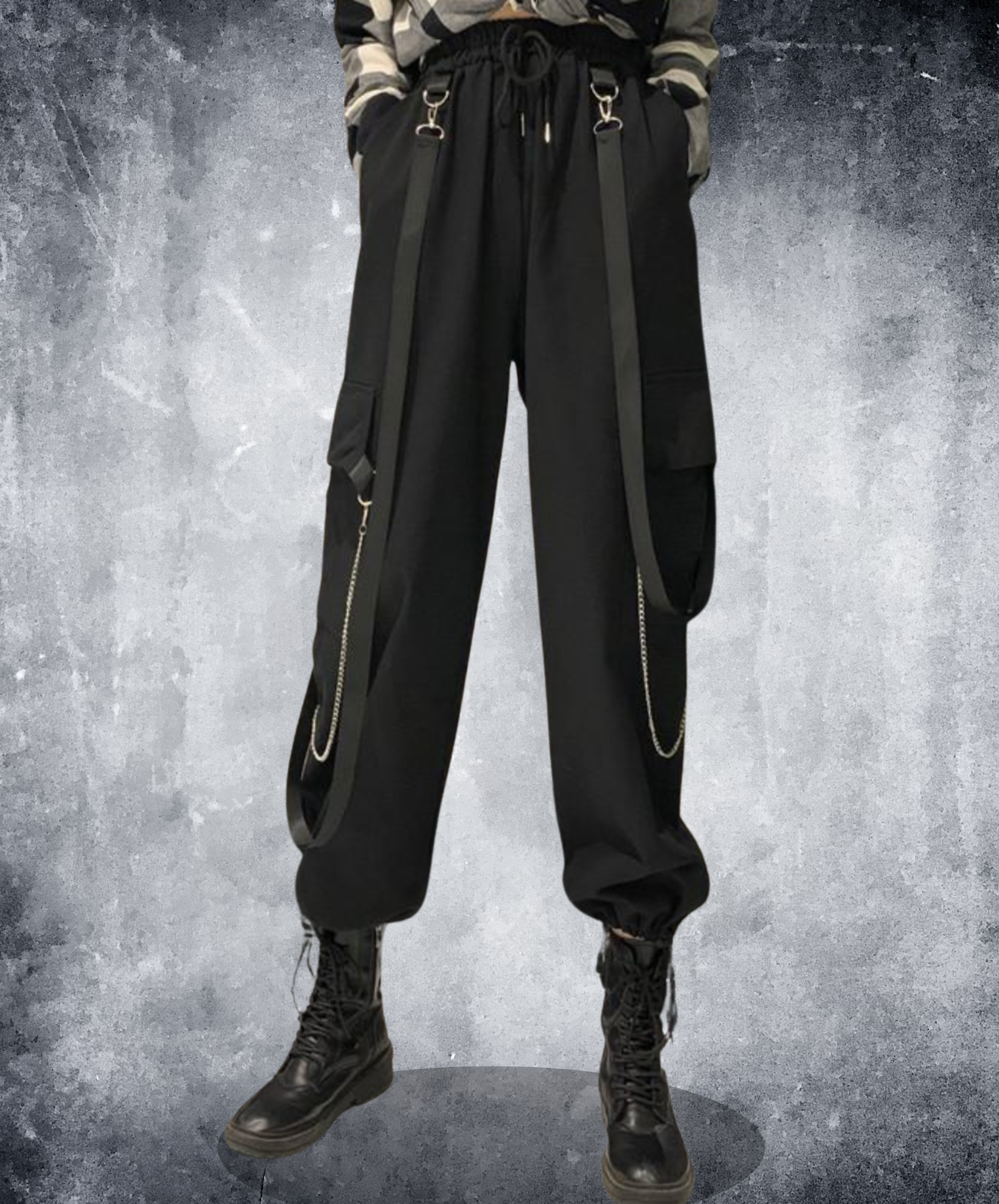 ・裾に届きそうな程のロングベルトが付いたカーゴパンツ。