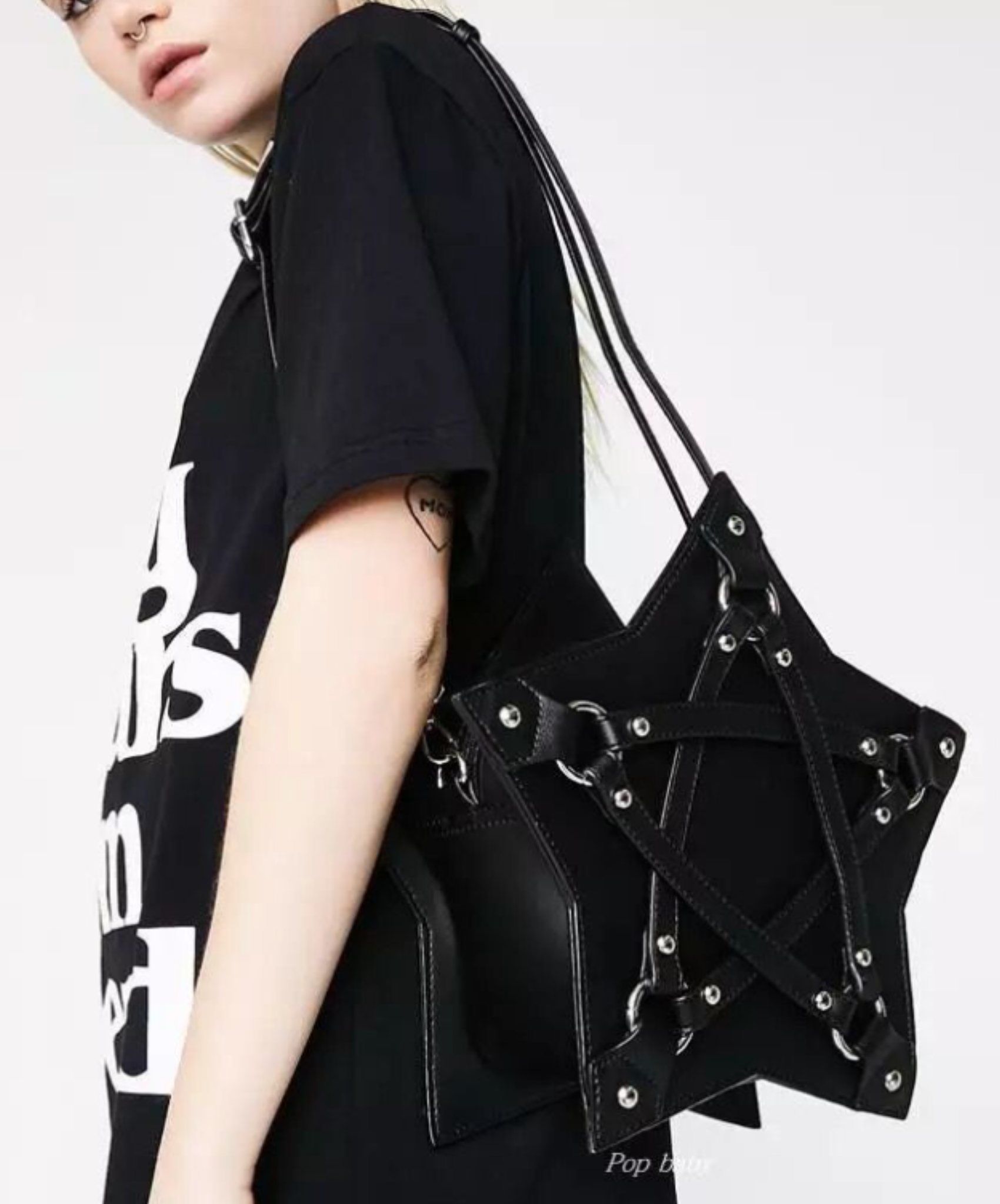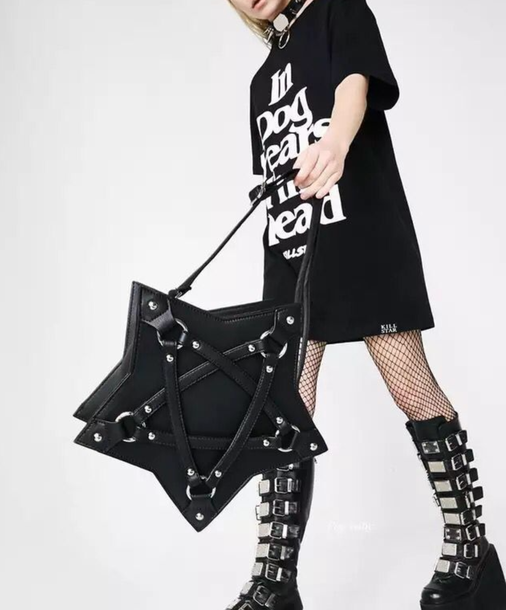 ・絶妙に配置されたベルトやスタッズで五芒星を強調します。