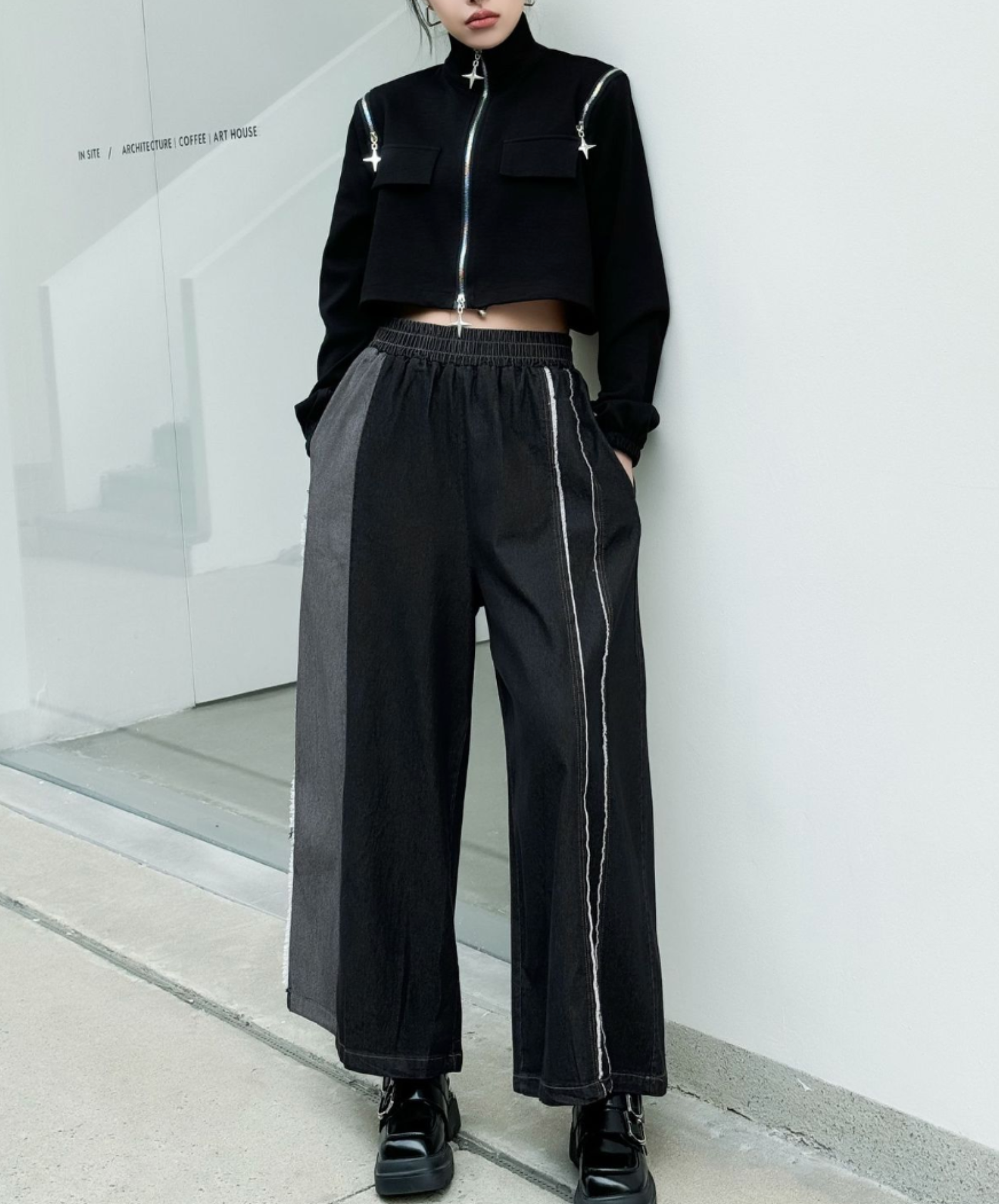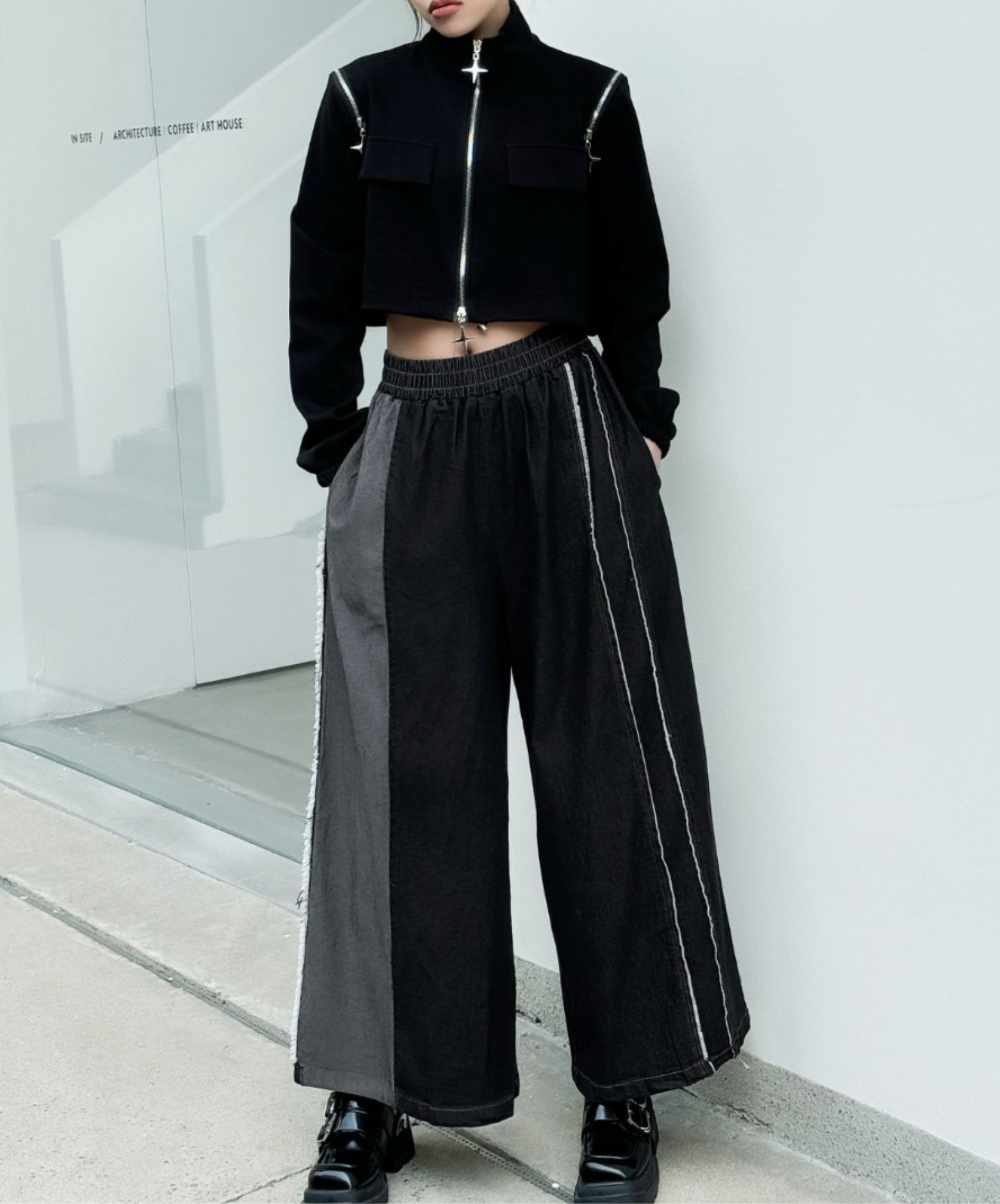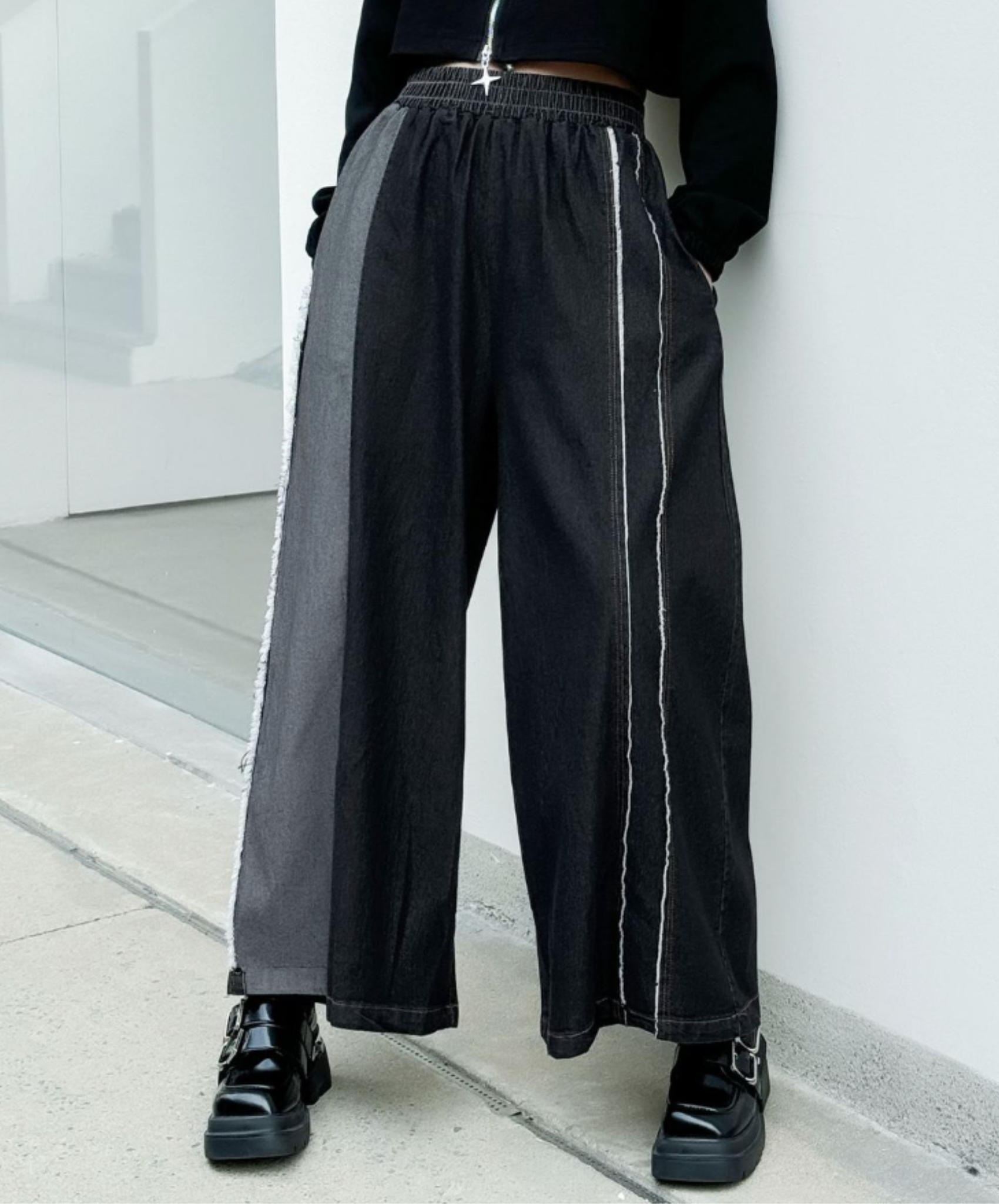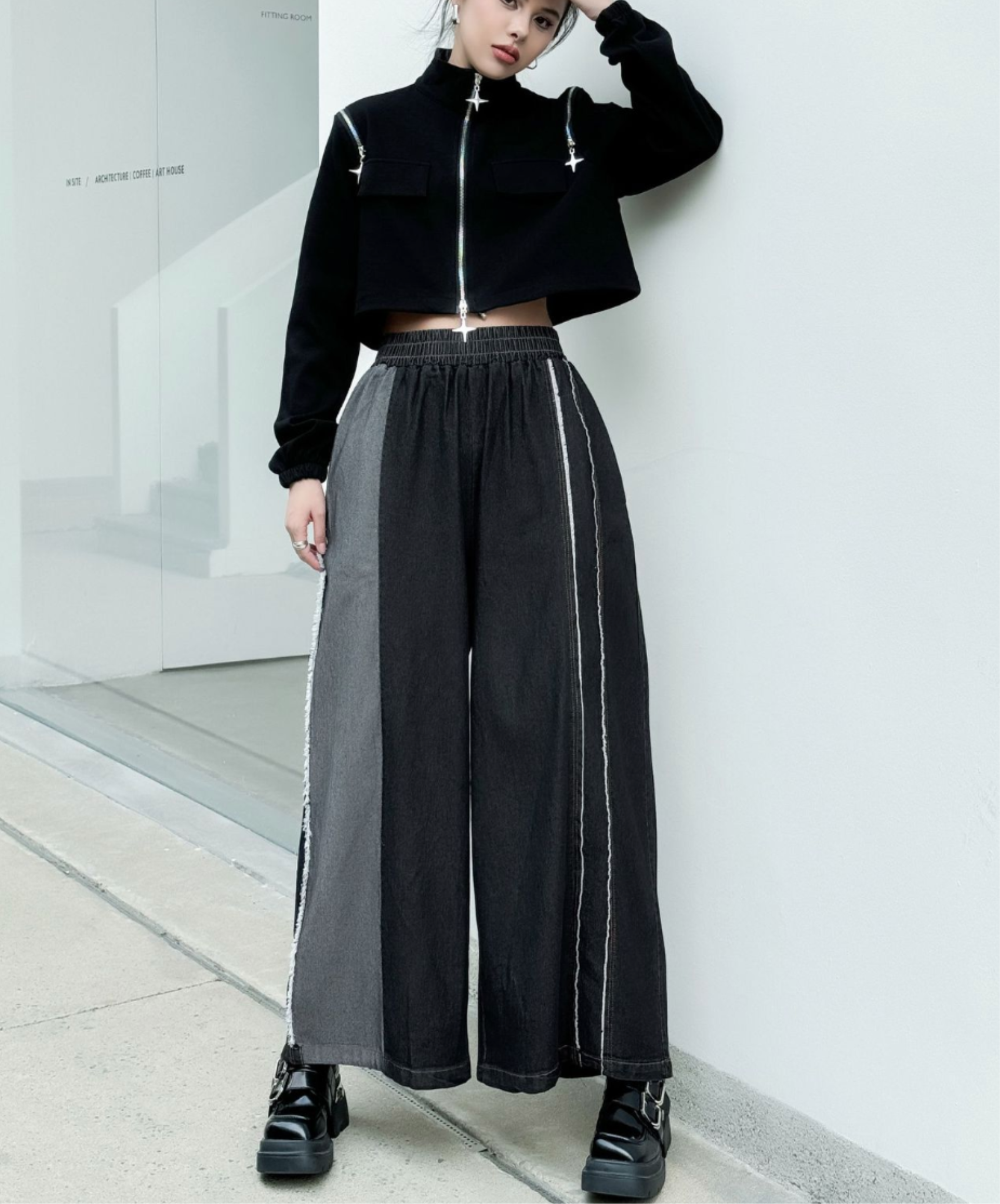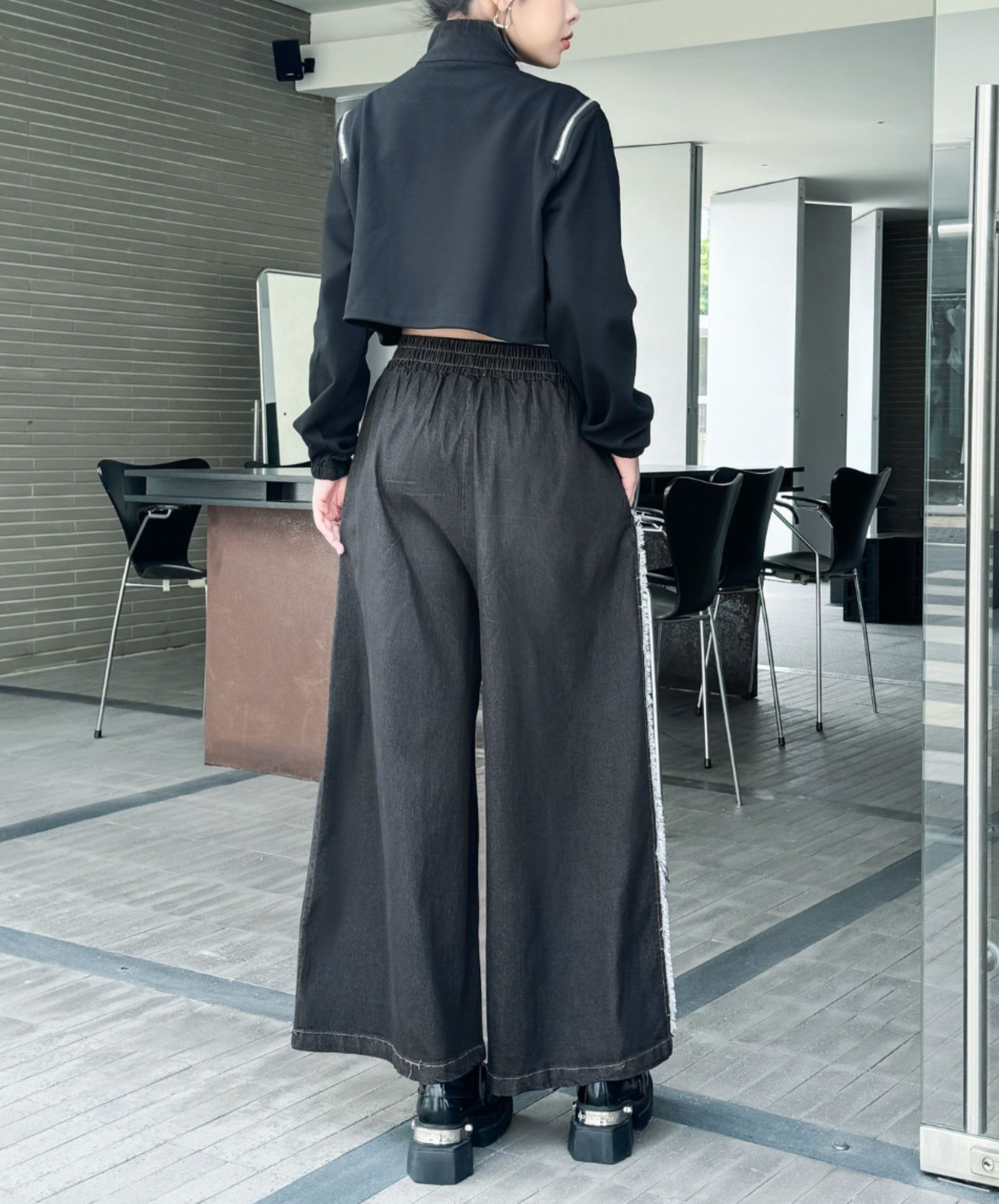 ・Wのホワイトラインとフリンジラインのカジュアルワイドパンツ。