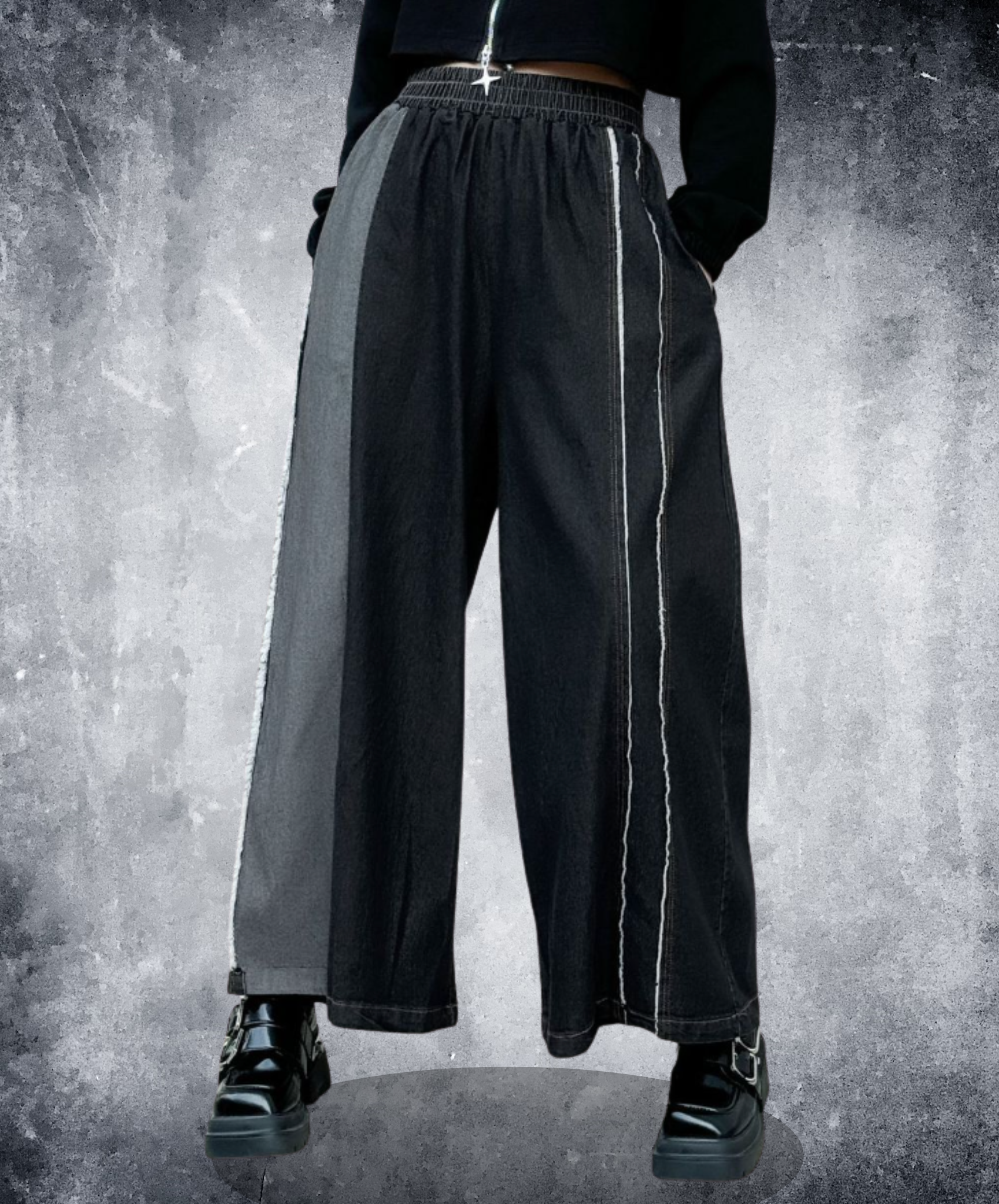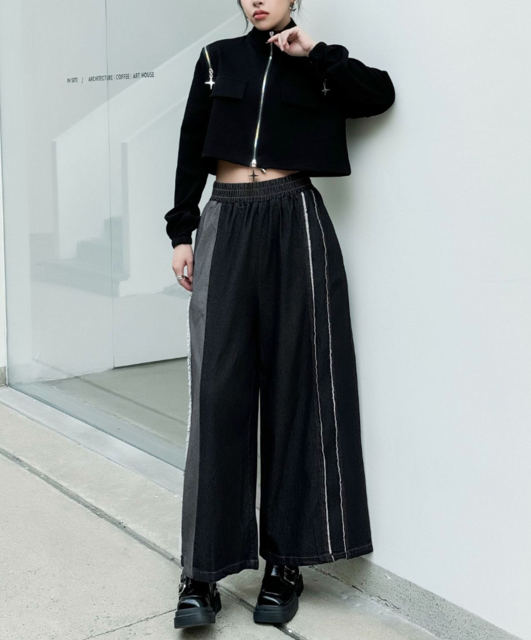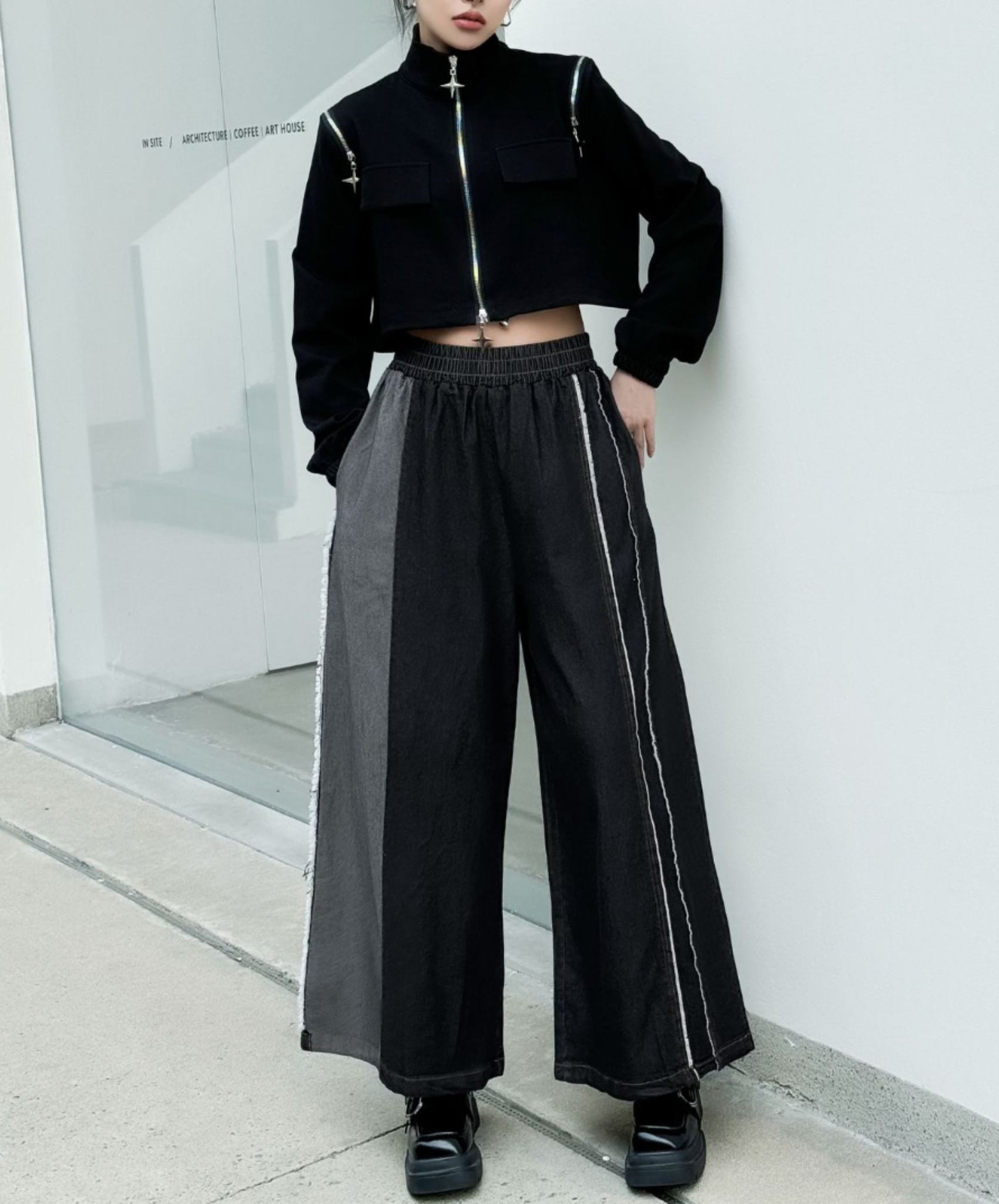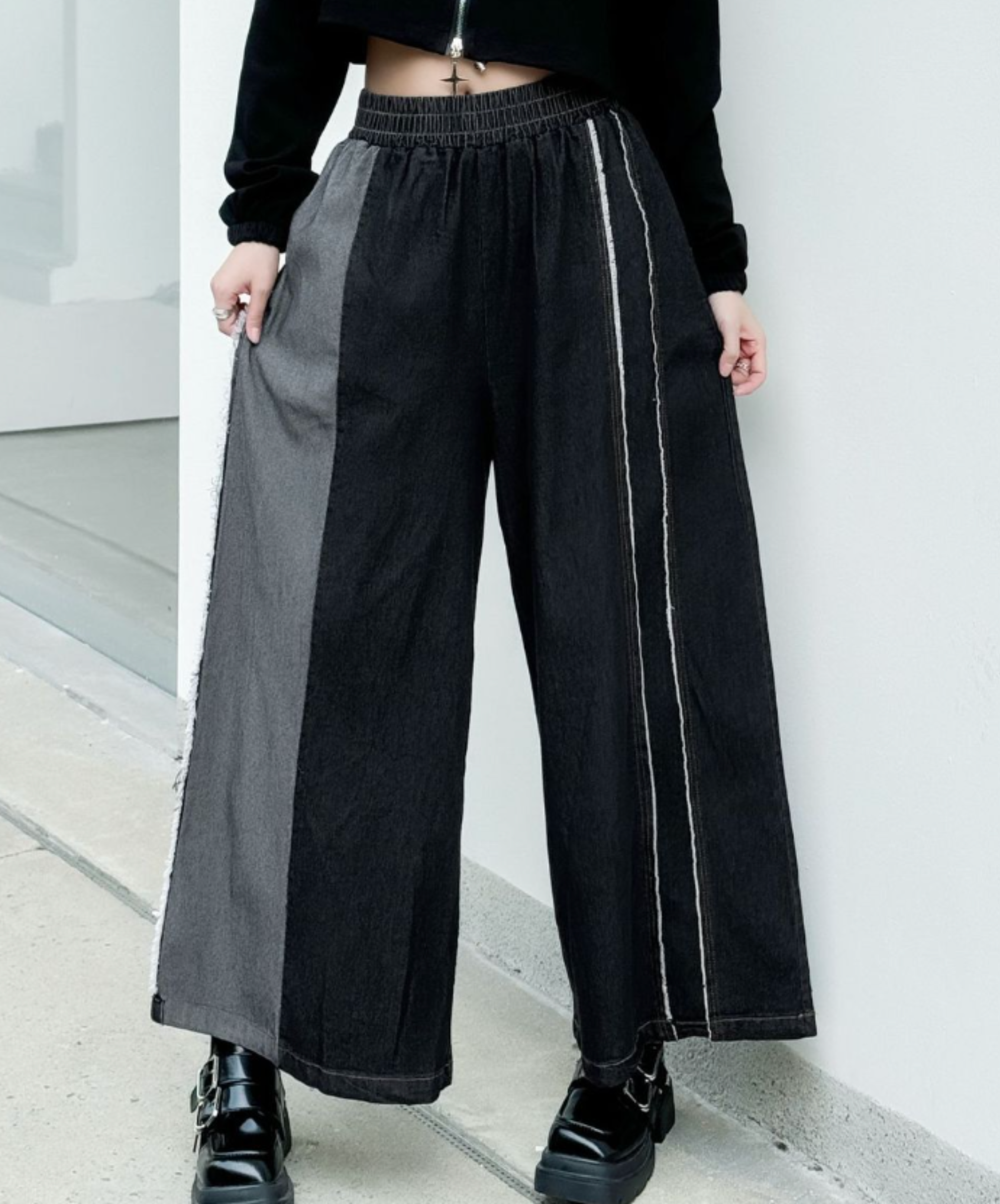 ・Wのホワイトラインとフリンジラインのカジュアルワイドパンツ。