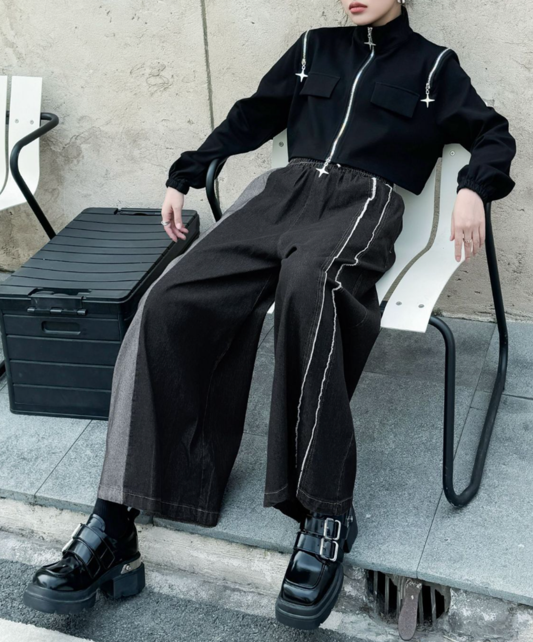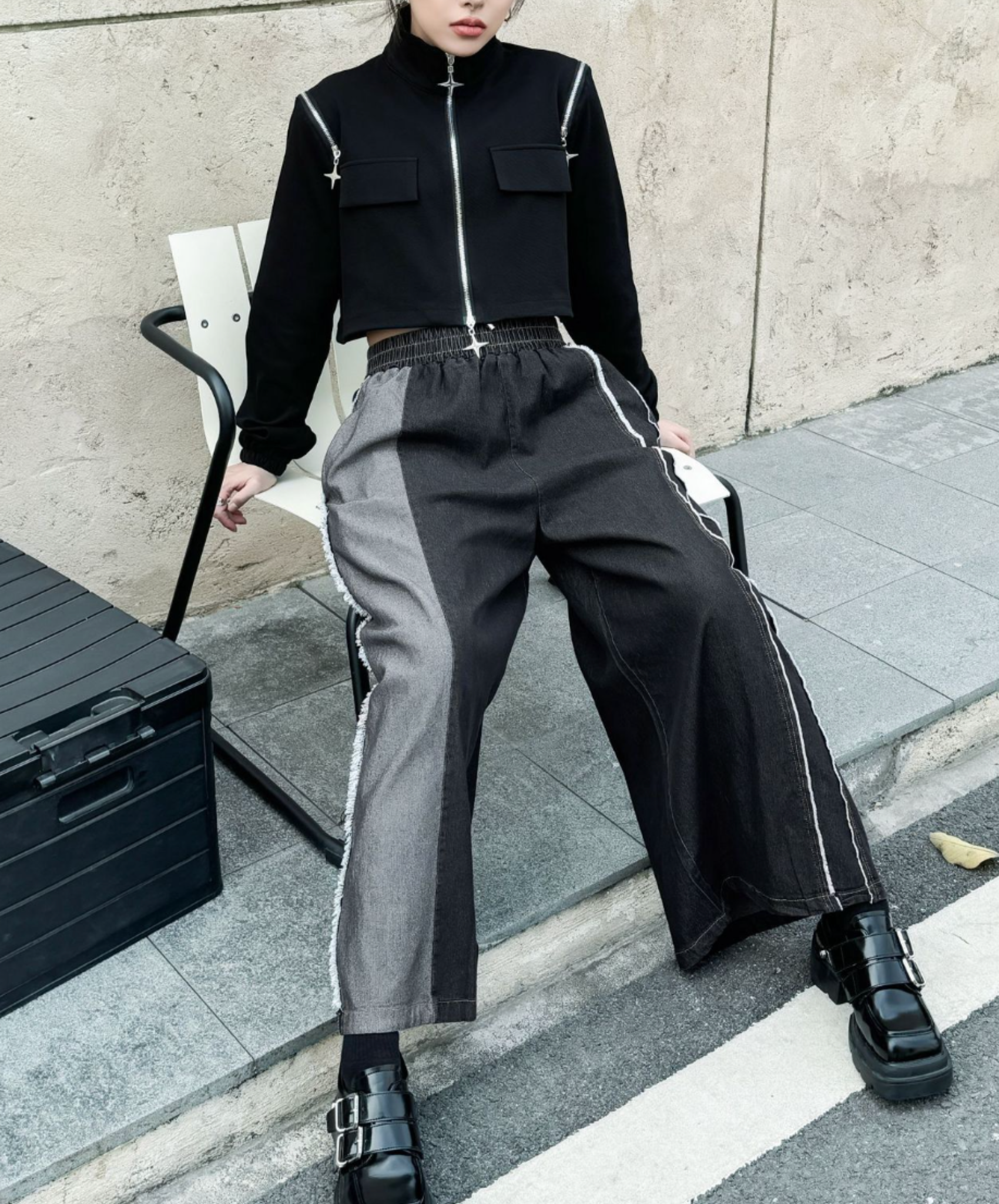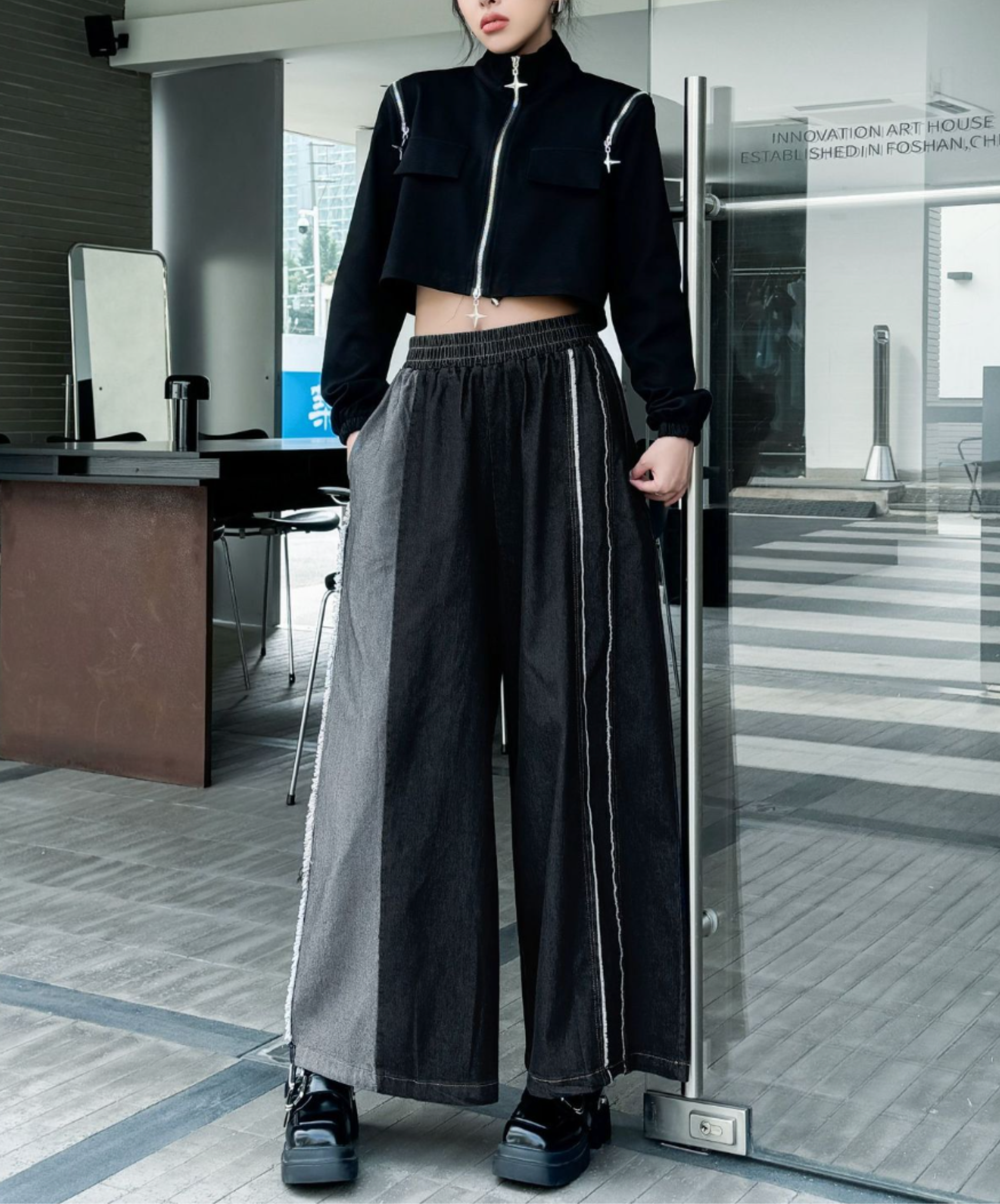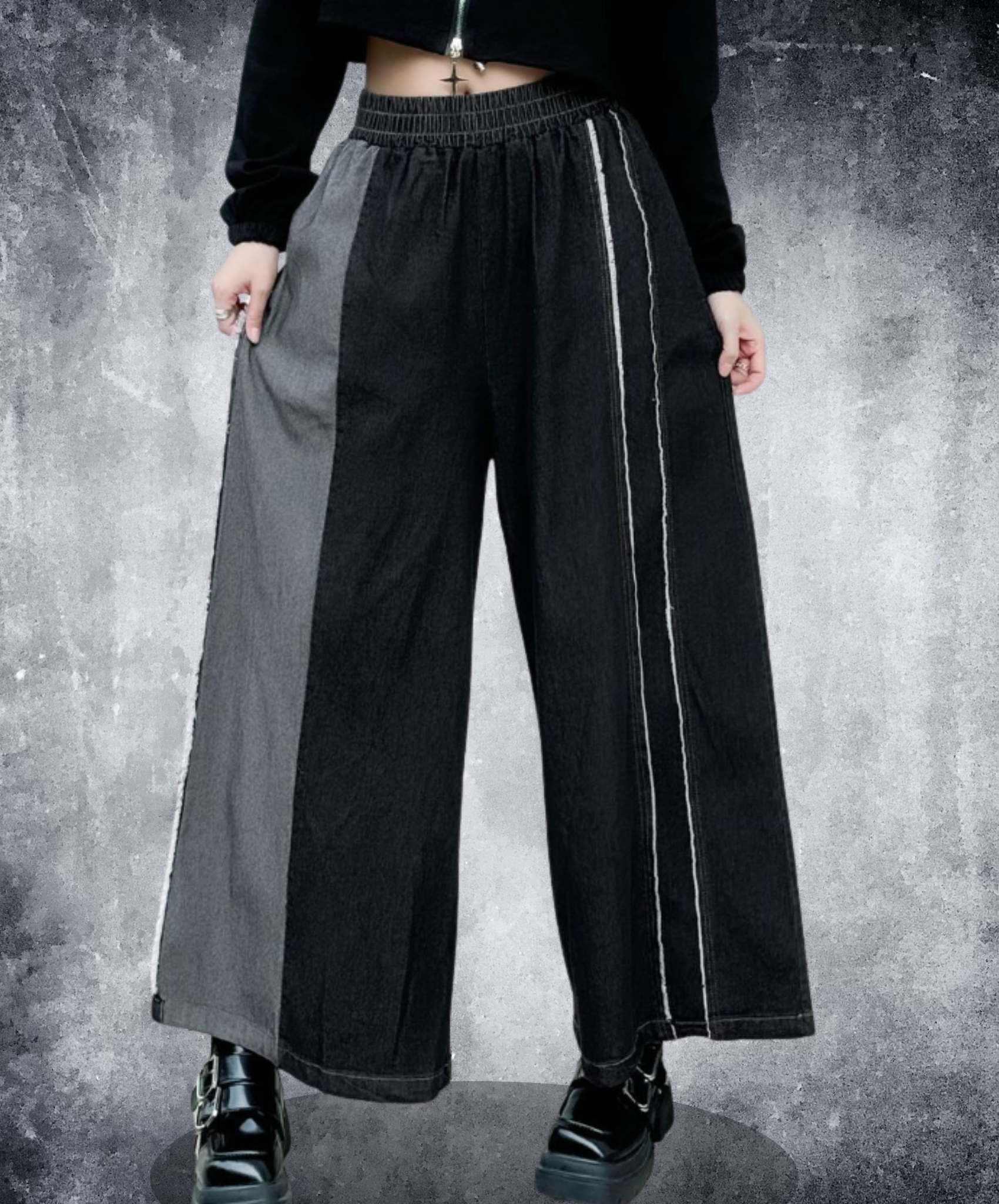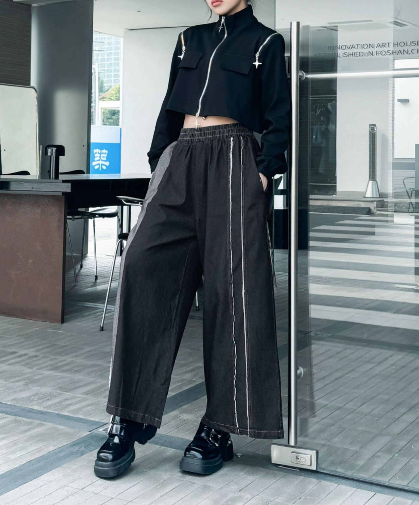 ・Wのホワイトラインとフリンジラインのカジュアルワイドパンツ。