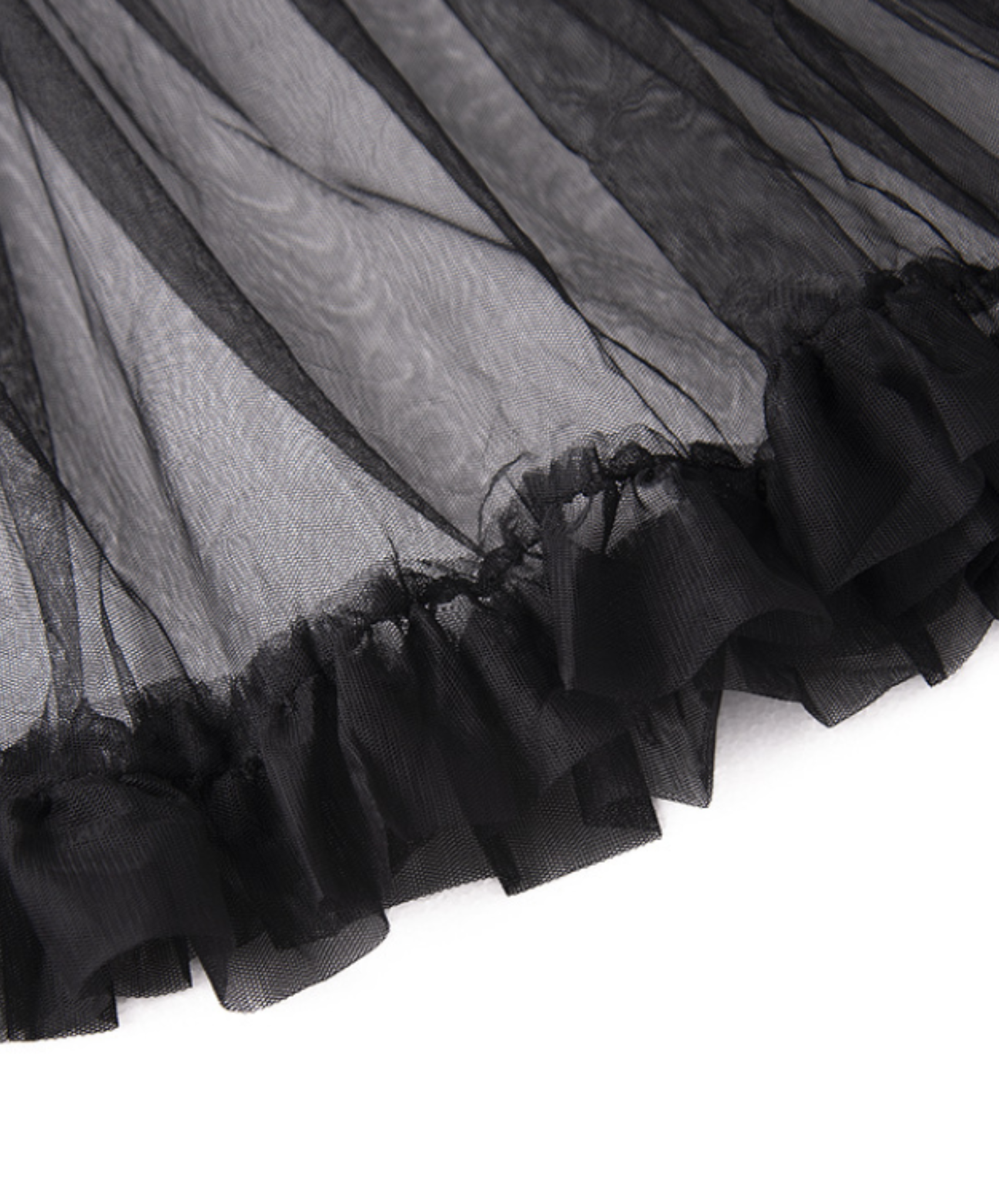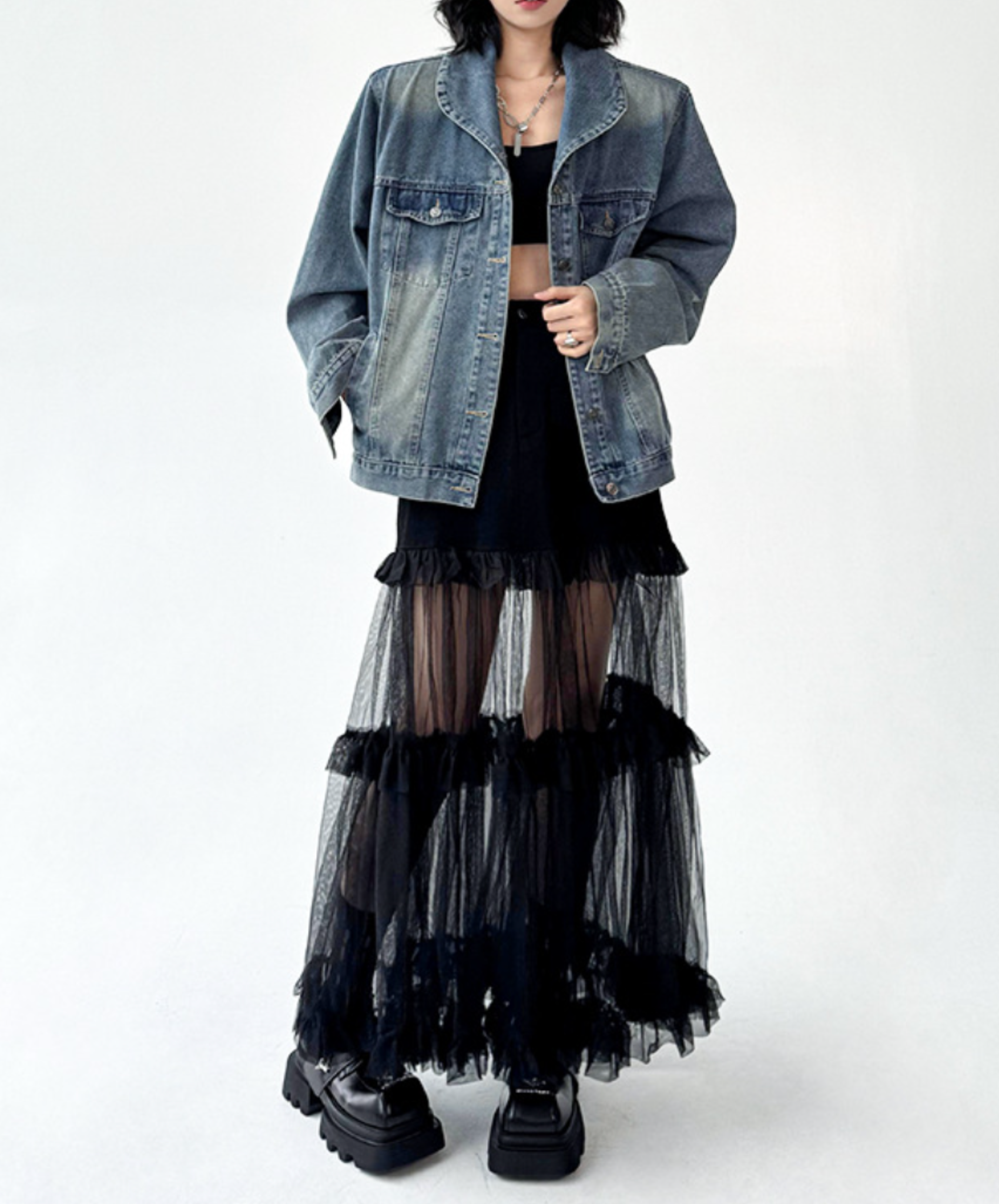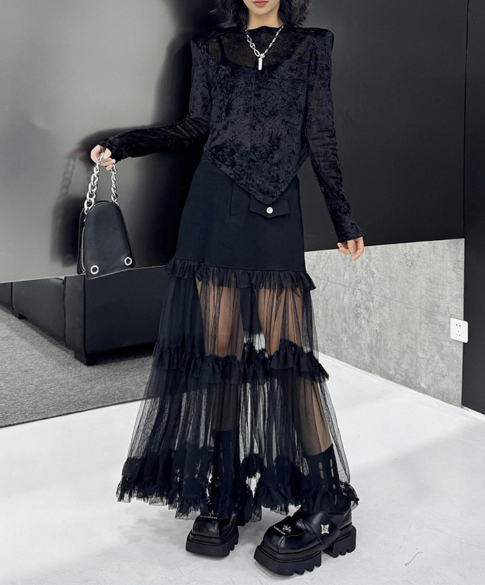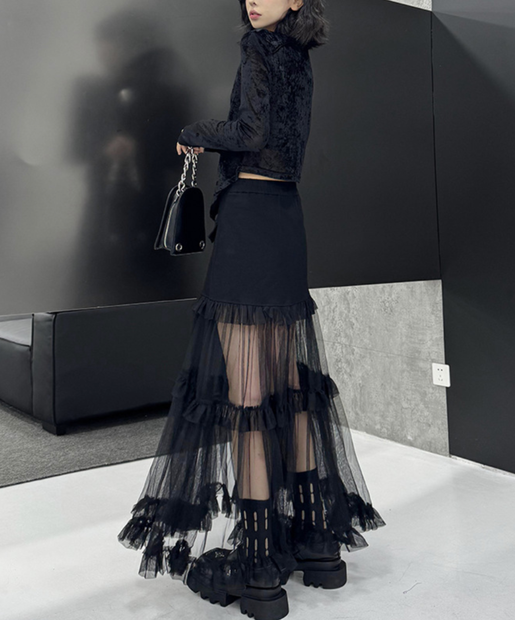 ・チュール素材を使用し、シアー感を楽しめるロングスカート。