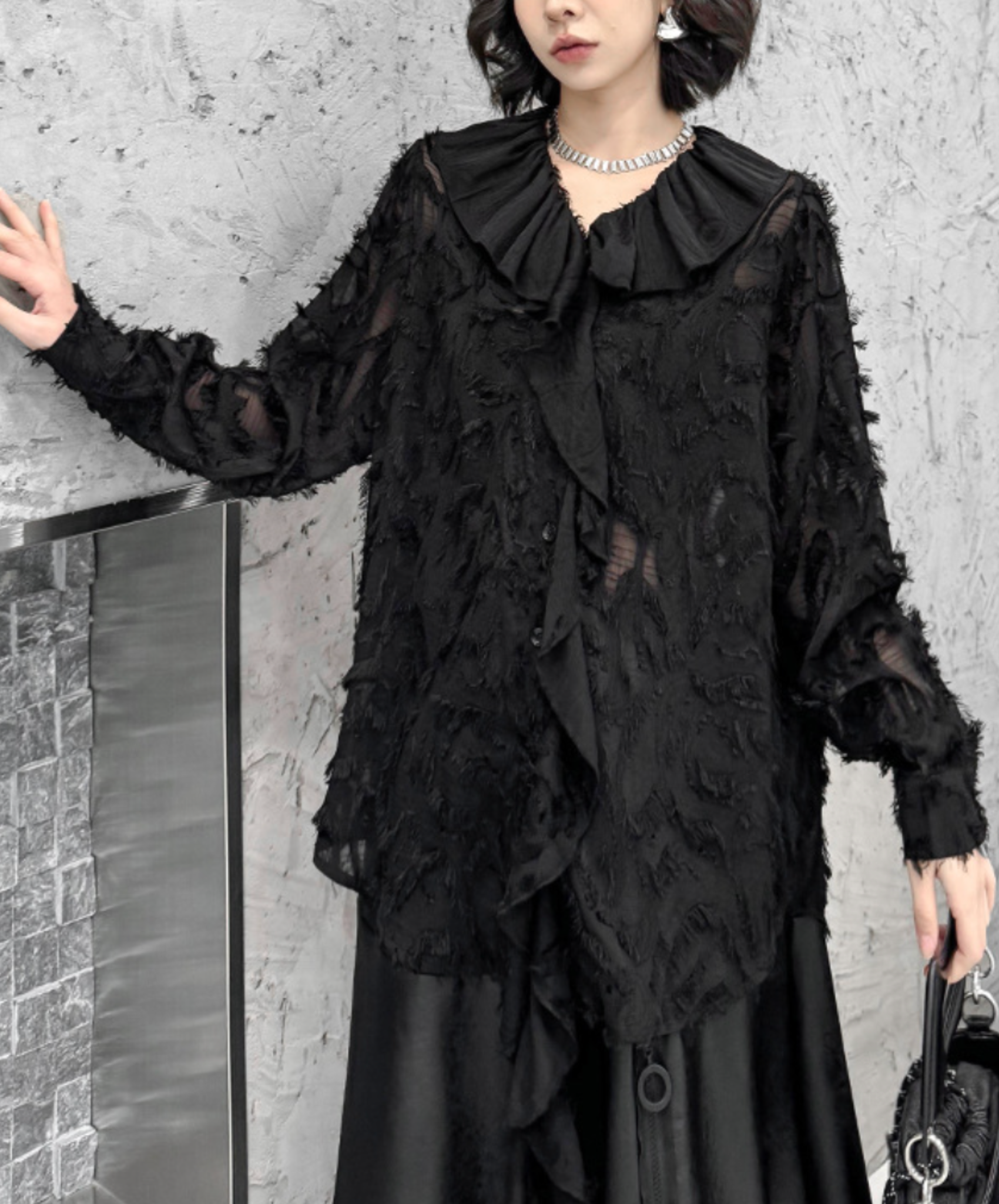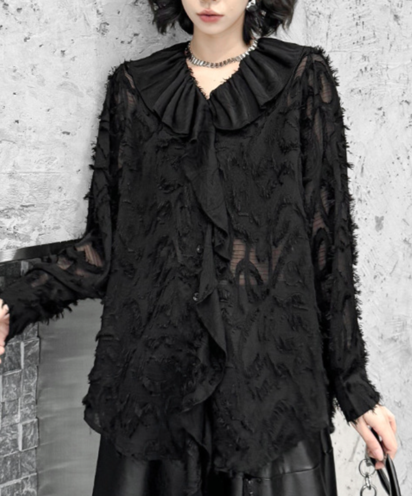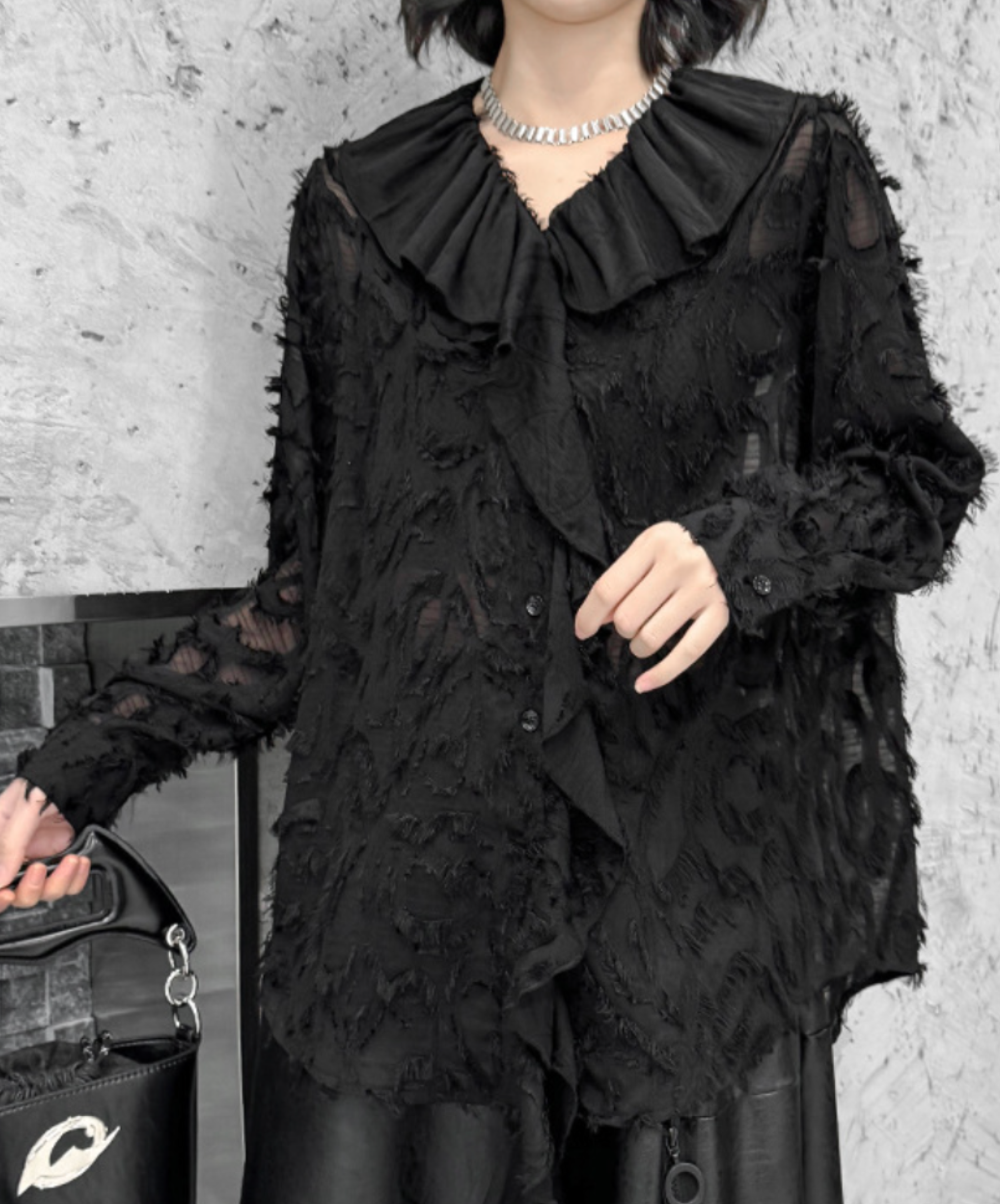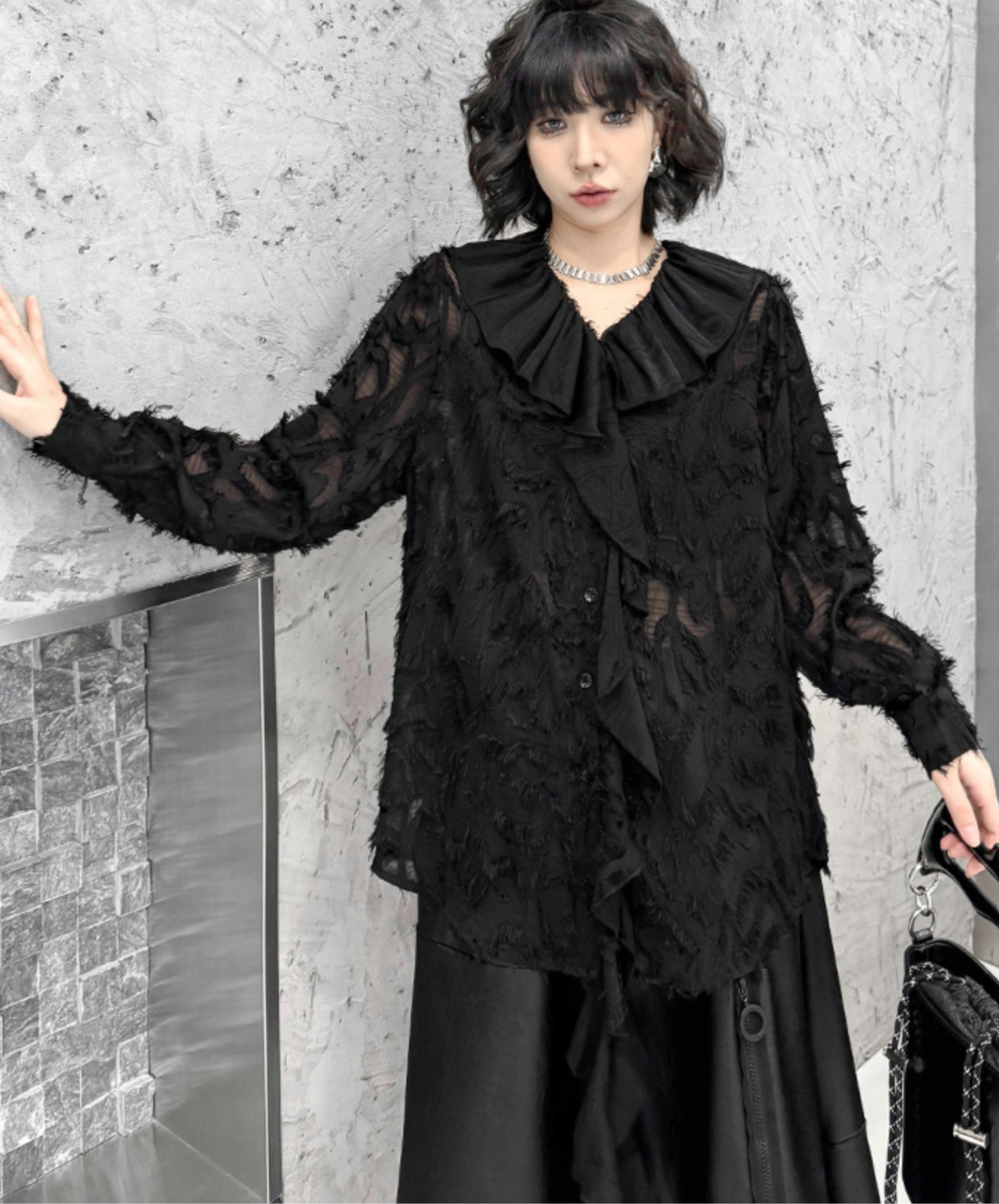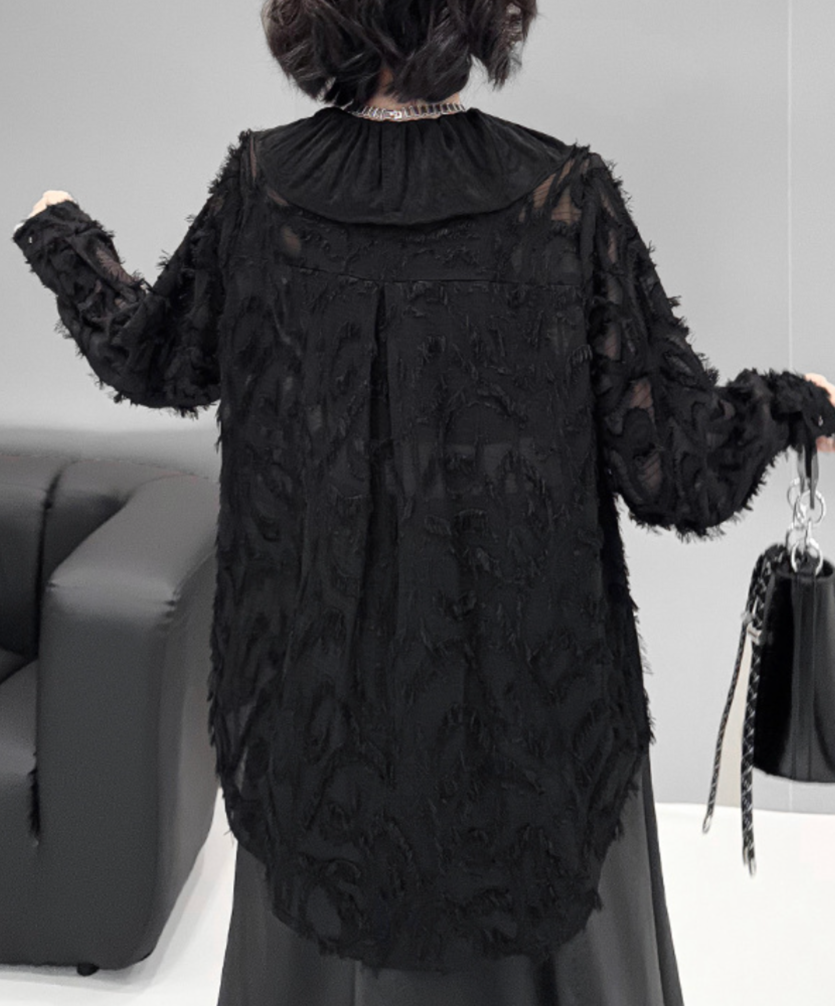 ・程よい透け感のフリンジレースを使用したシアーシャツ。