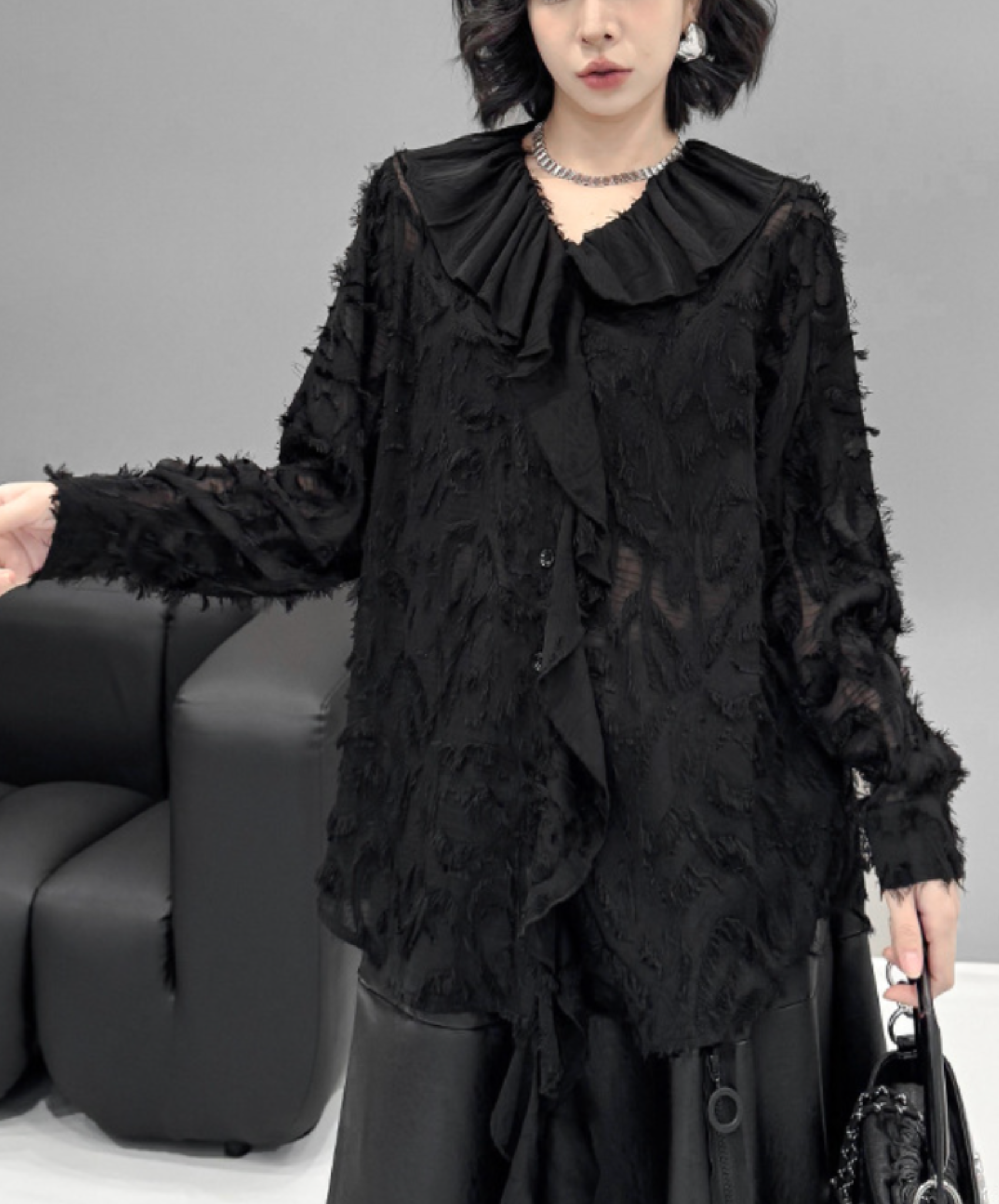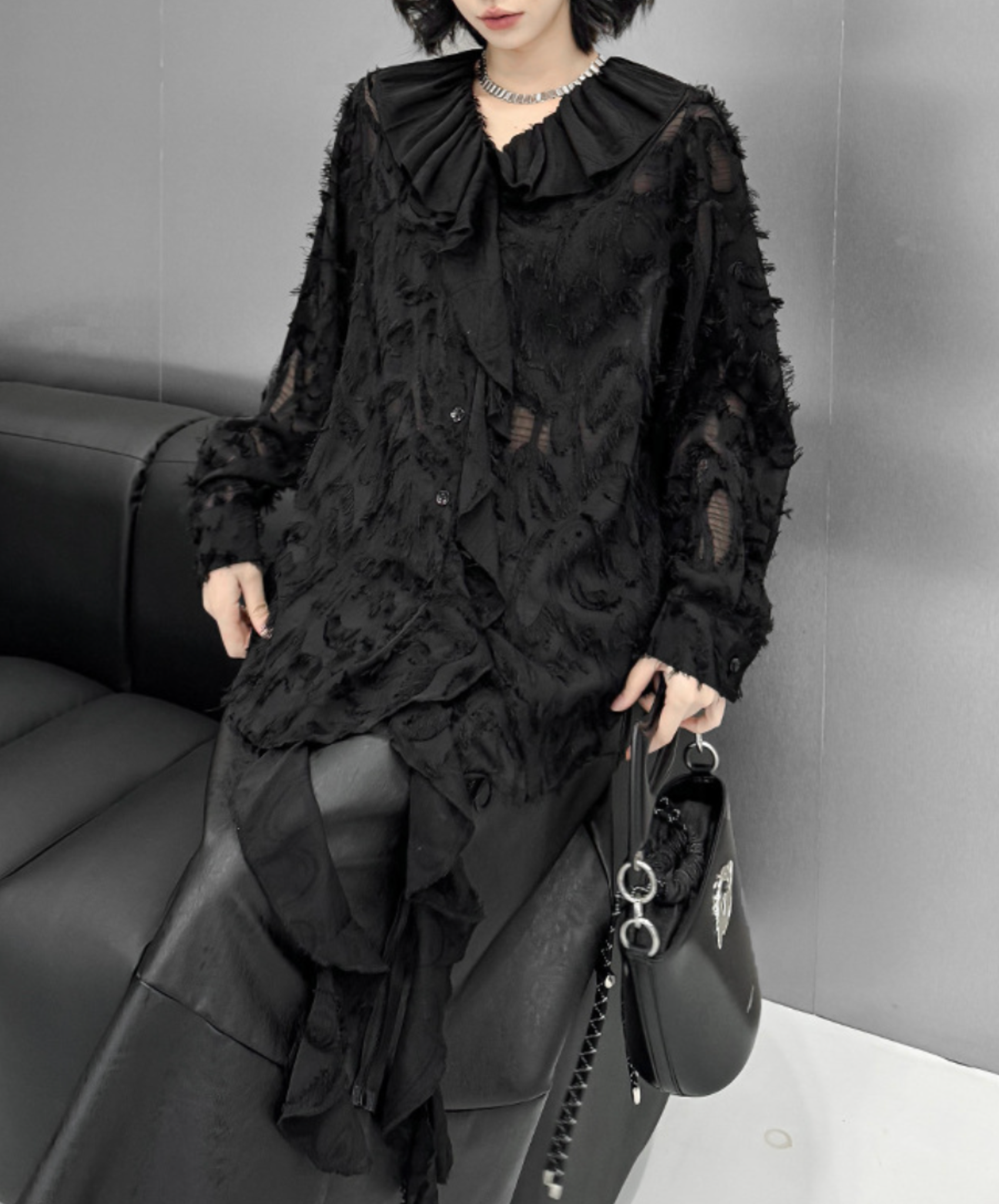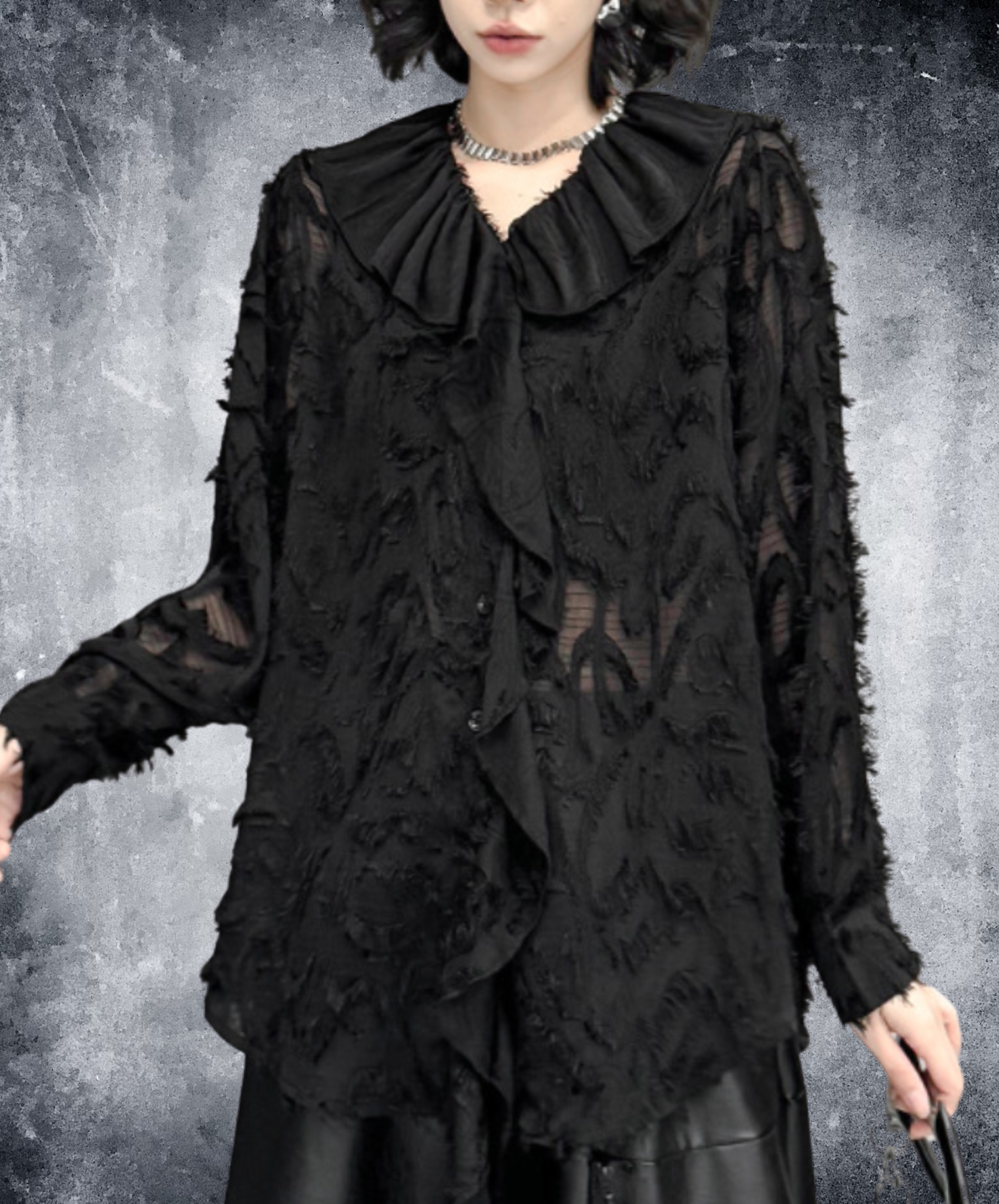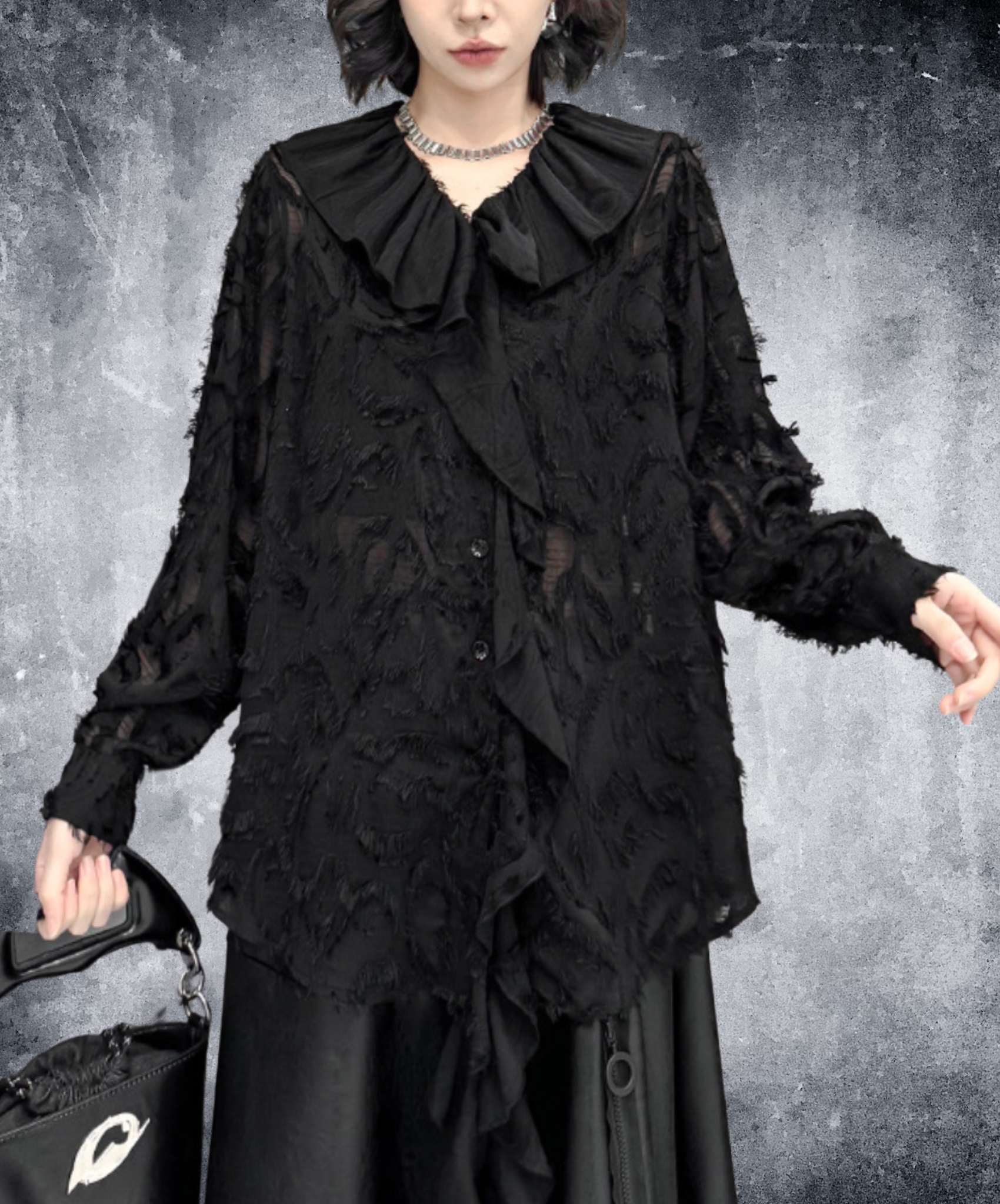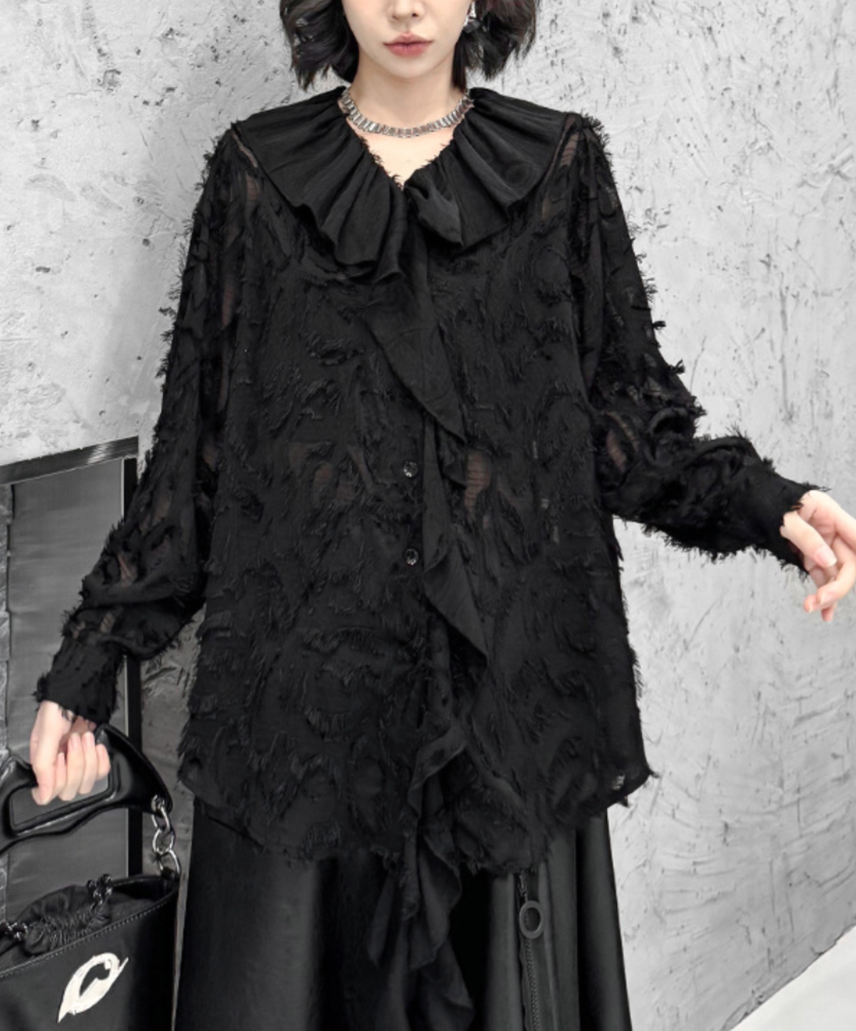 ・程よい透け感のフリンジレースを使用したシアーシャツ。
