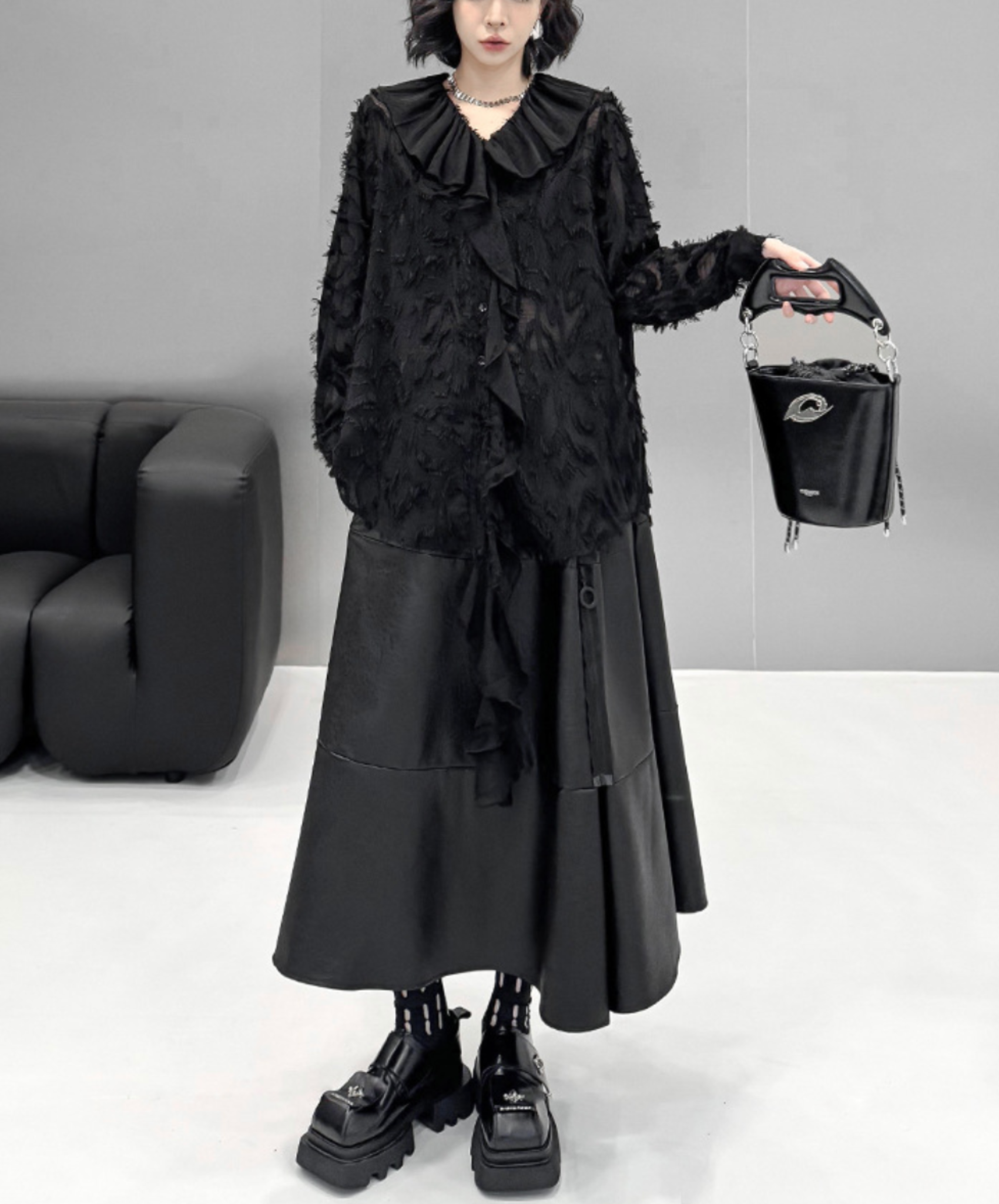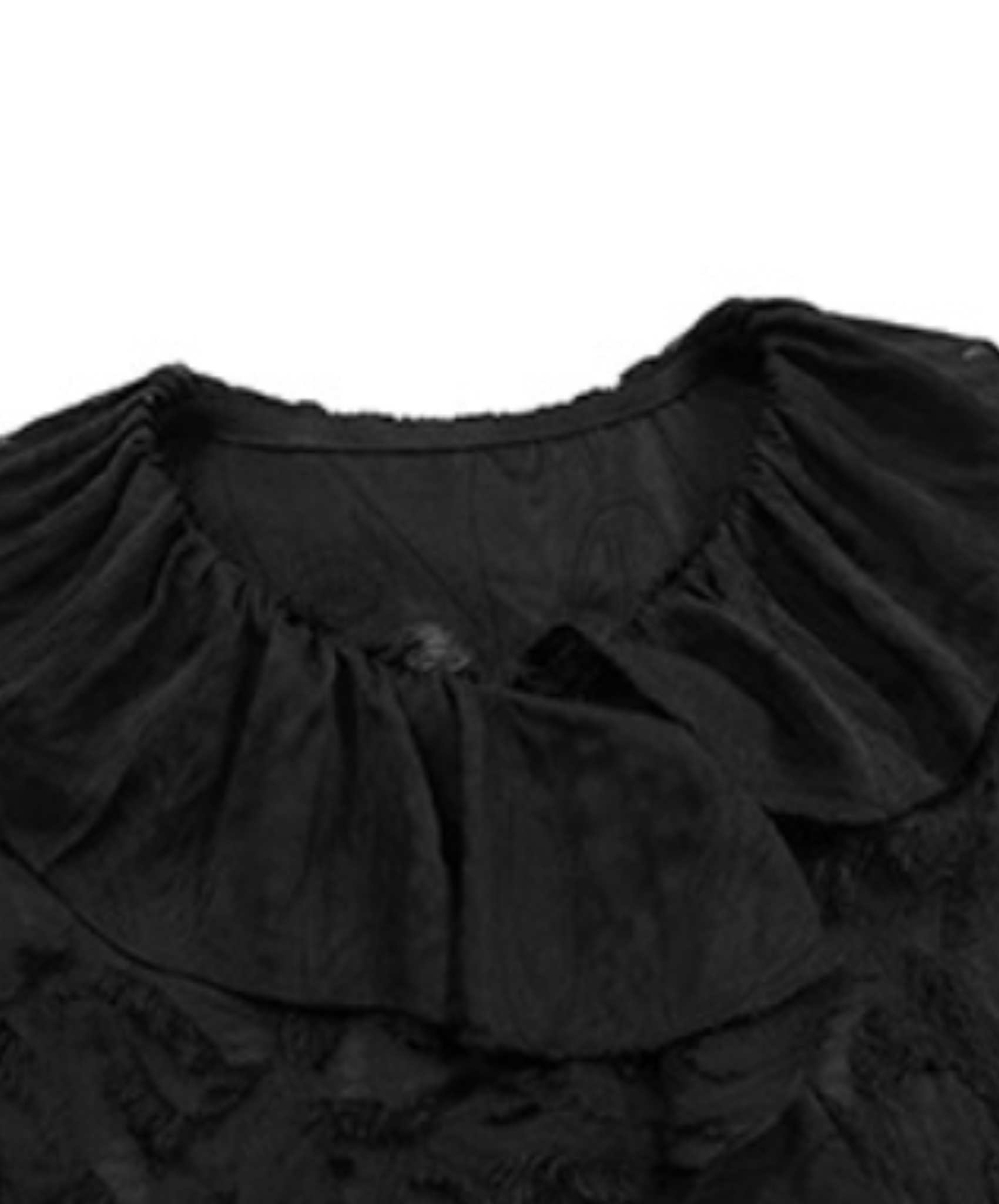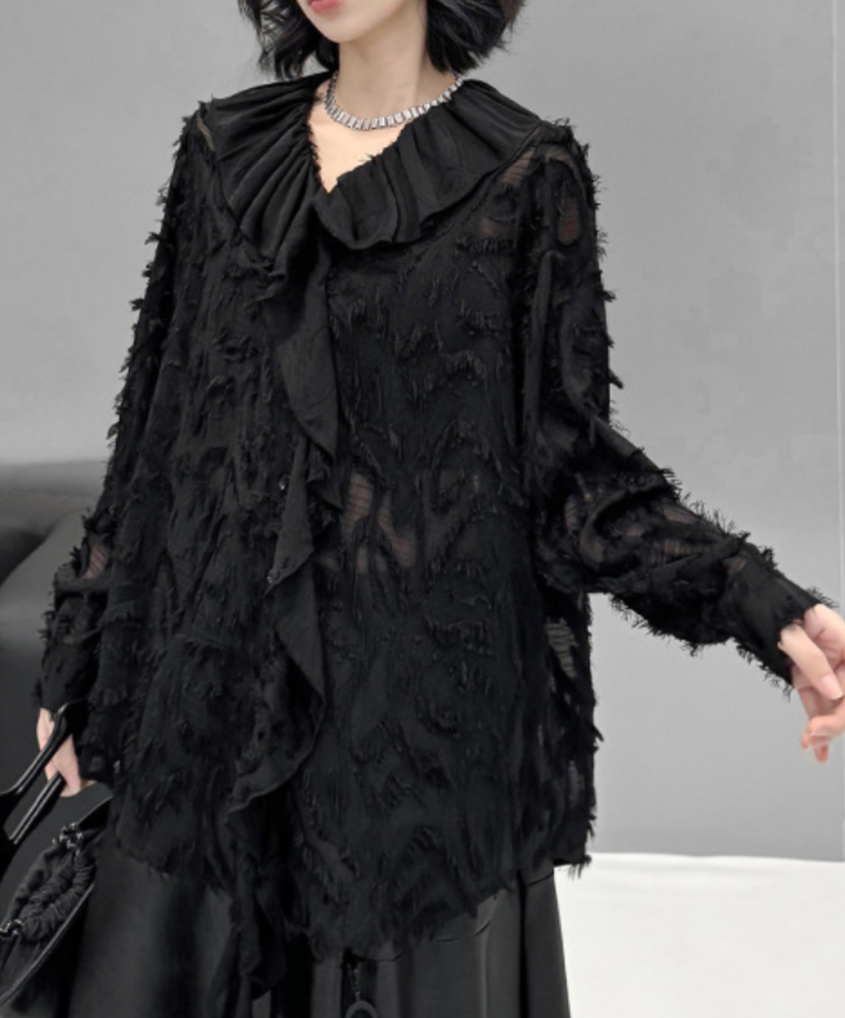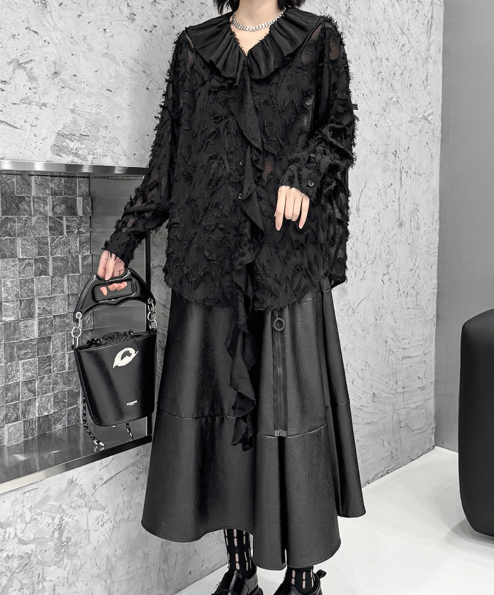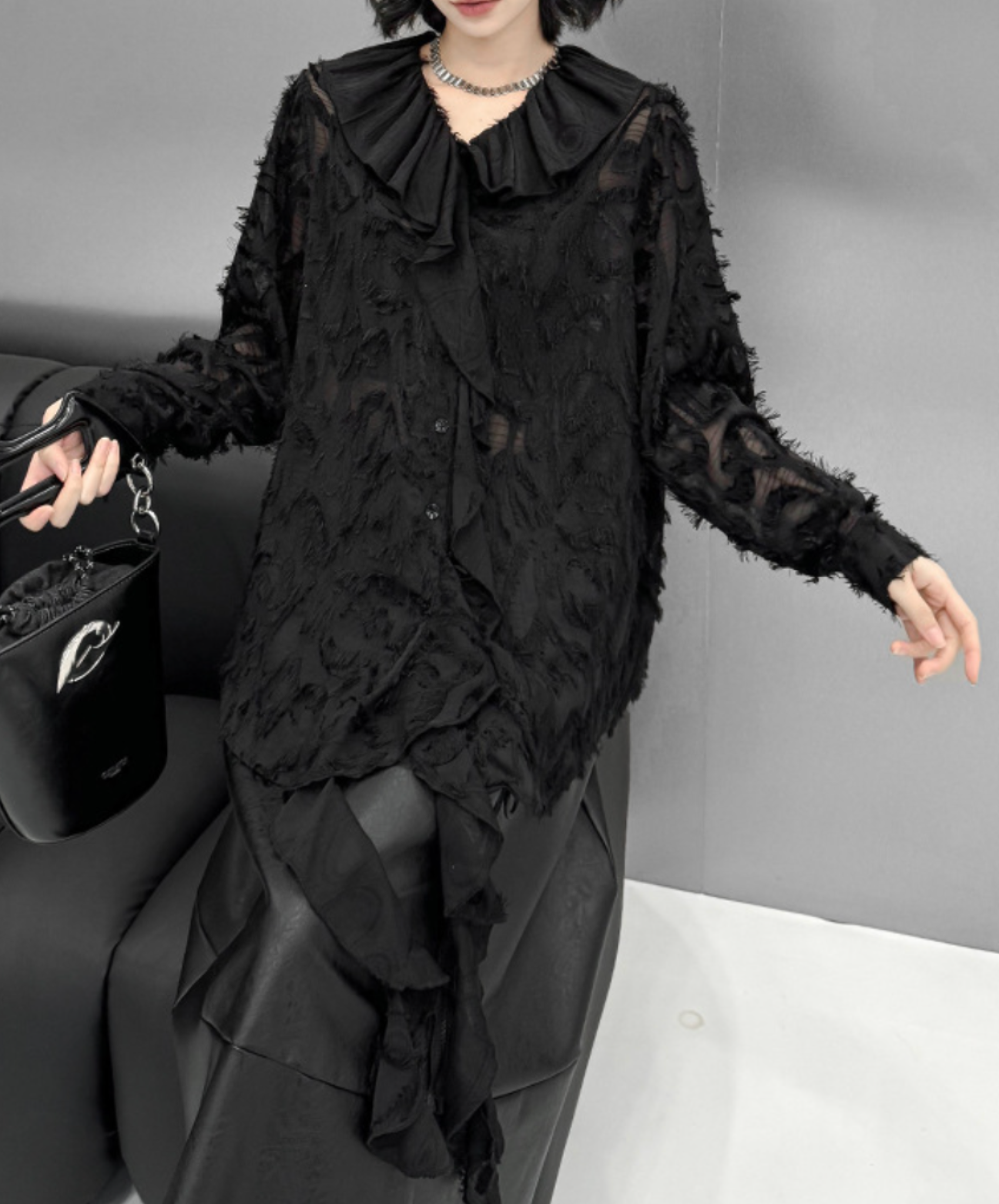 ・程よい透け感のフリンジレースを使用したシアーシャツ。