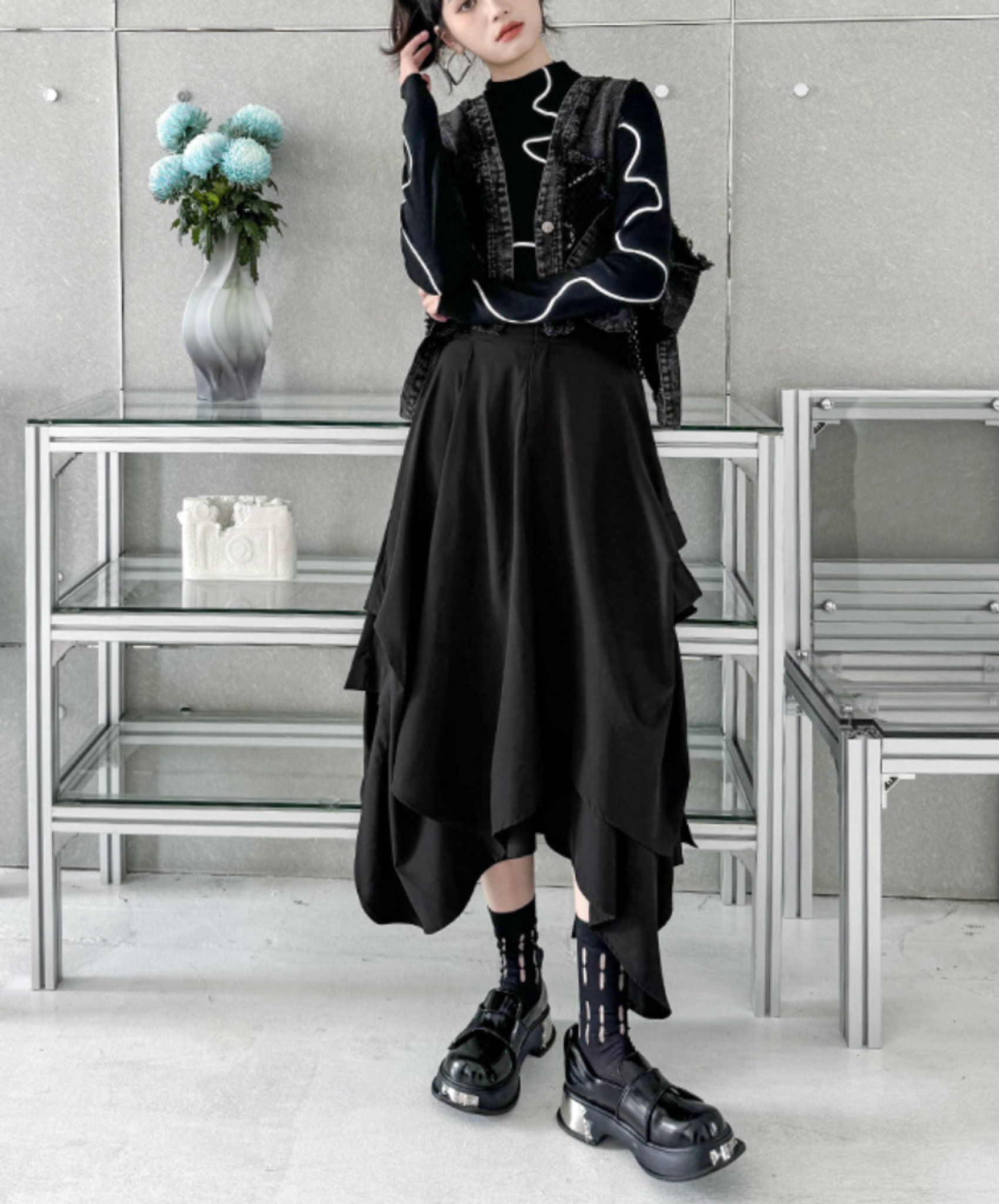 ・左右非対称のドレープ感が美しいロングスカート。