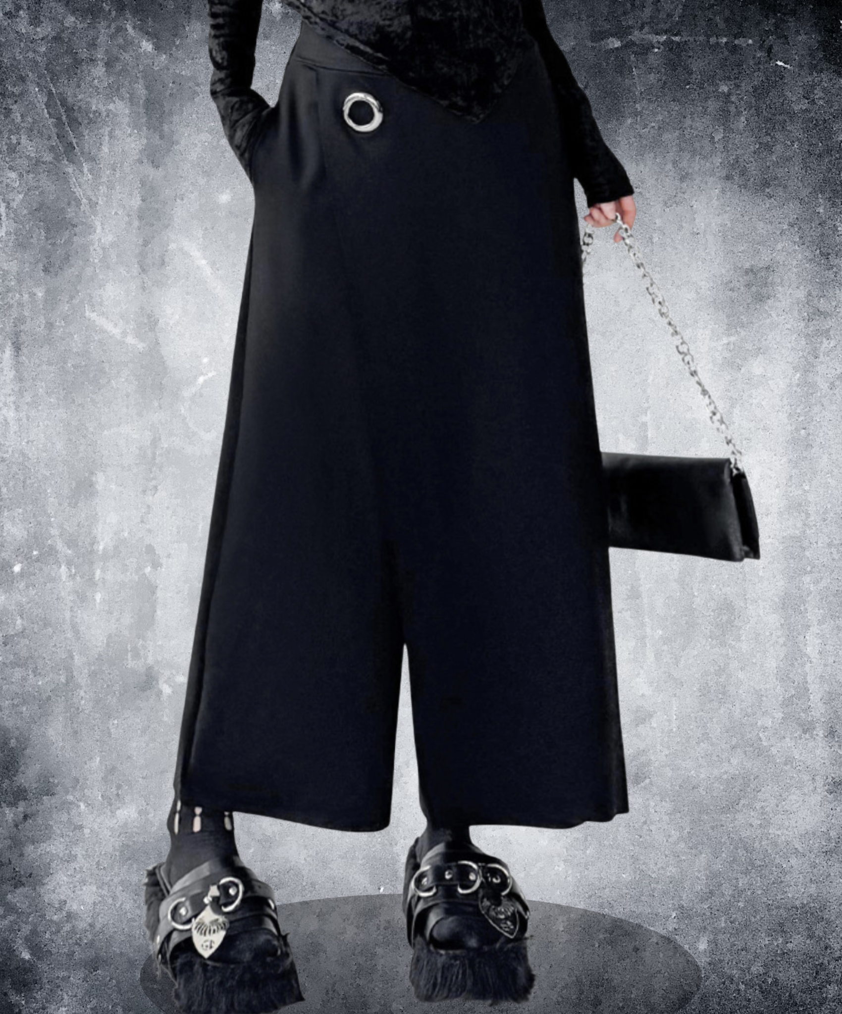 ・漆黒の生地に映えるシルバーリングが魅力的なワイドパンツ。