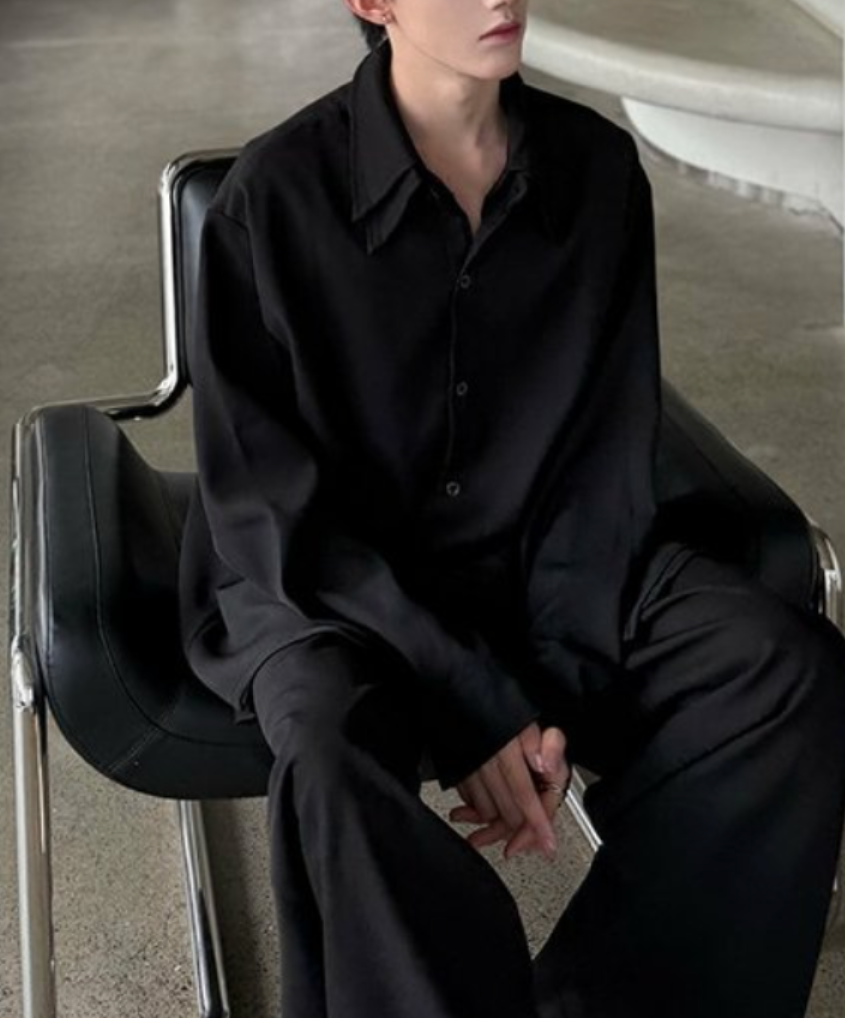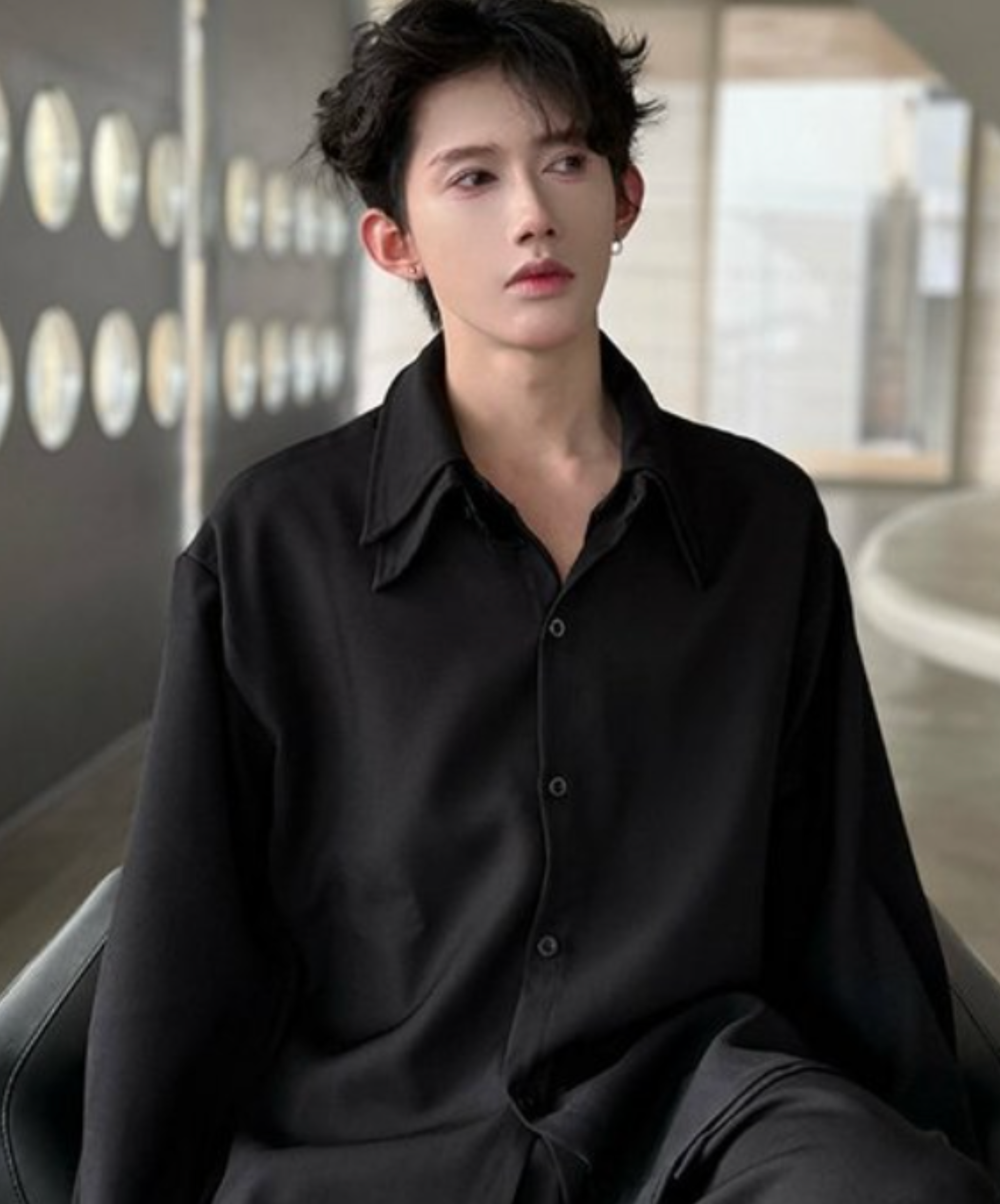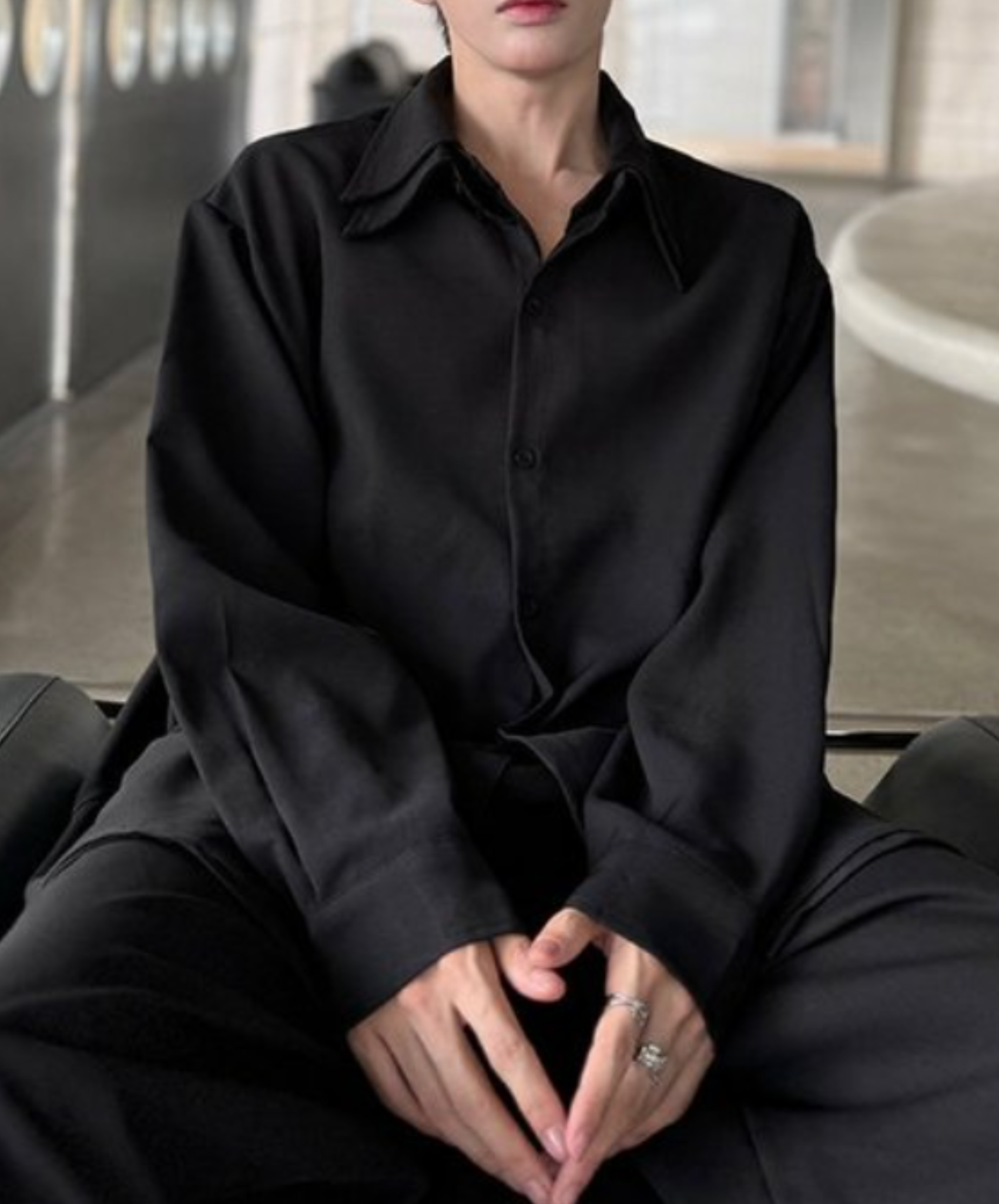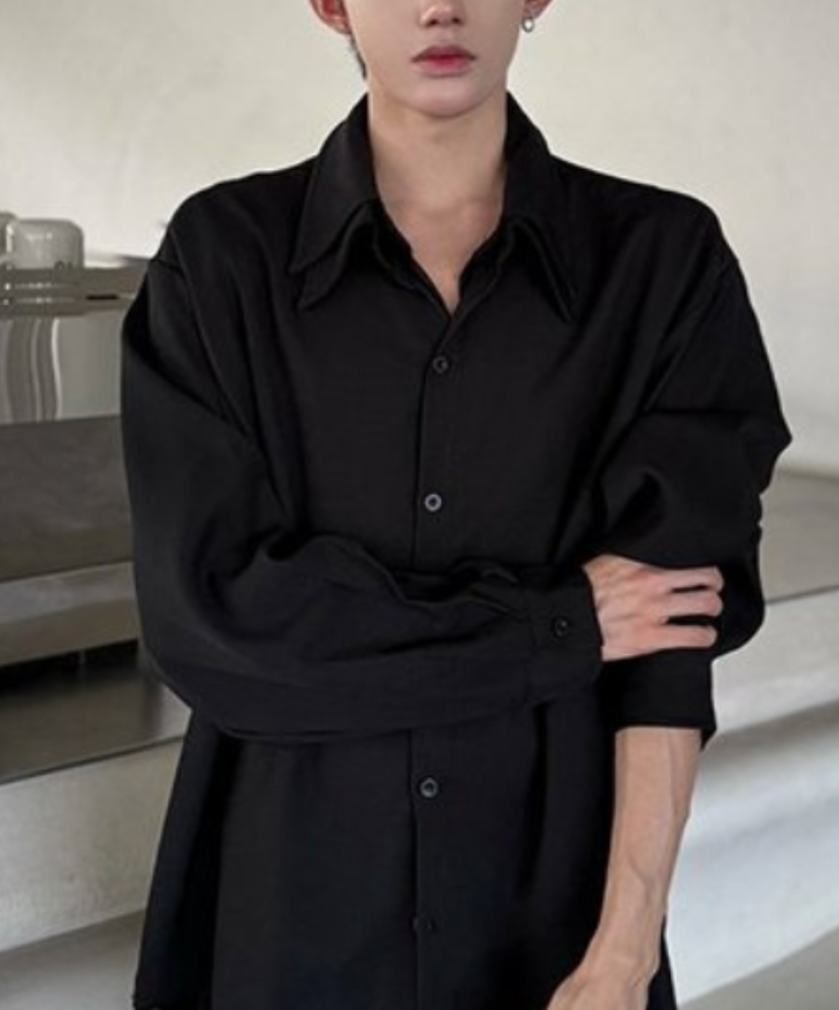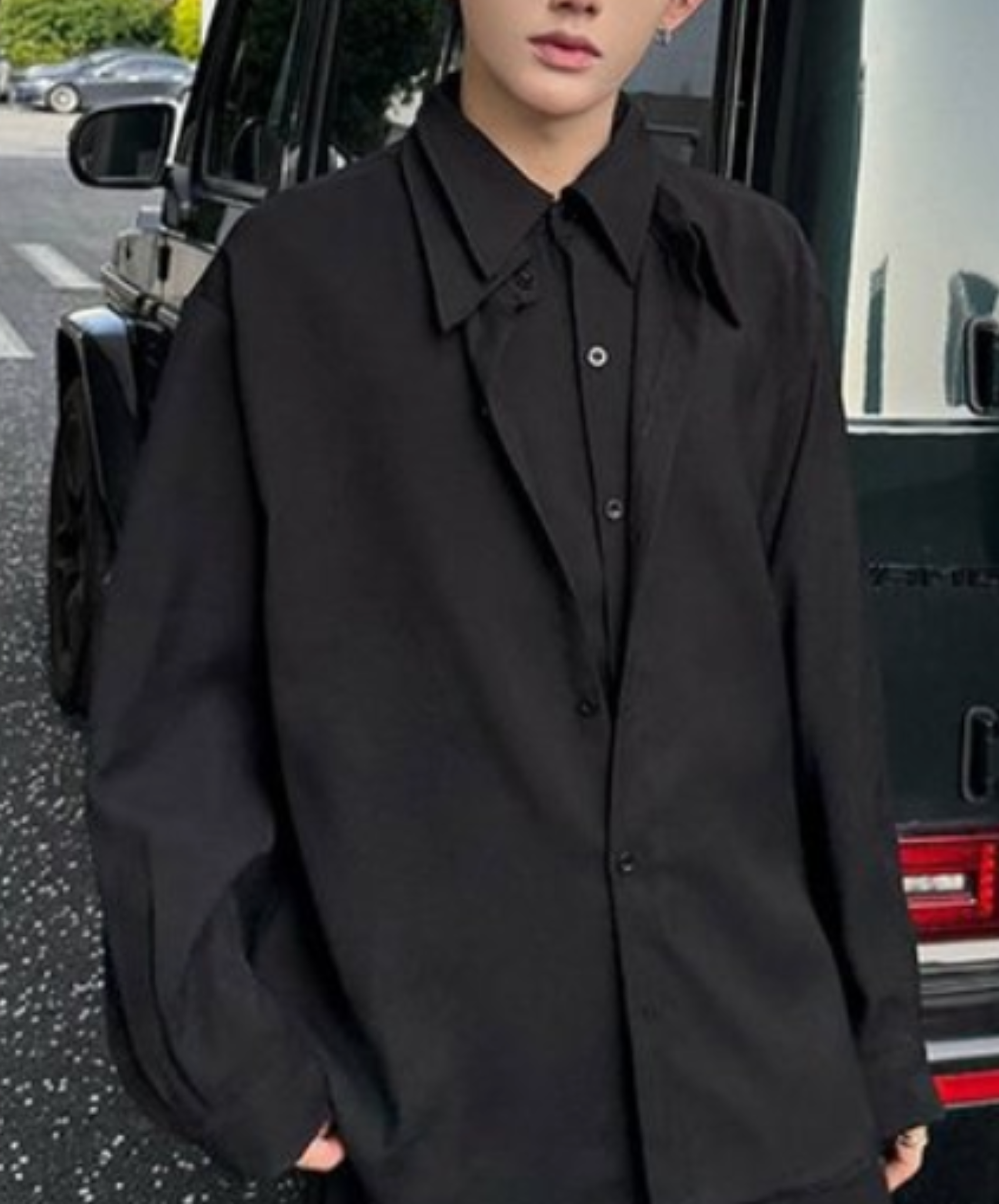 ・襟が重なるフェイクツーピースデザインの長袖シャツ。