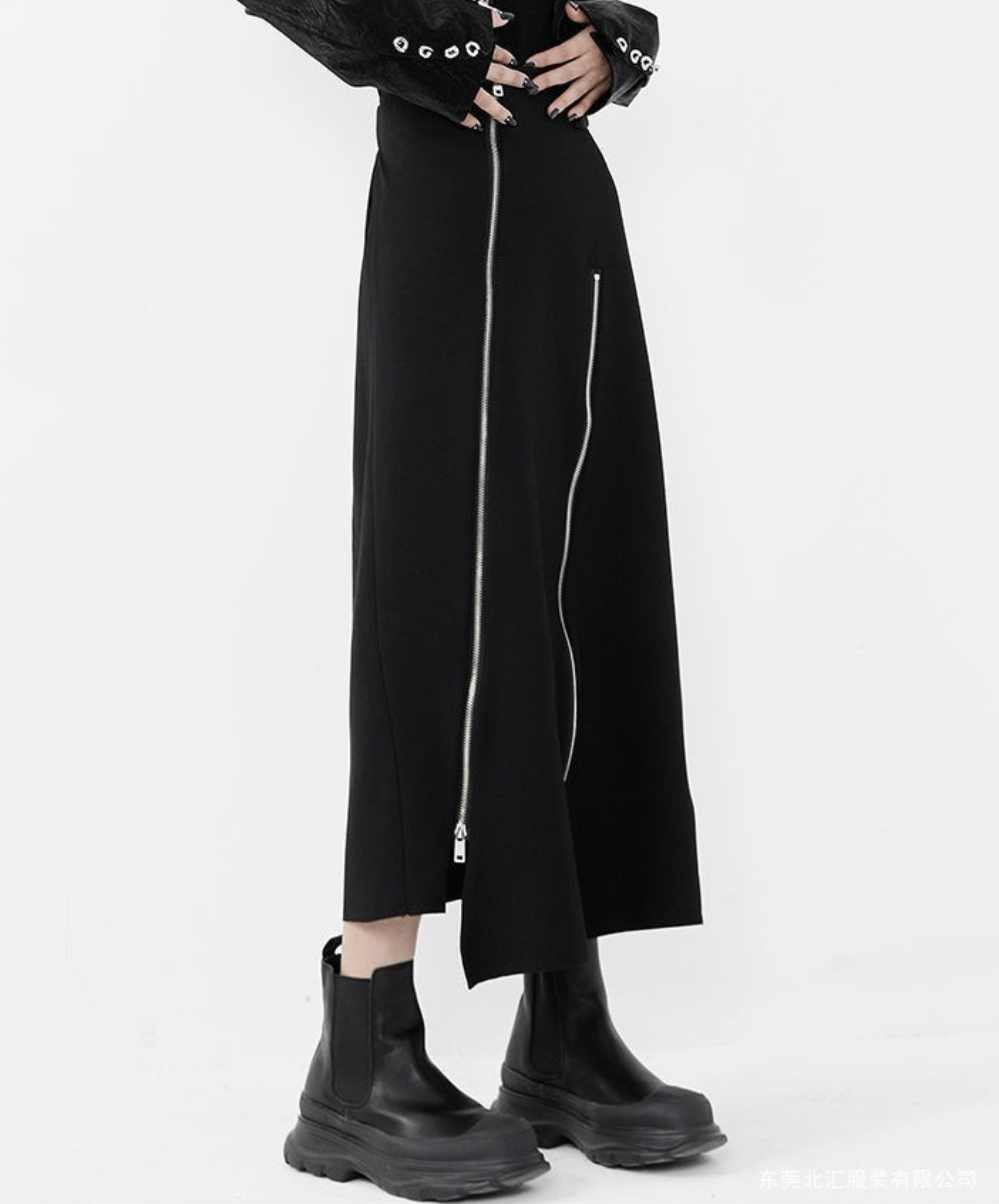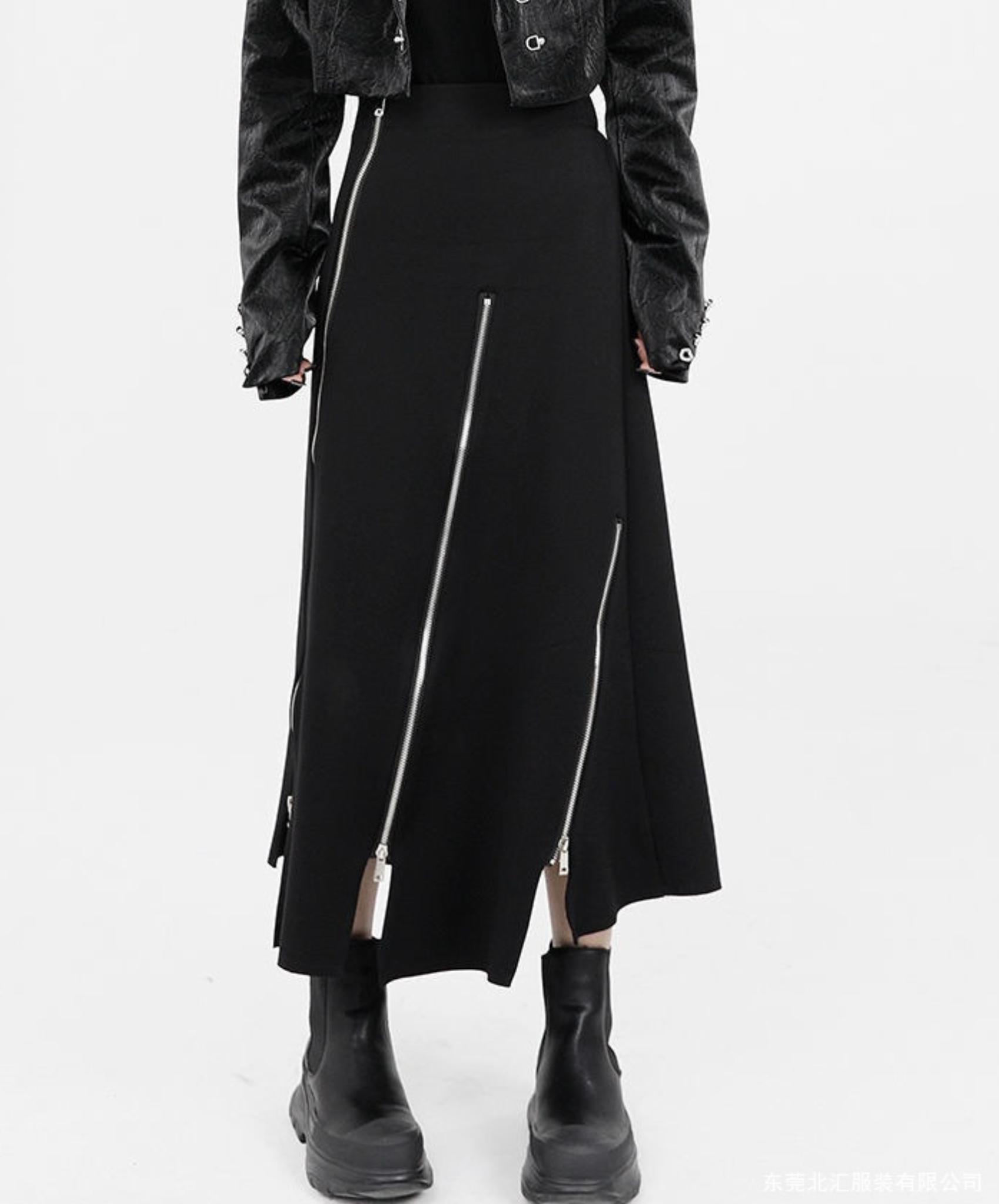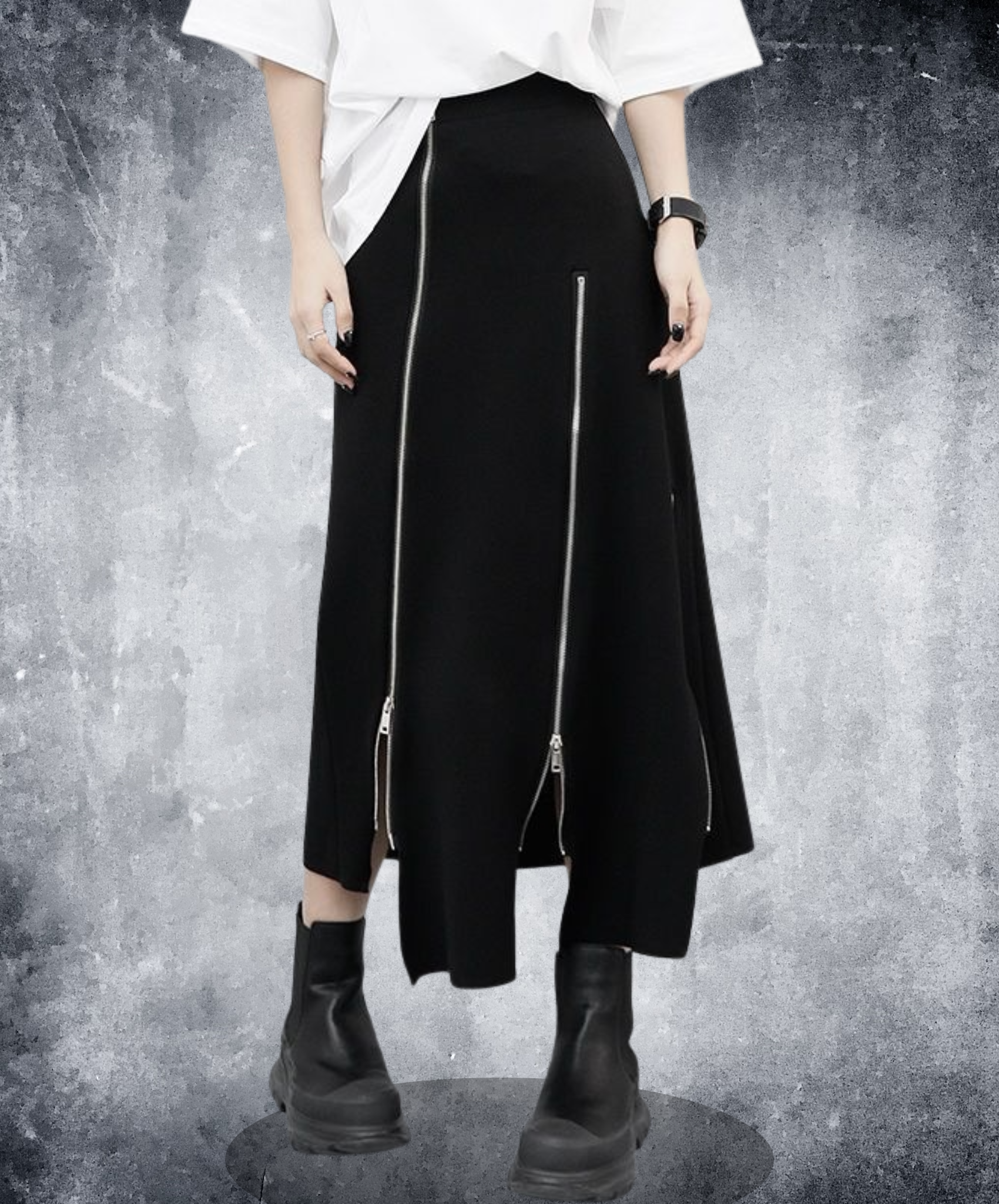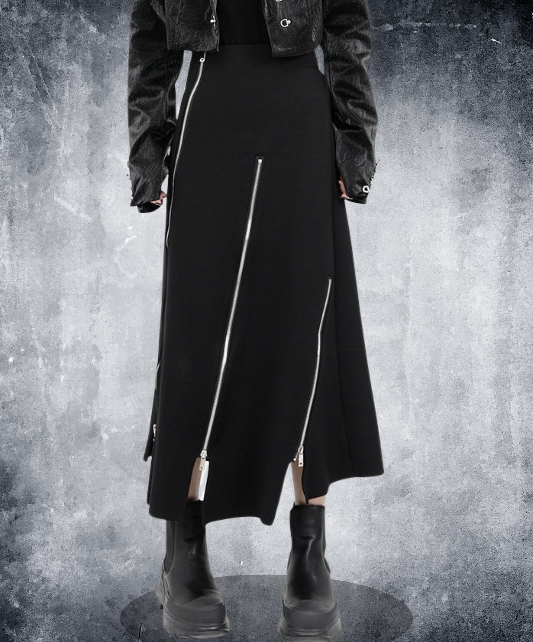 ・イレギュラーなカッティングとファスナー装飾が個性的なロングスカート。