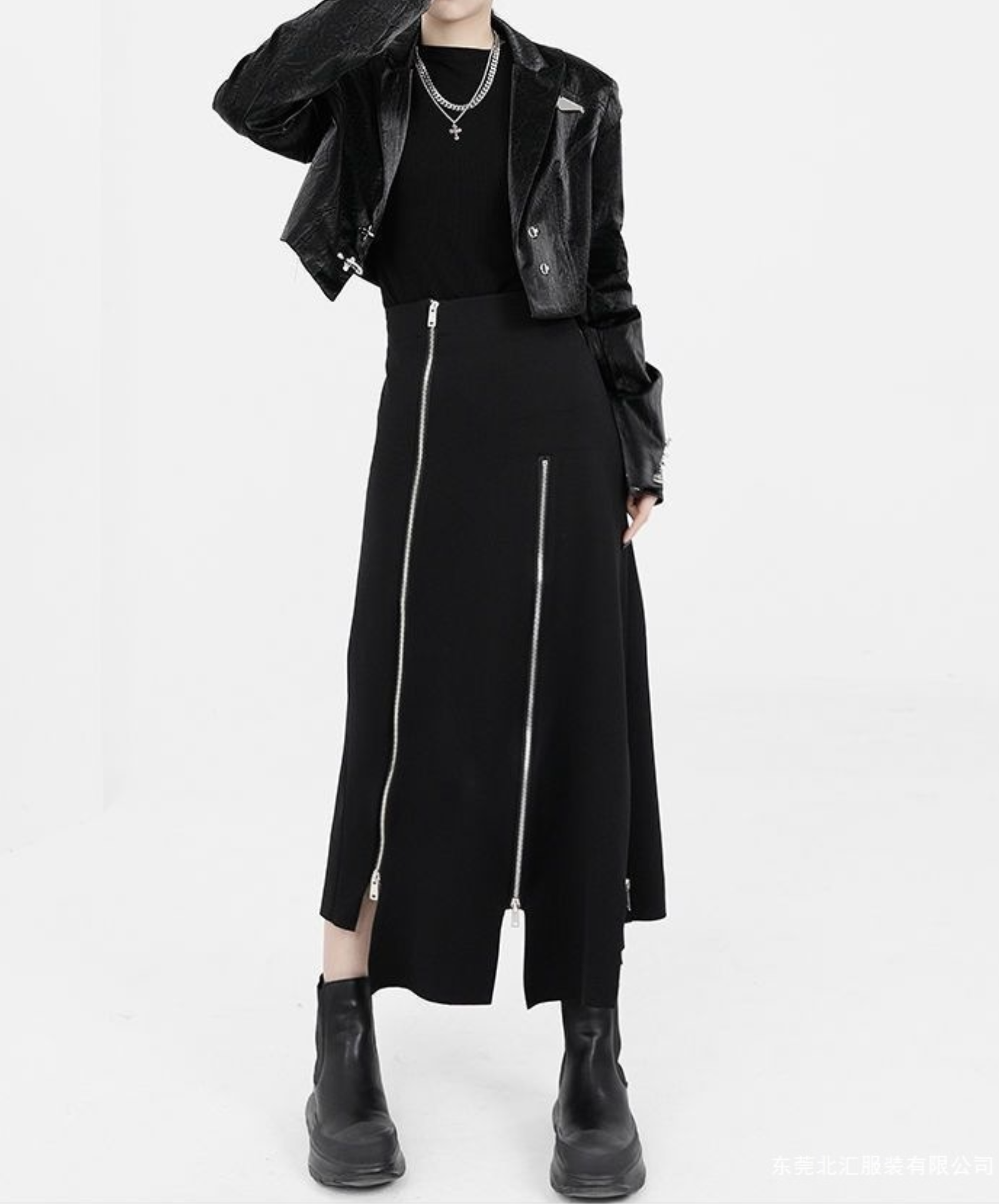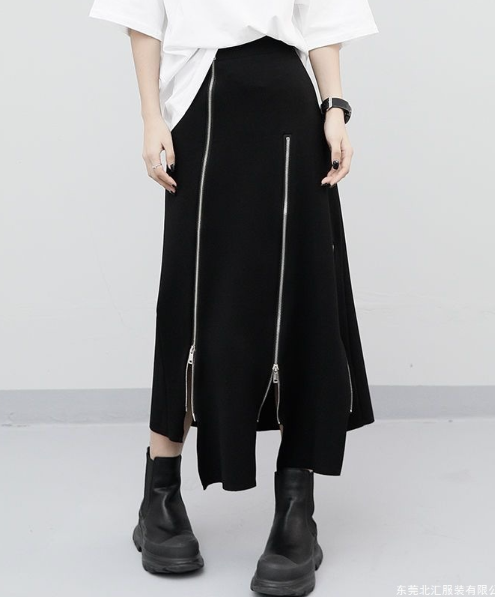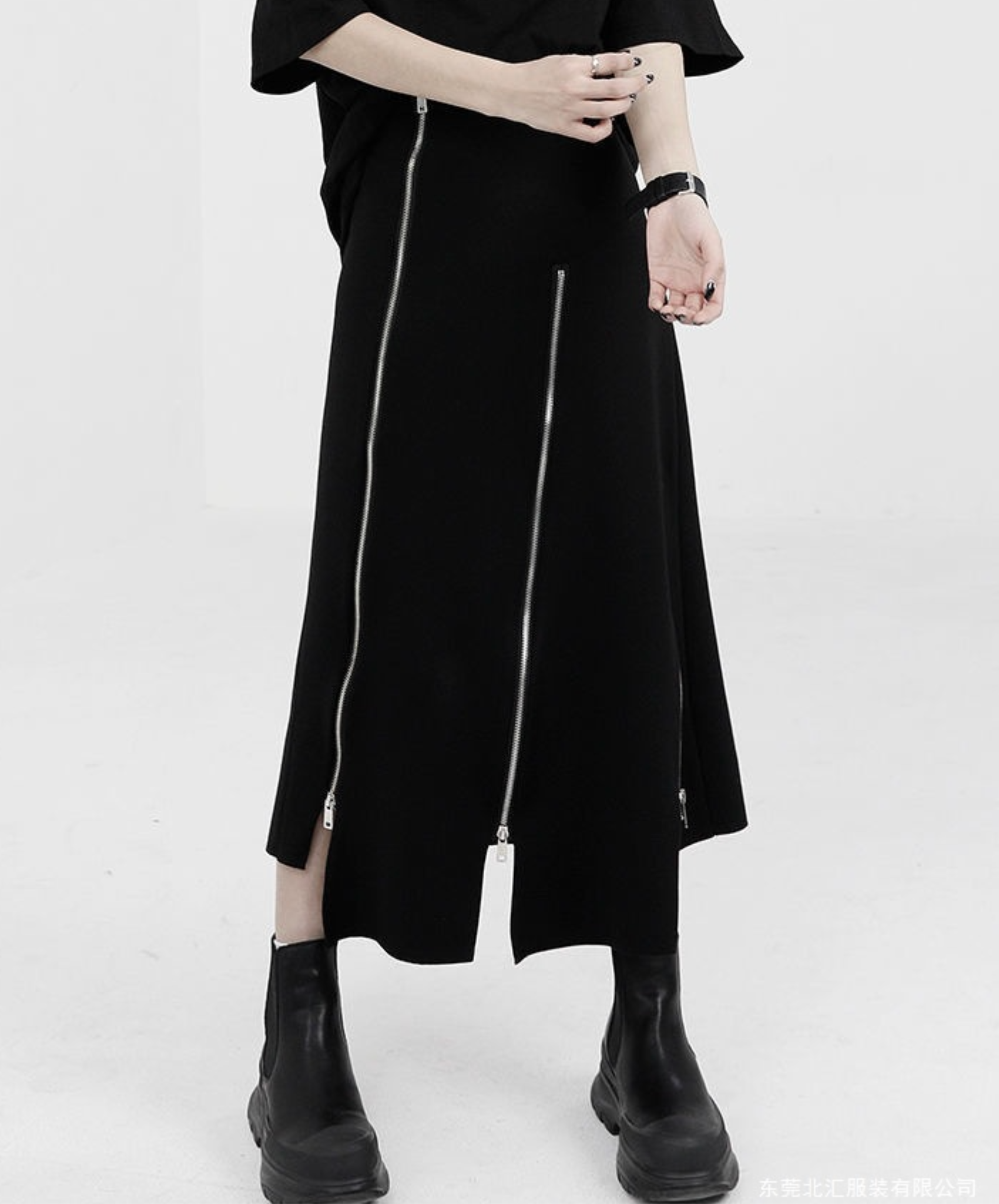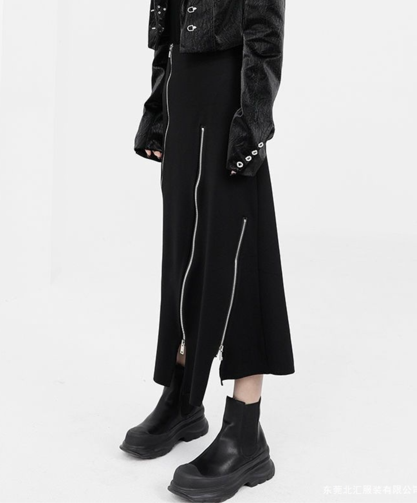 ・イレギュラーなカッティングとファスナー装飾が個性的なロングスカート。