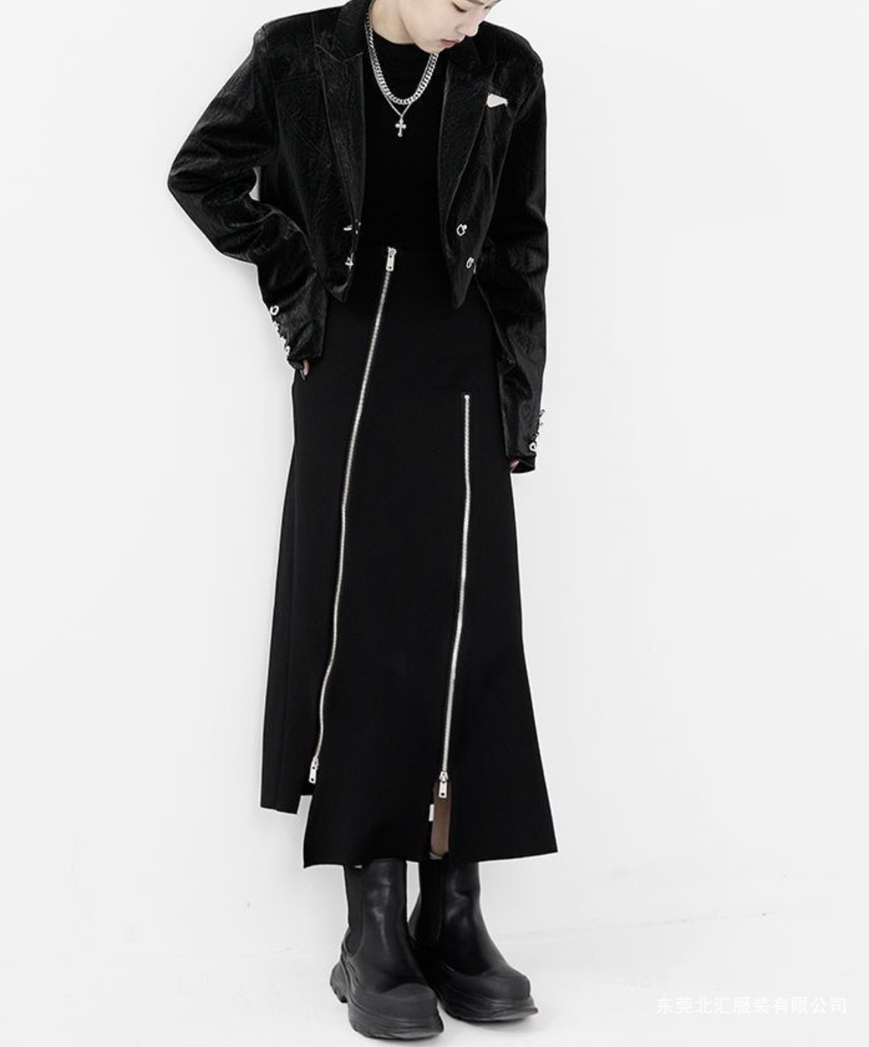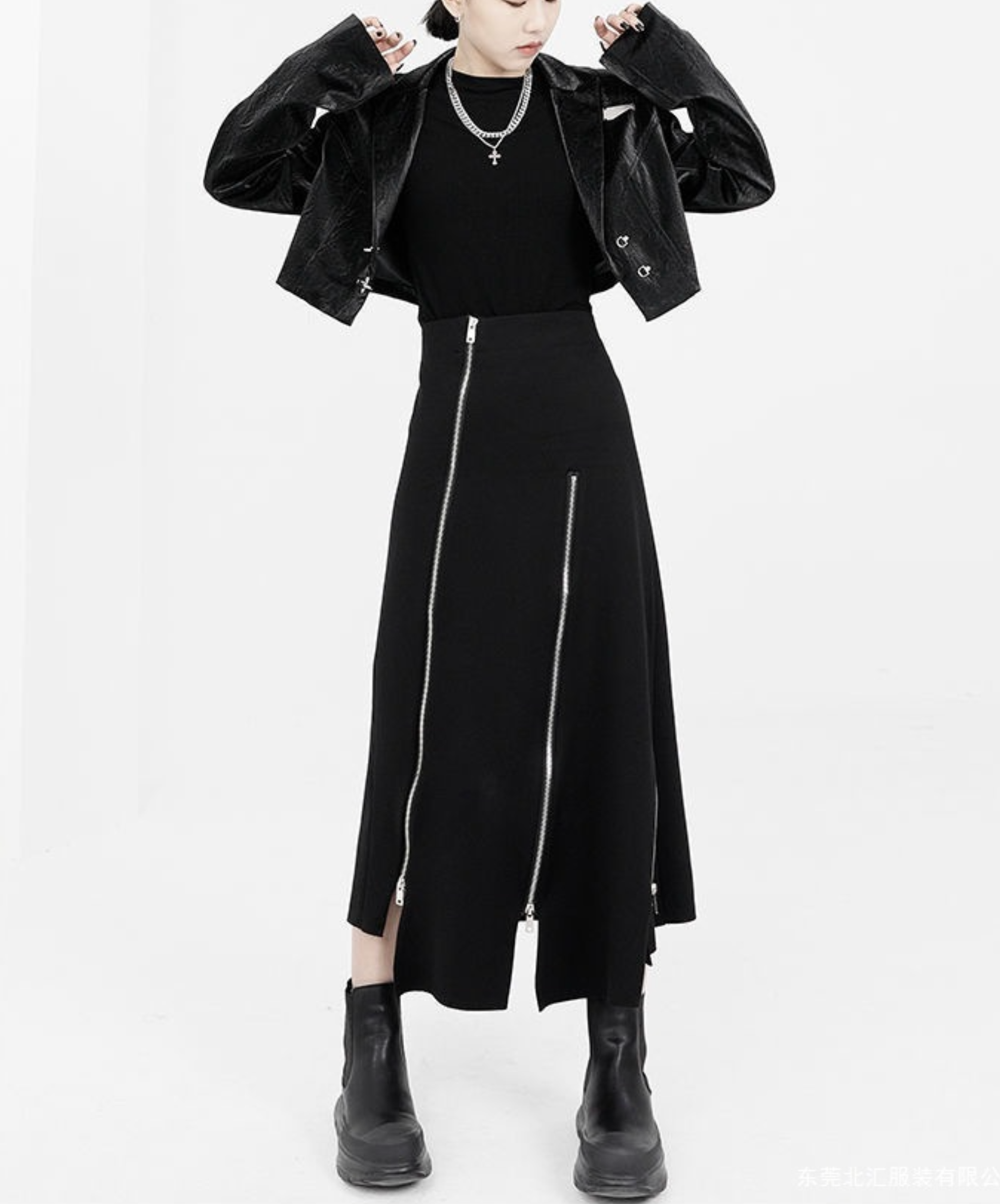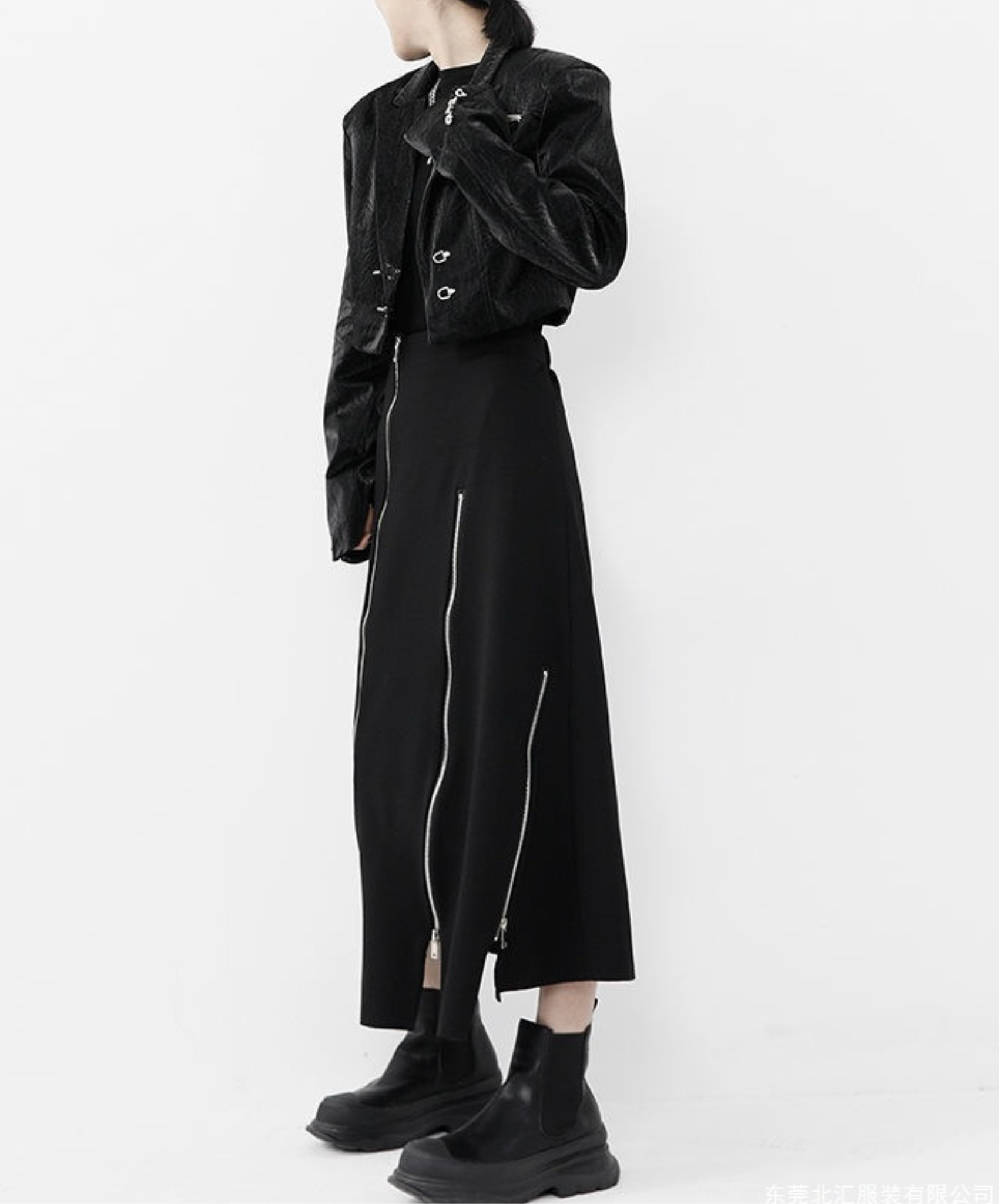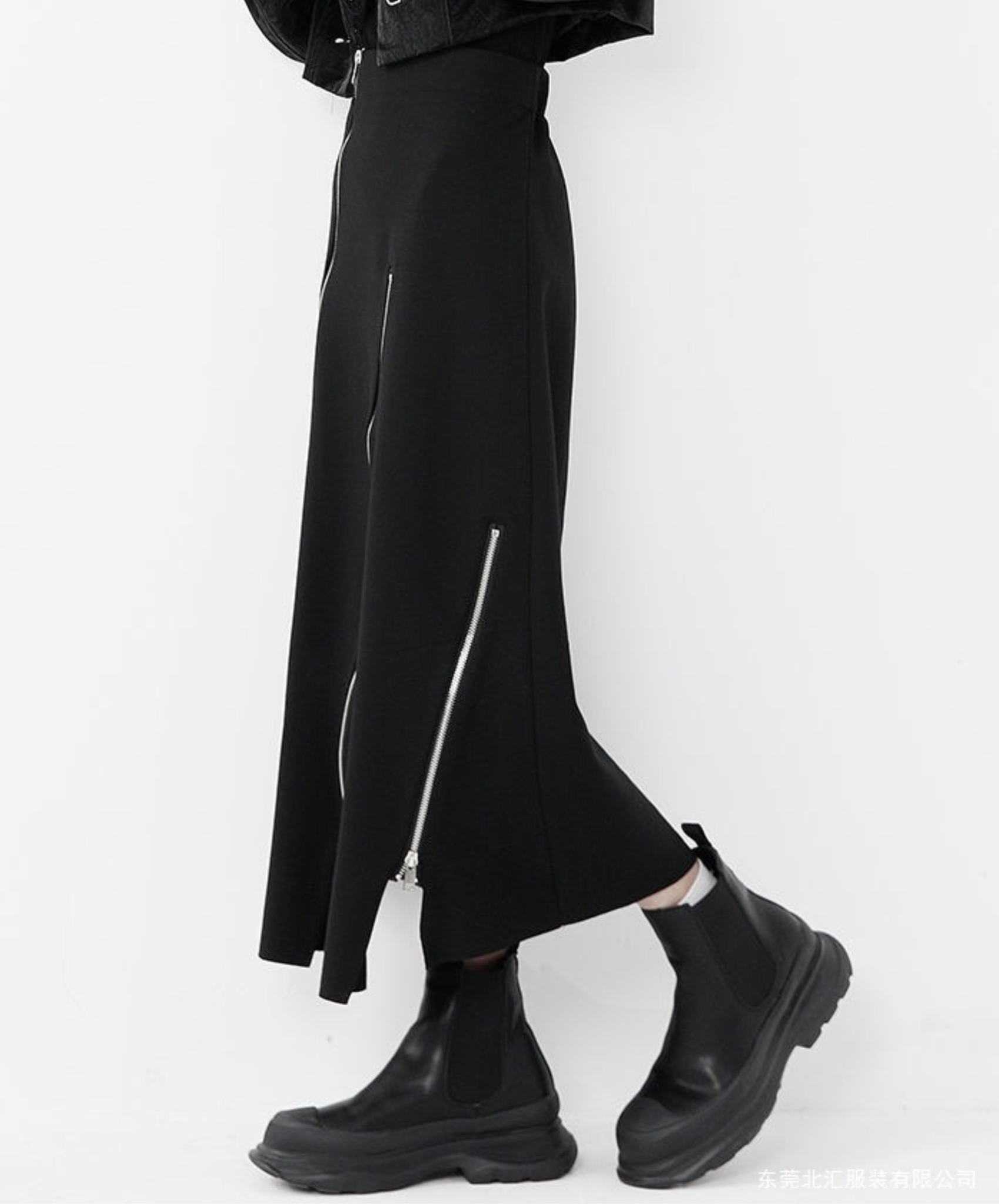 ・イレギュラーなカッティングとファスナー装飾が個性的なロングスカート。
