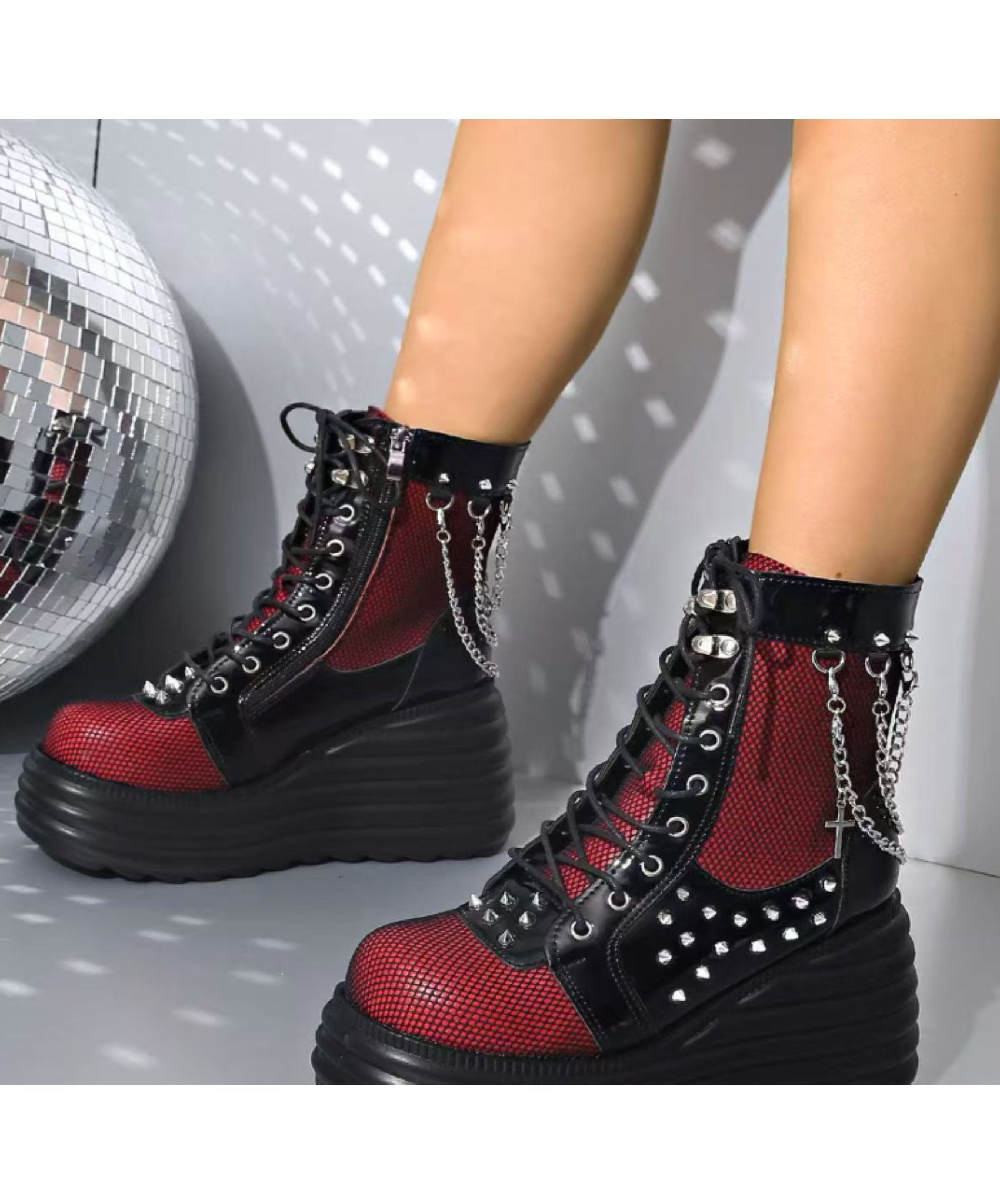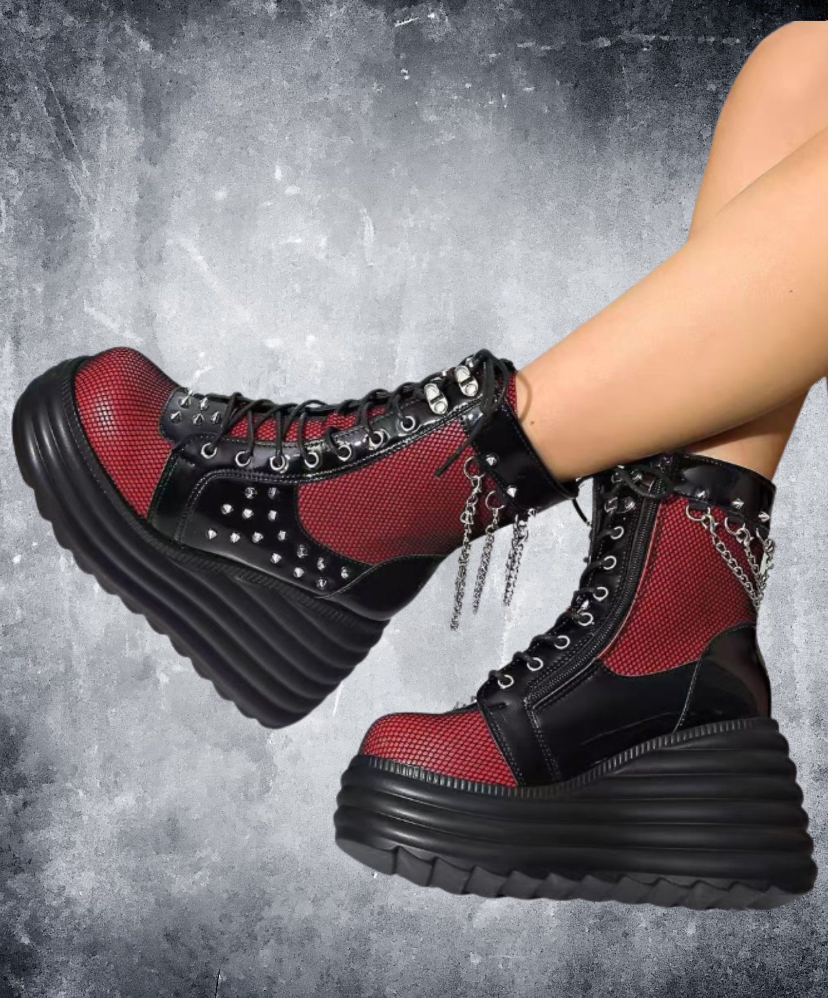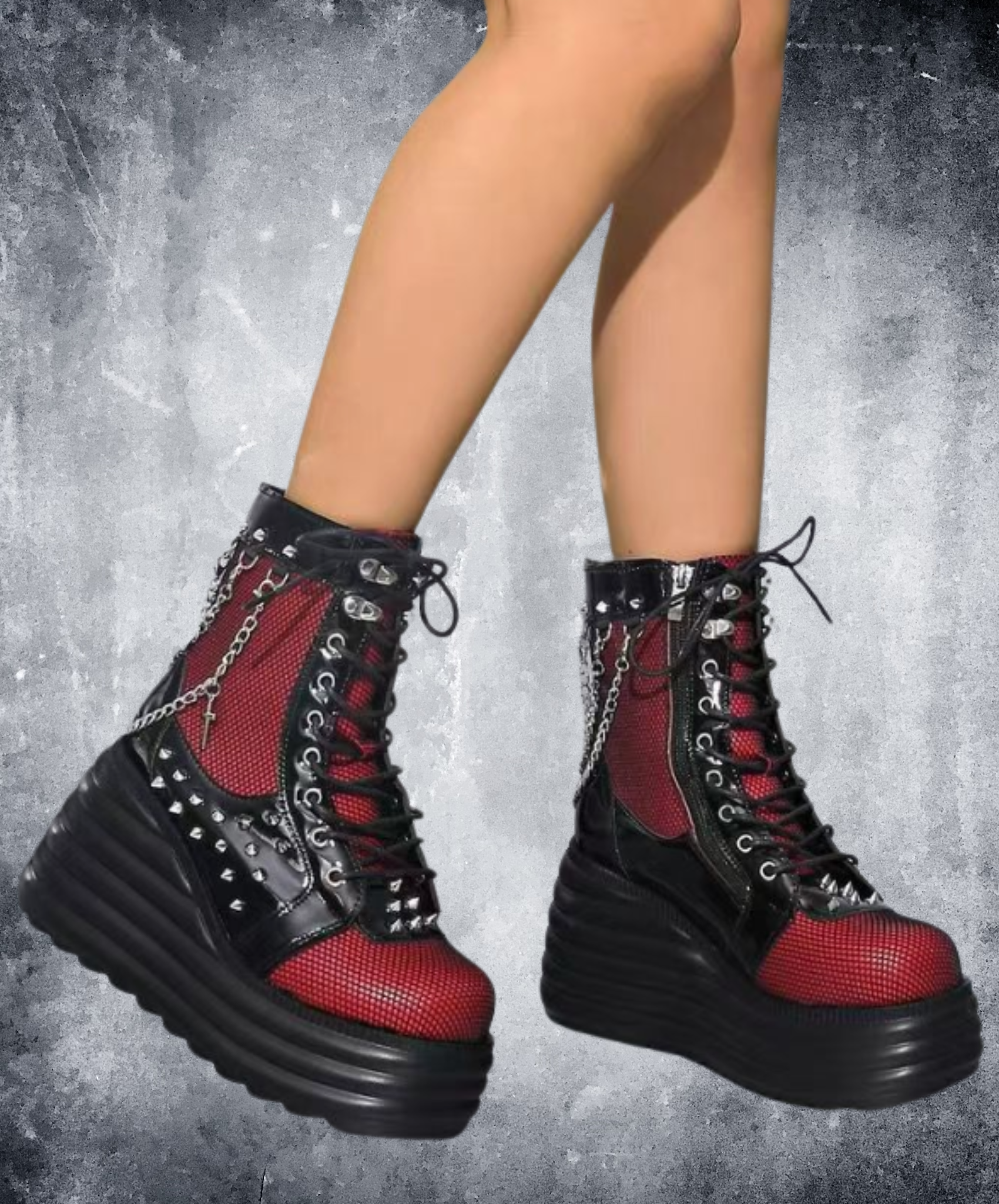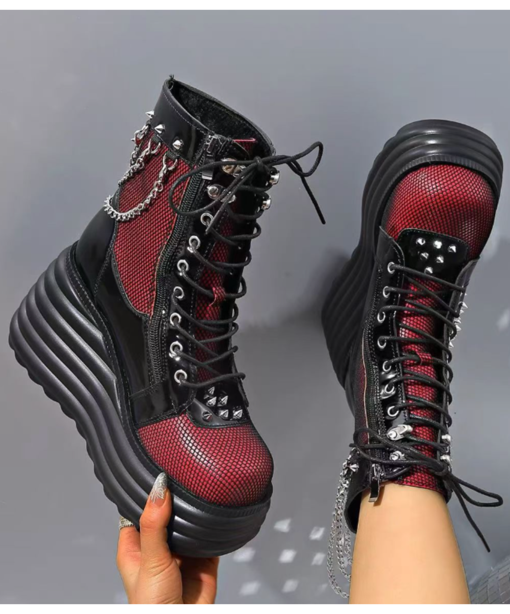 ・網目に透けるRedがパンクロックな雰囲気のジップアップブーツ。