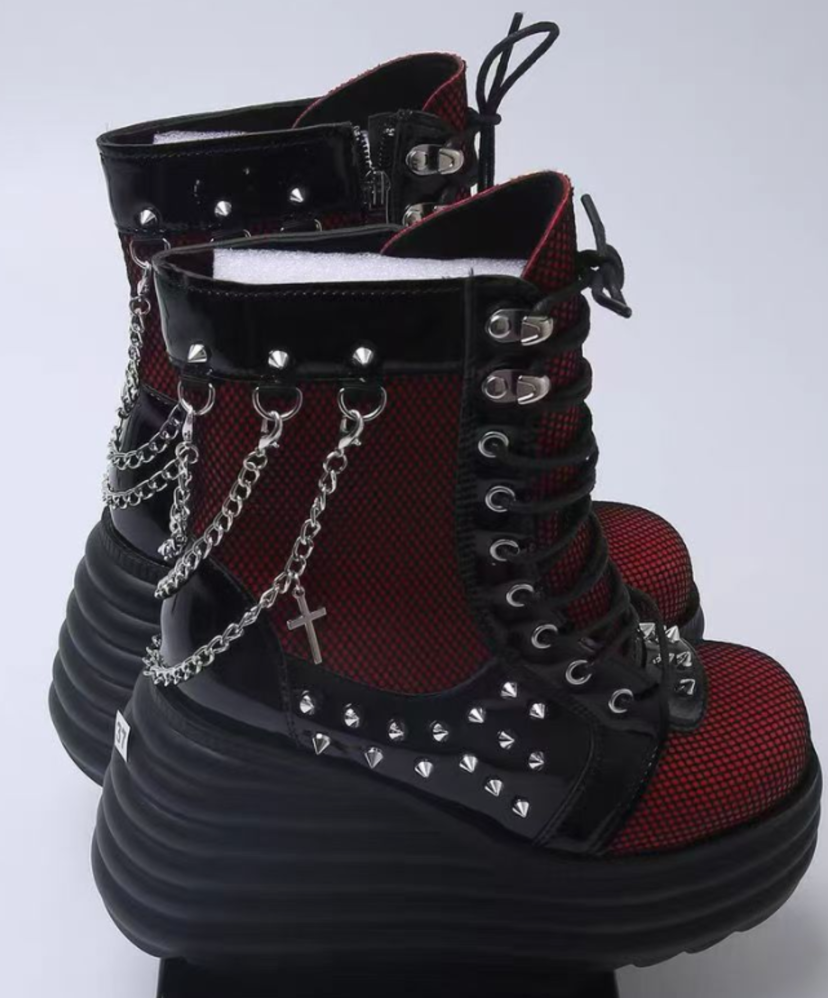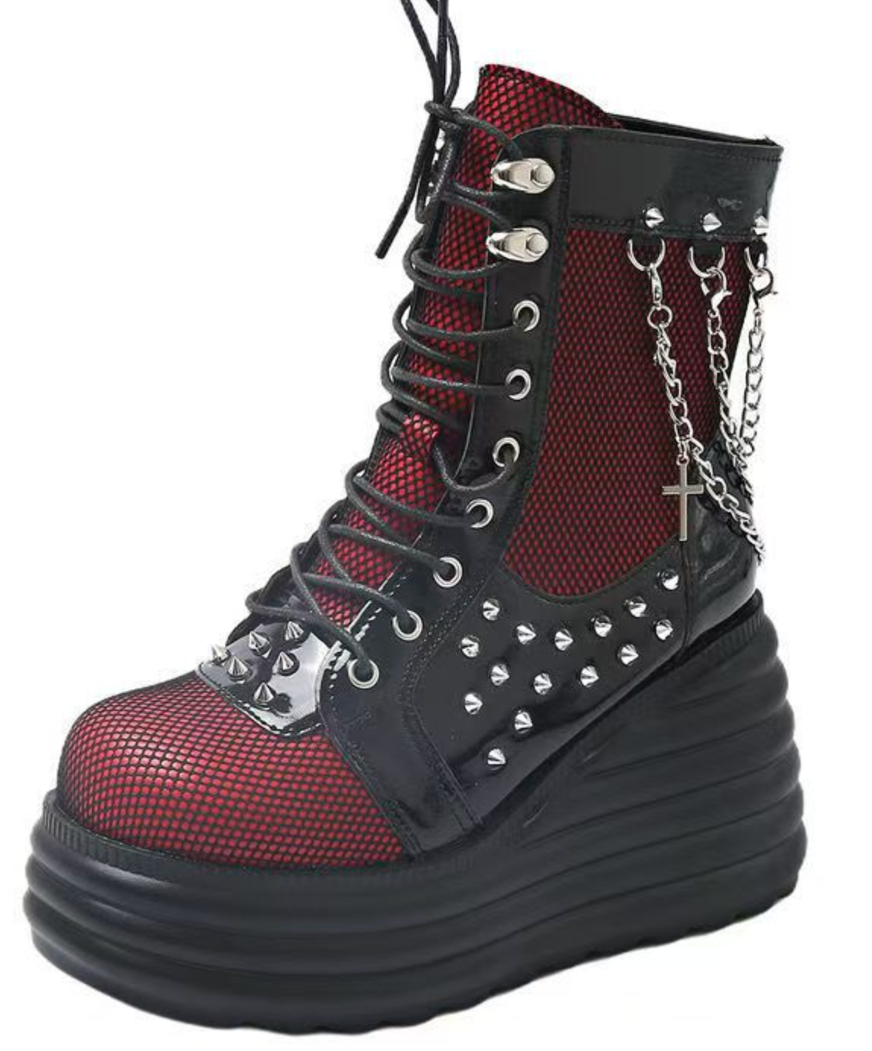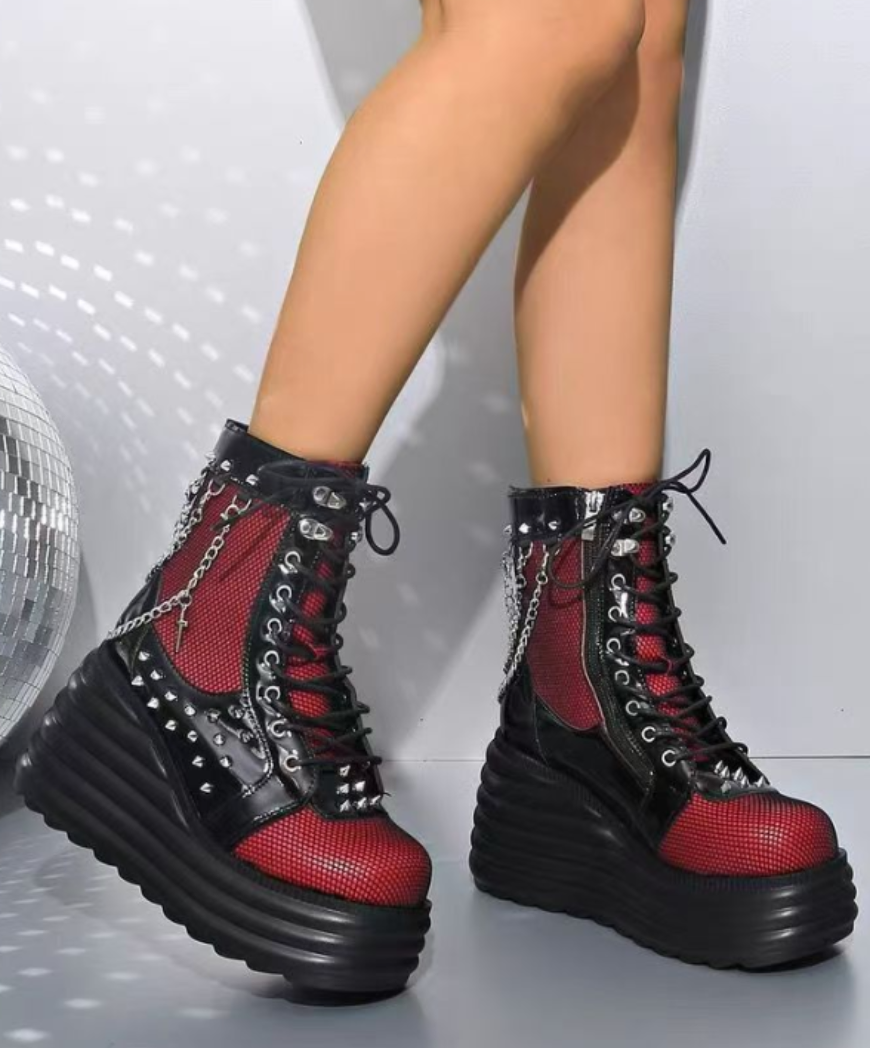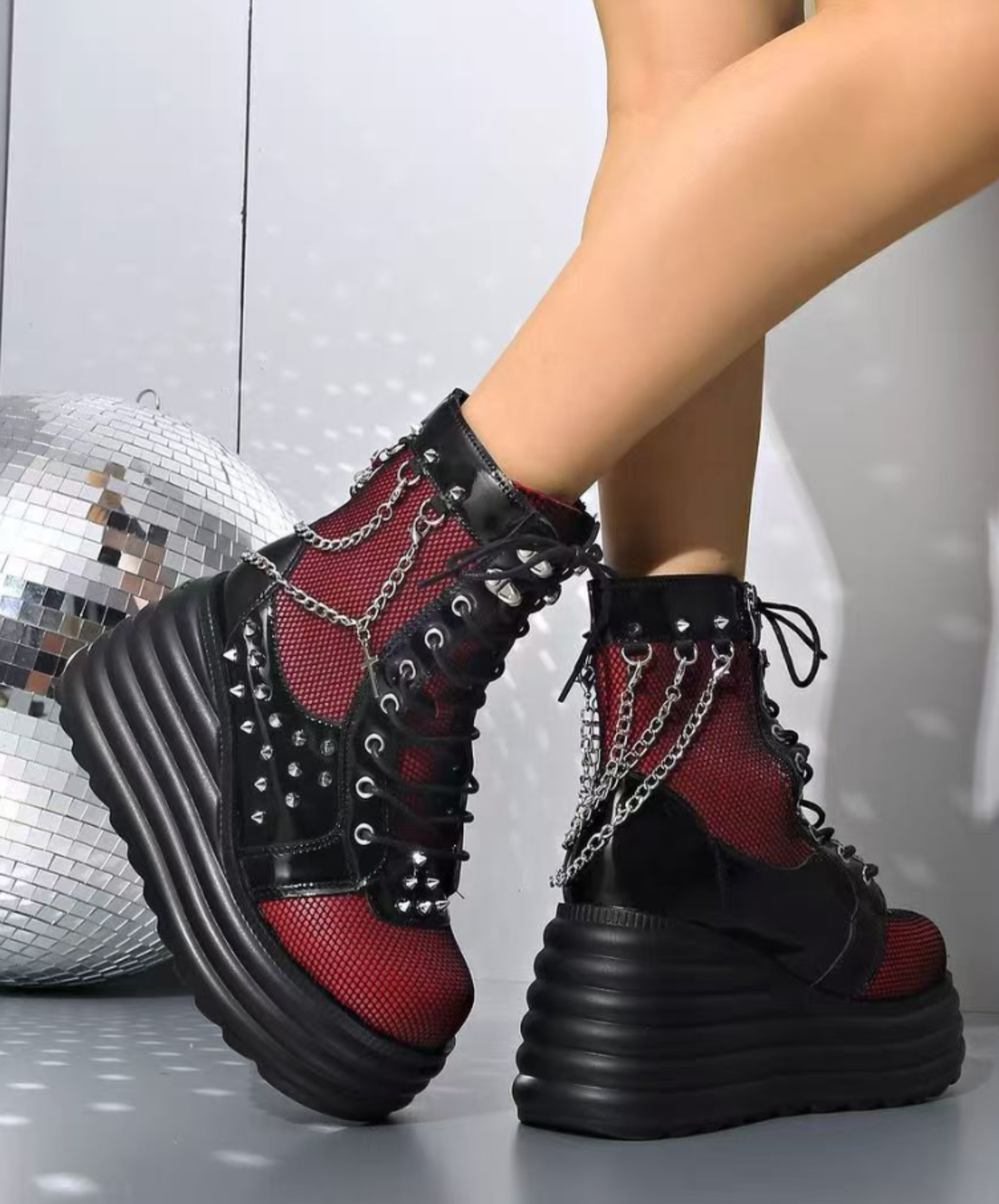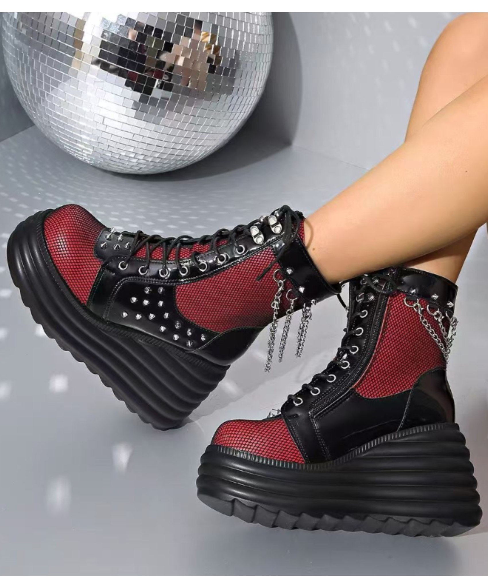 ・網目に透けるRedがパンクロックな雰囲気のジップアップブーツ。