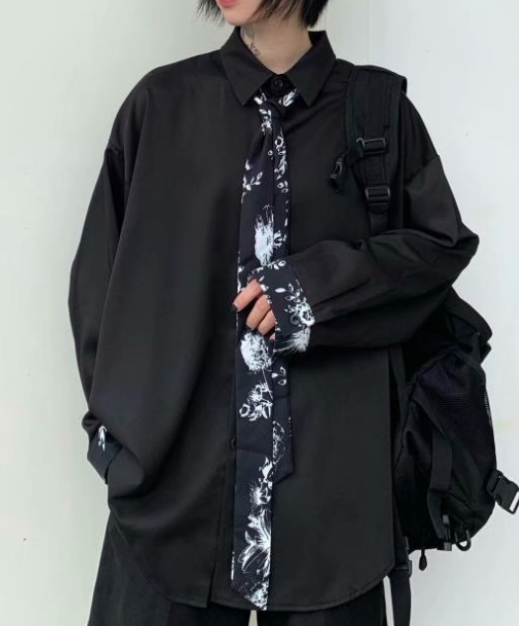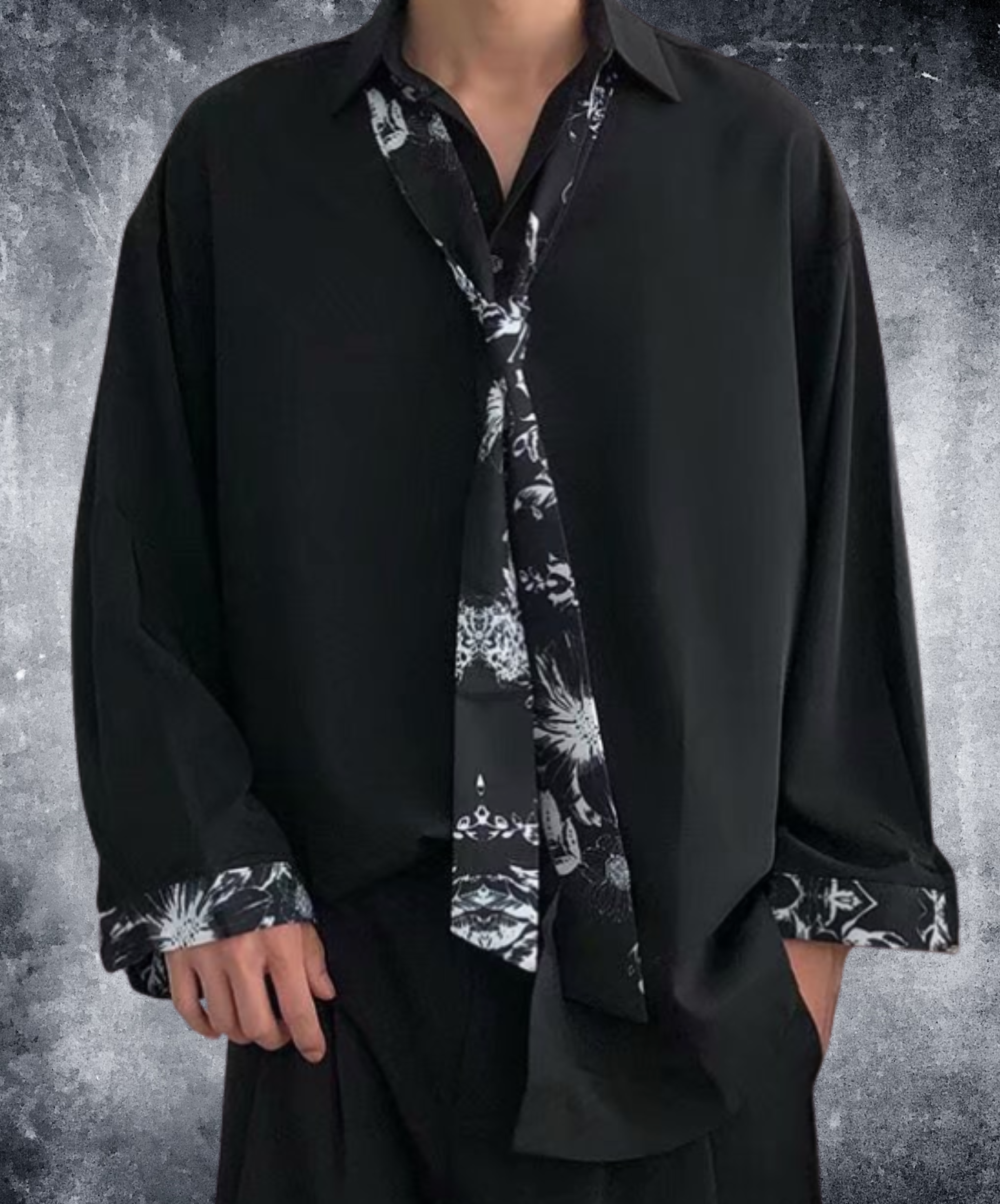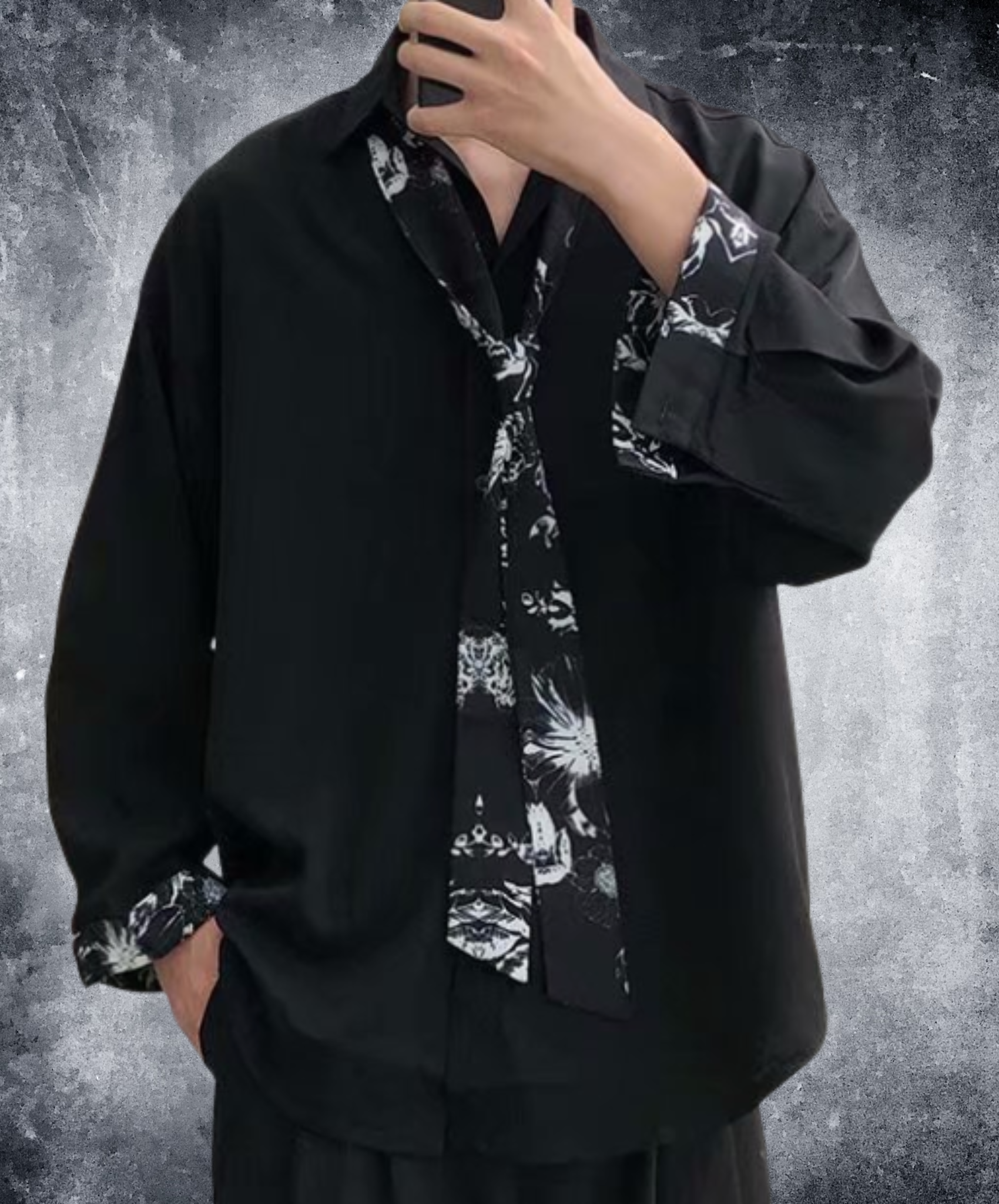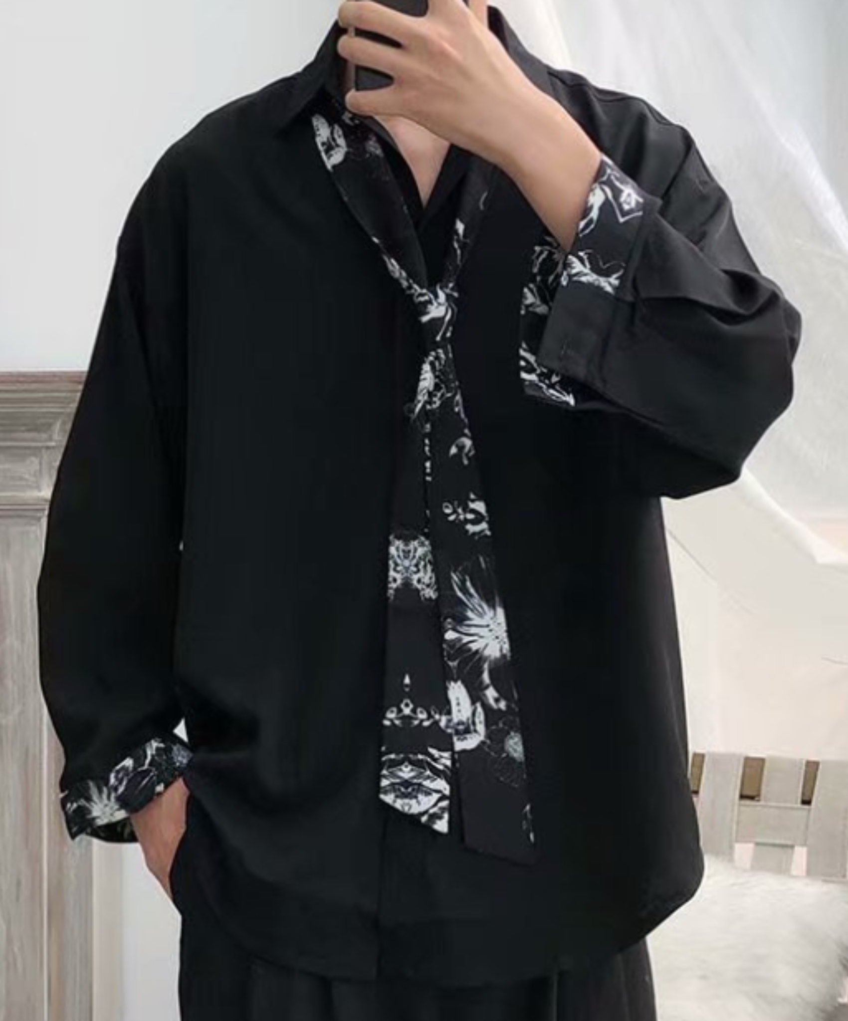 ・スプライシングデザインのボウタイと、お揃いの柄の袖口が特徴的なシャツ。