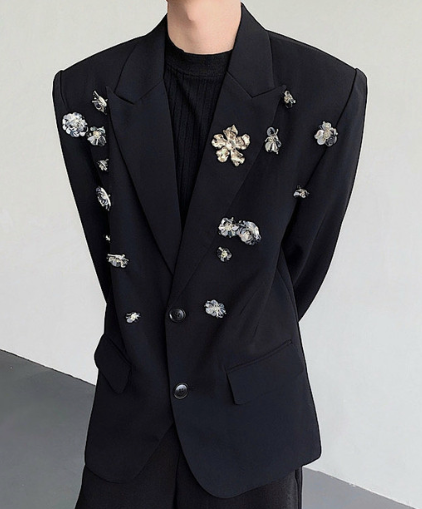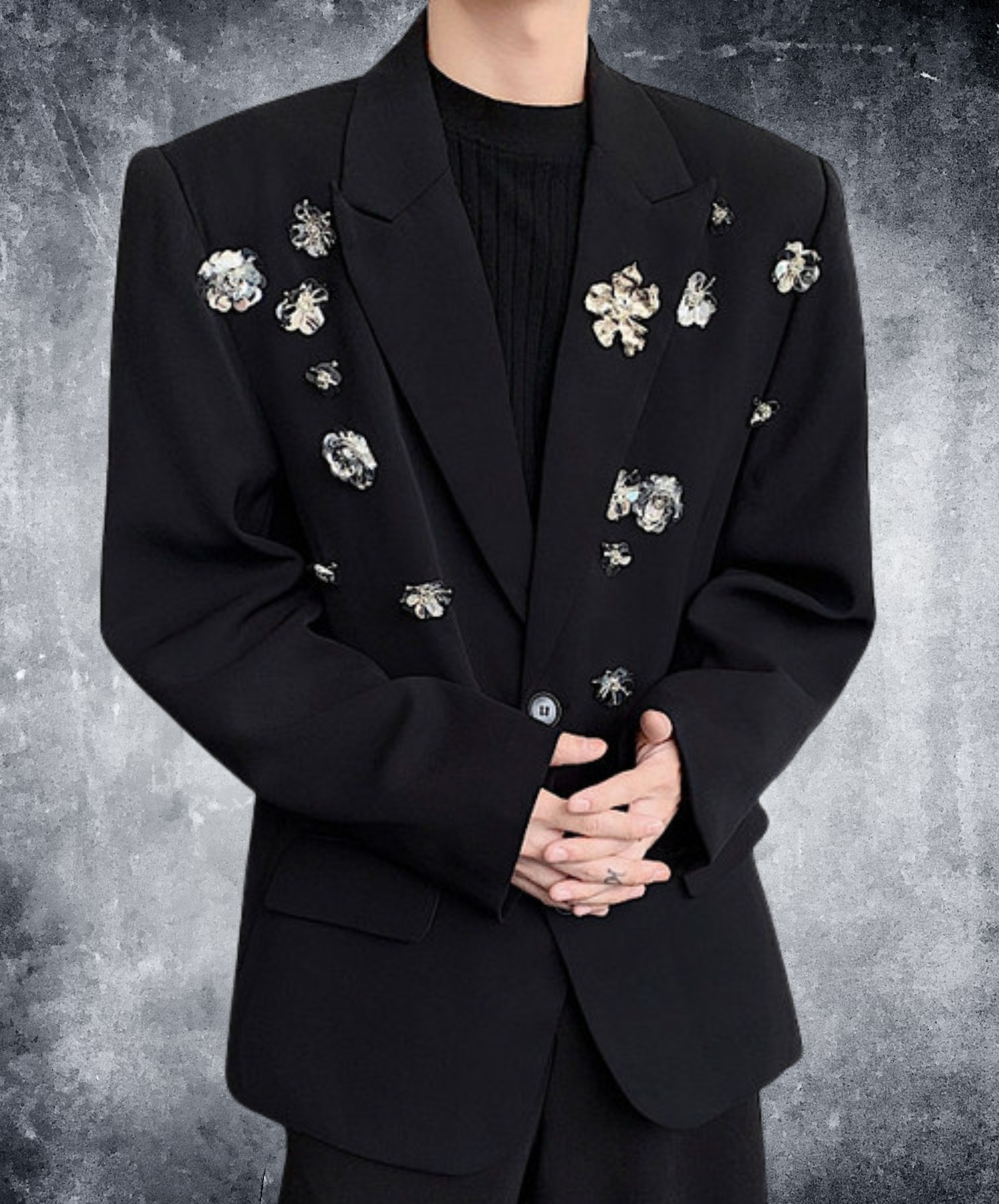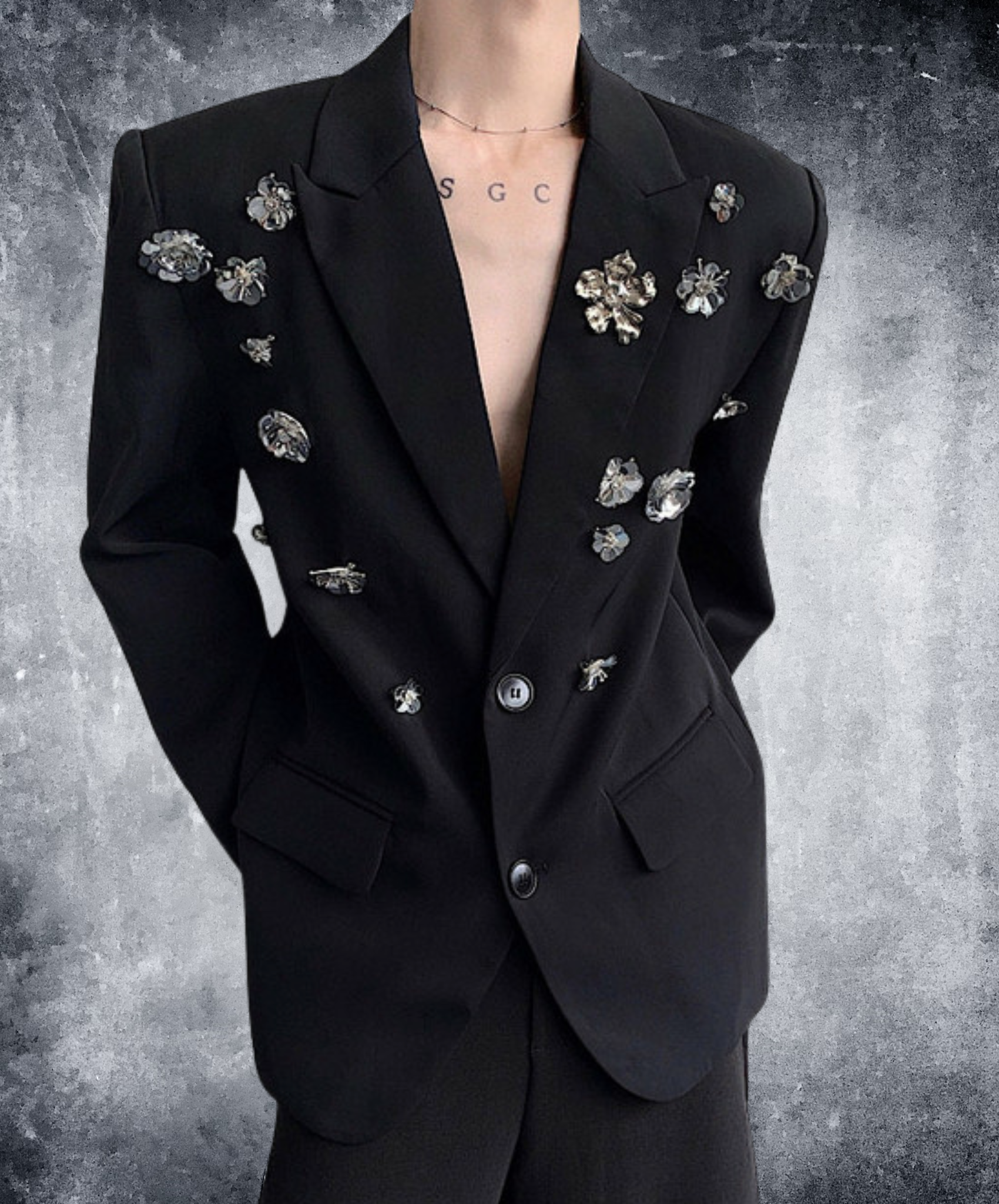 ・大小様々な大きさのメタルフラワー装飾が輝くゴージャスなジャケット。