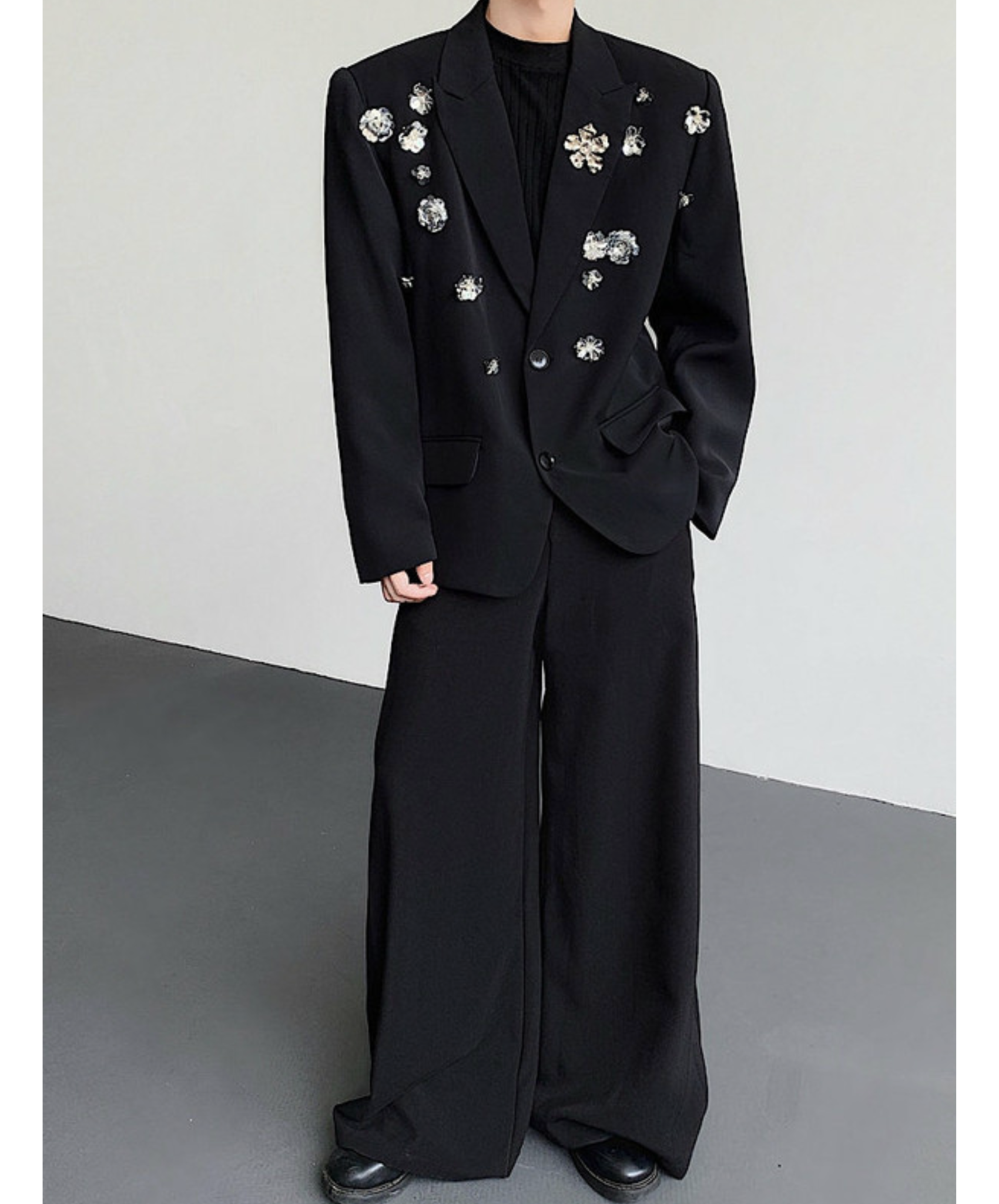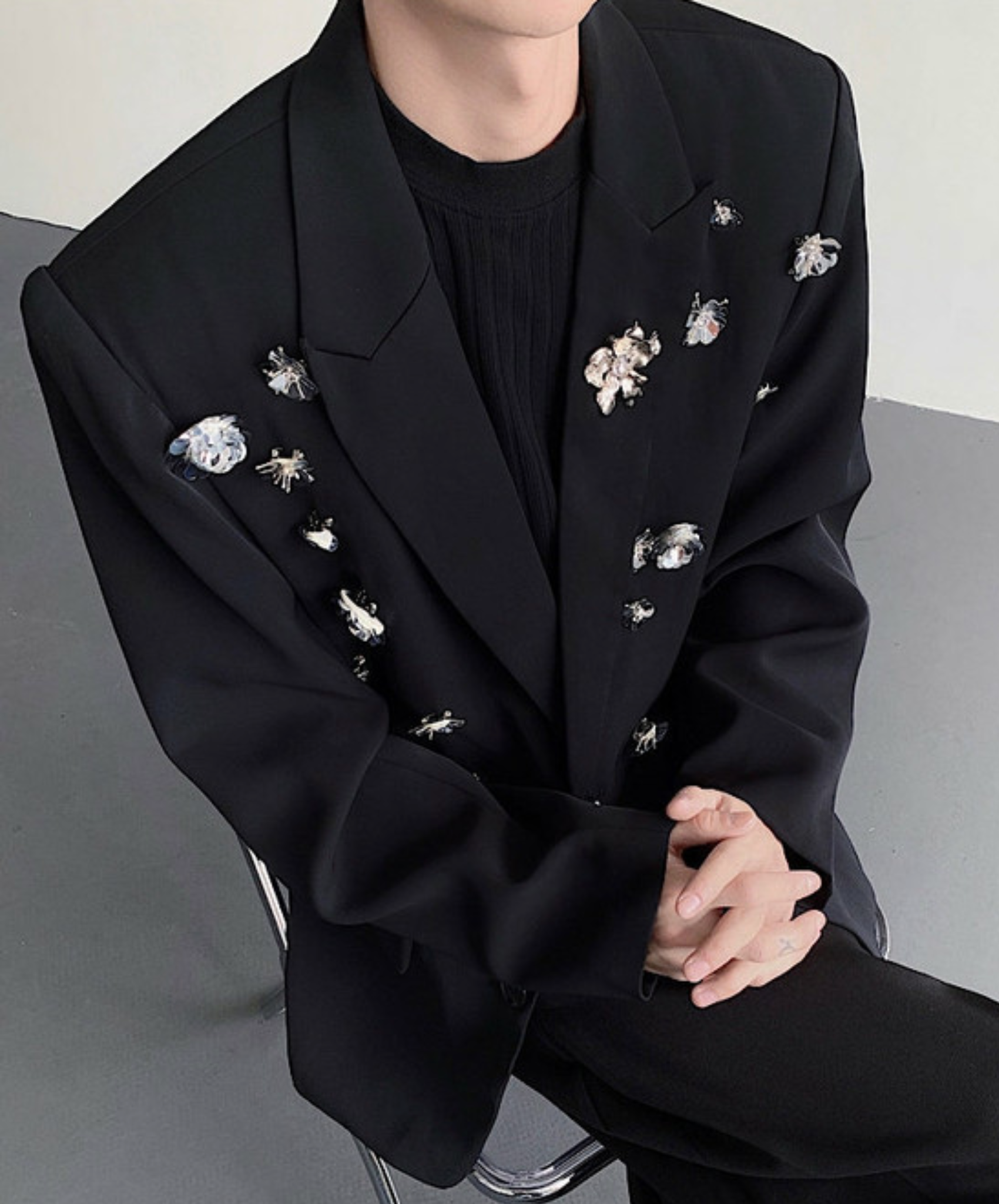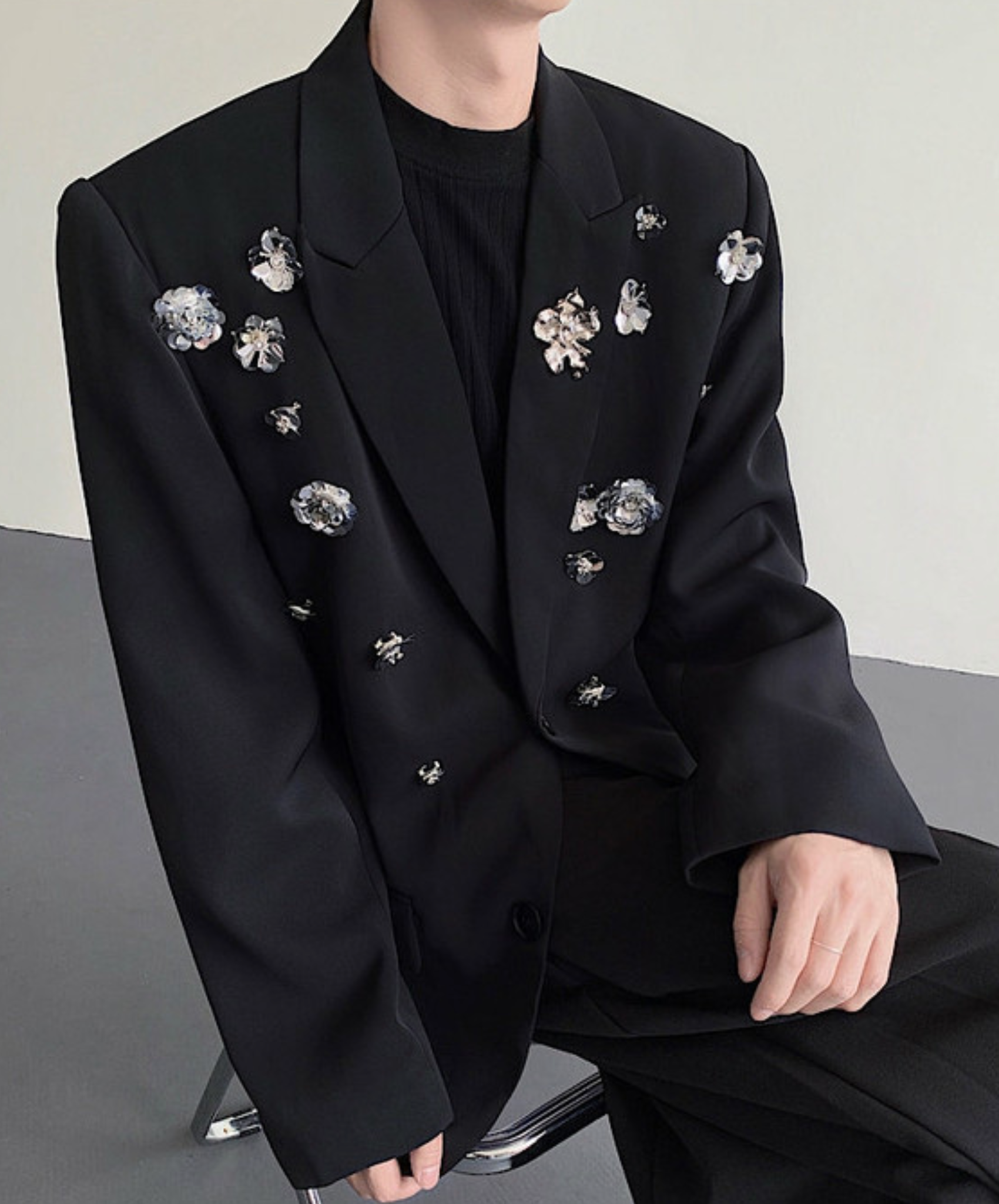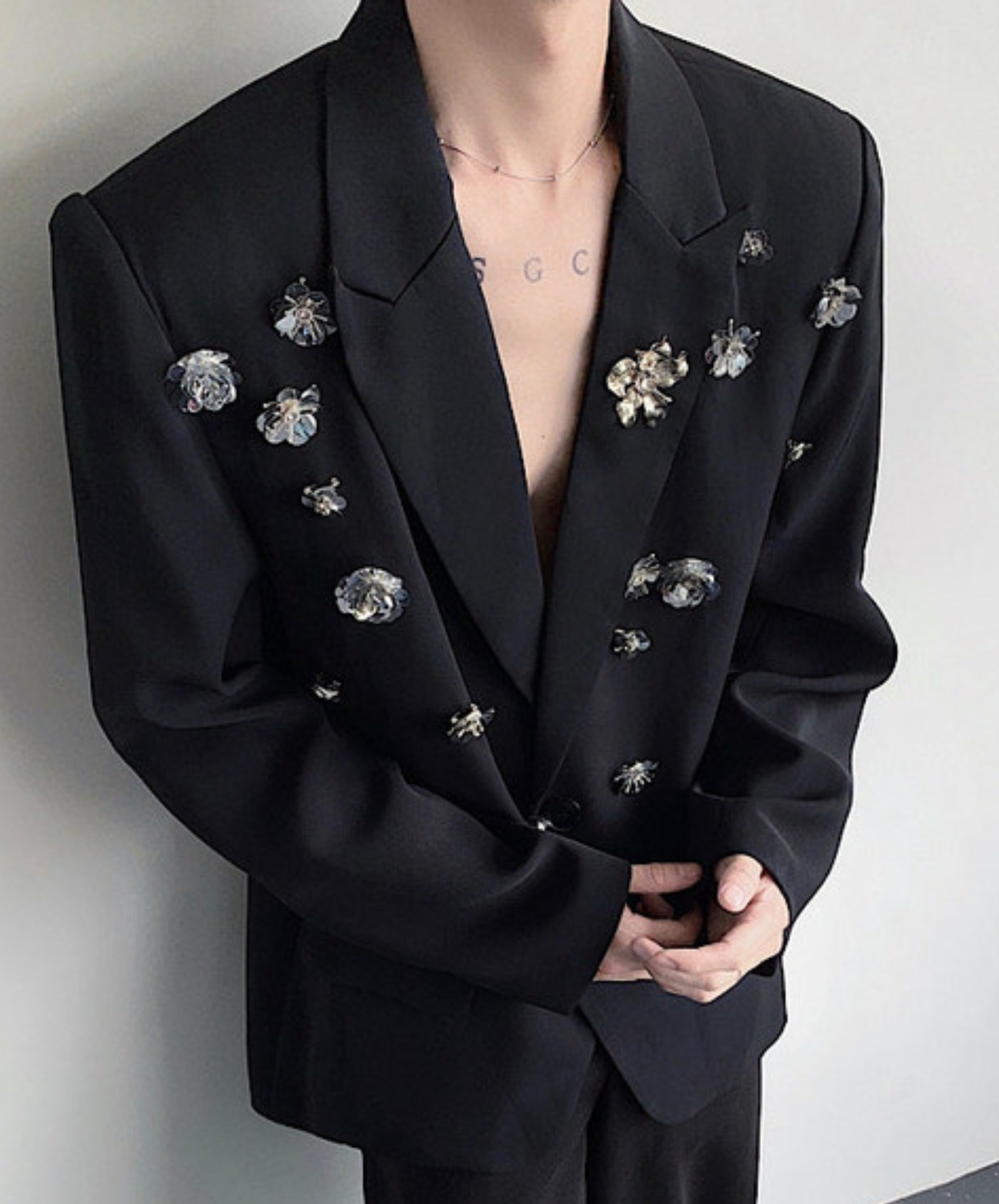 ・大小様々な大きさのメタルフラワー装飾が輝くゴージャスなジャケット。