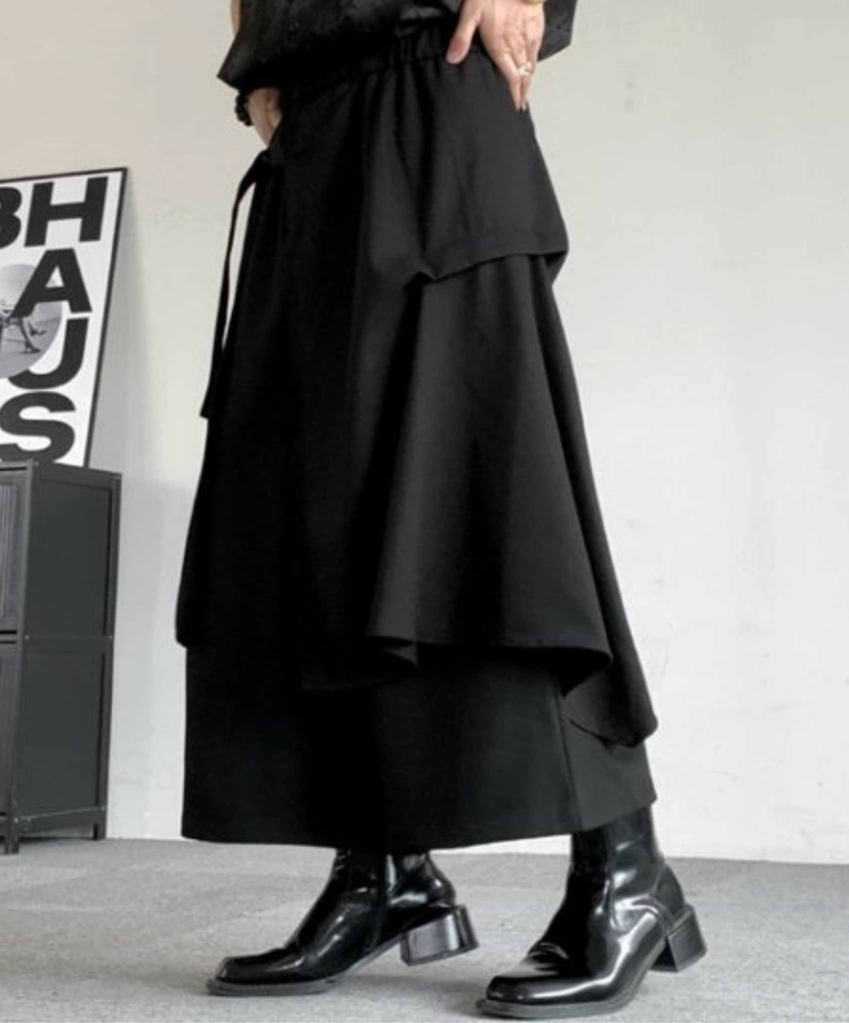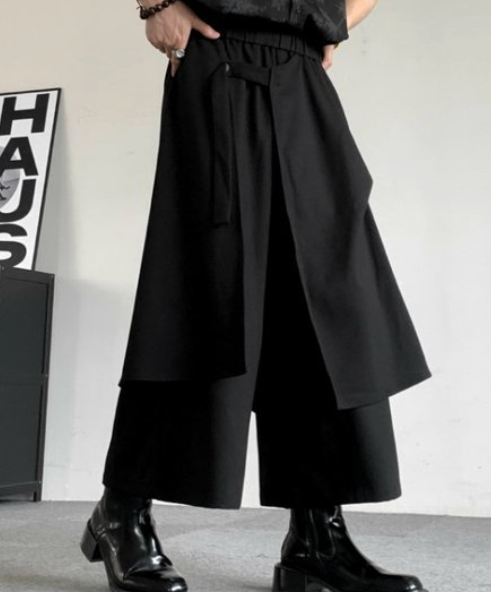 ・重ね着風デザインの袴ワイドパンツ。