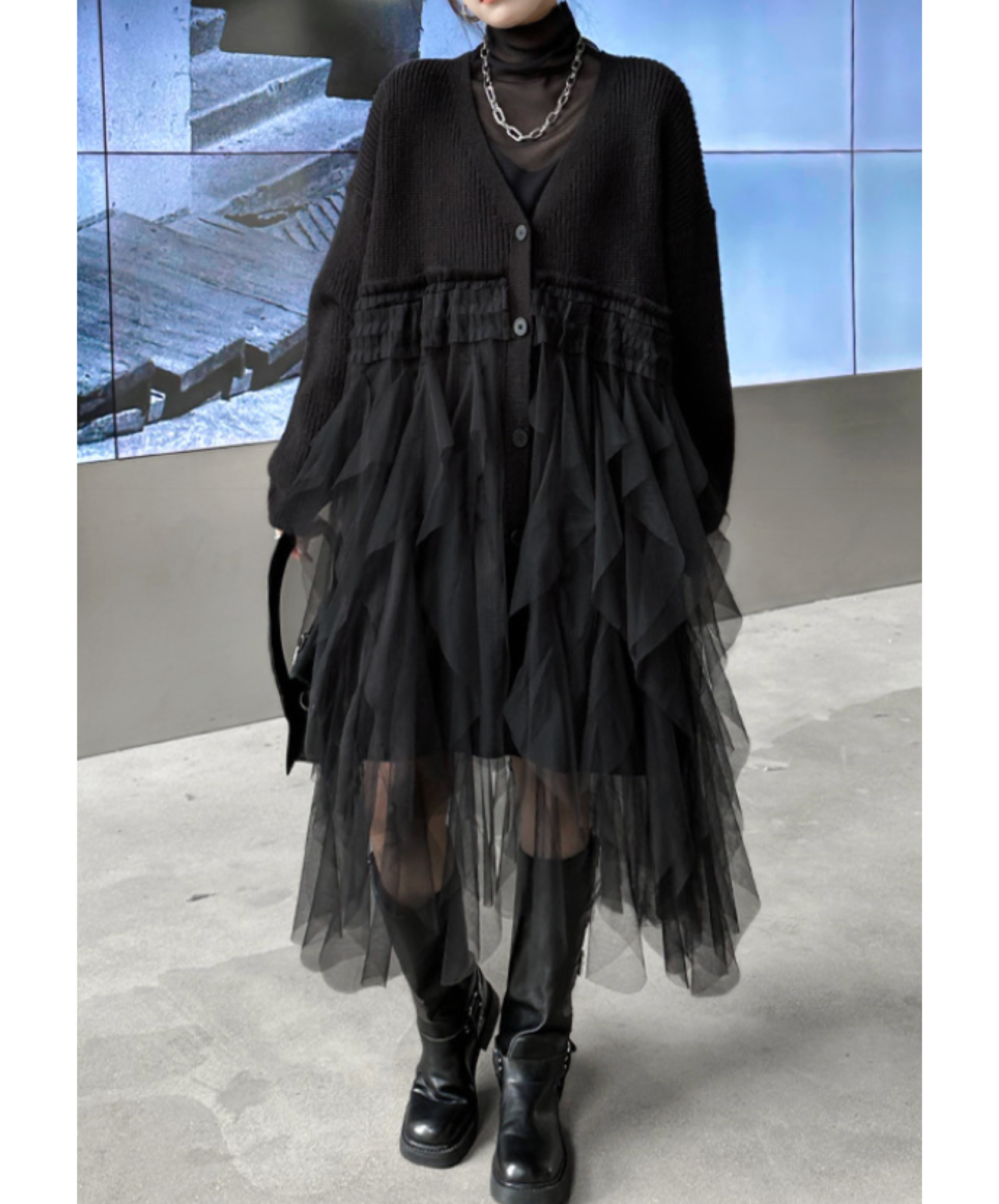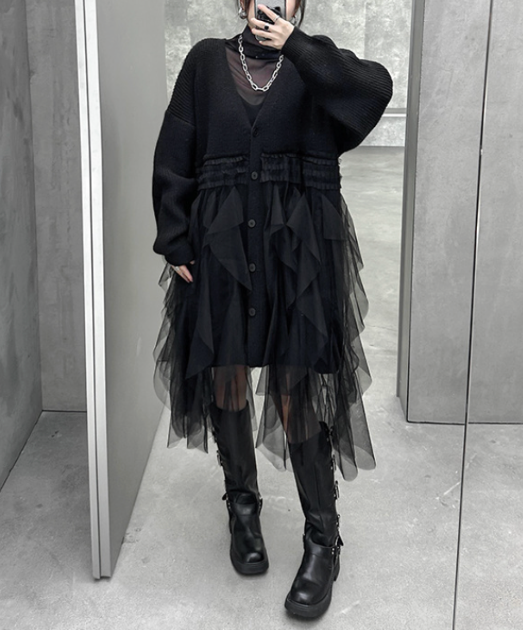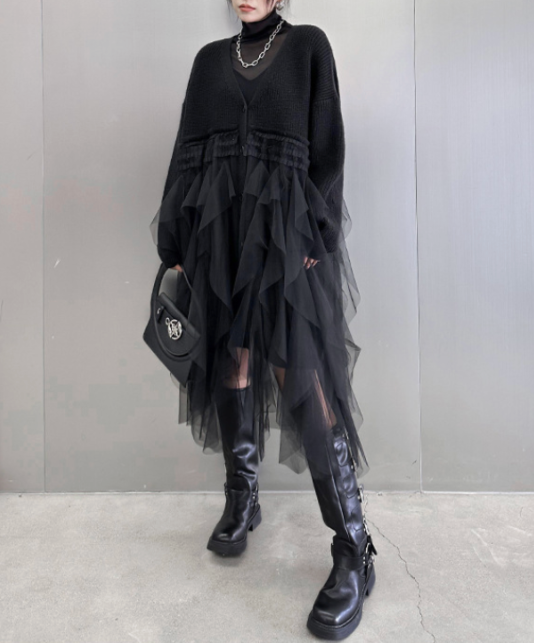・vネックで首元はスッキリ、チュールのボリュームが引き立ちます