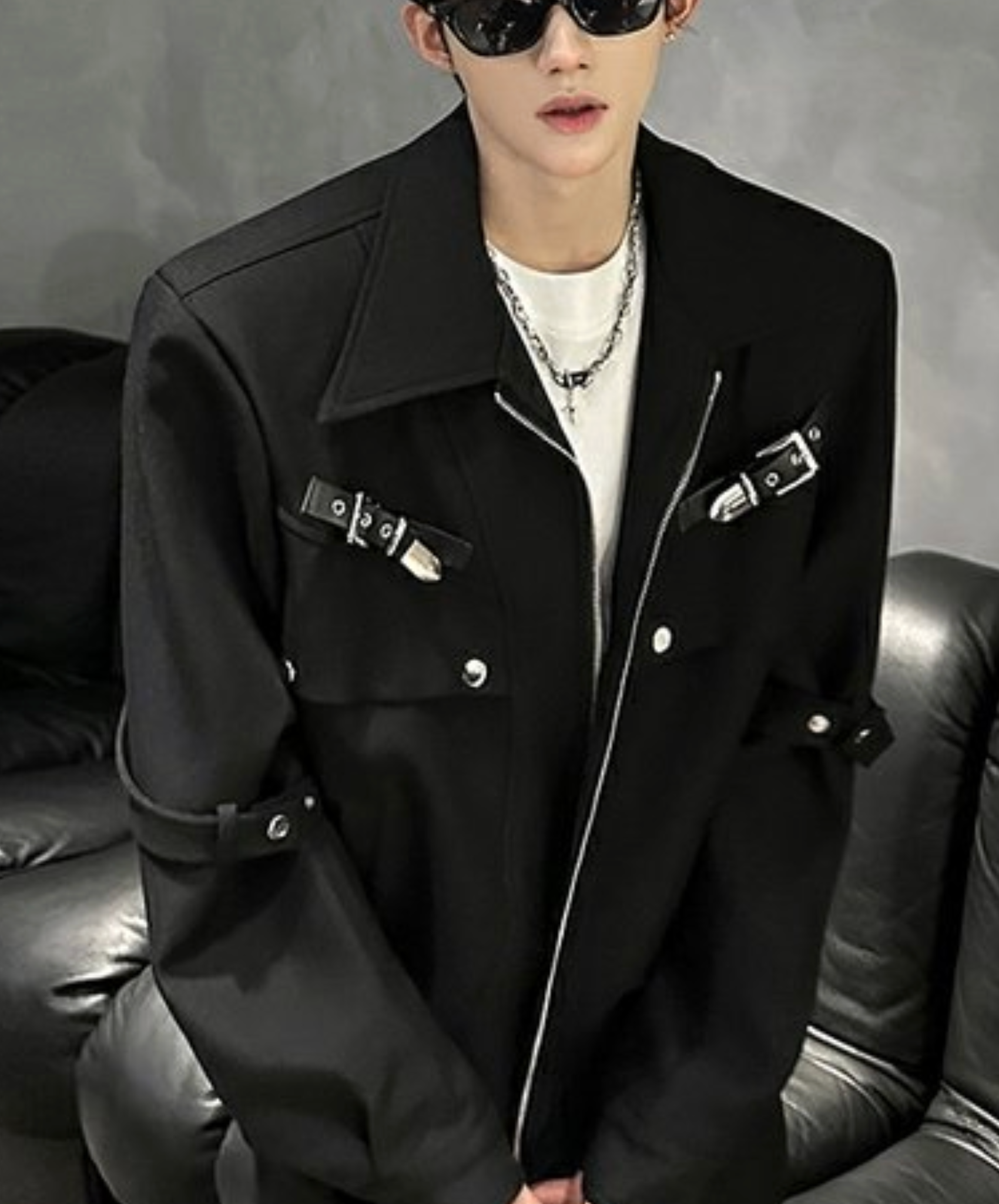 ・メタル装飾付きベルトがパンチのあるデザインのジャケット
