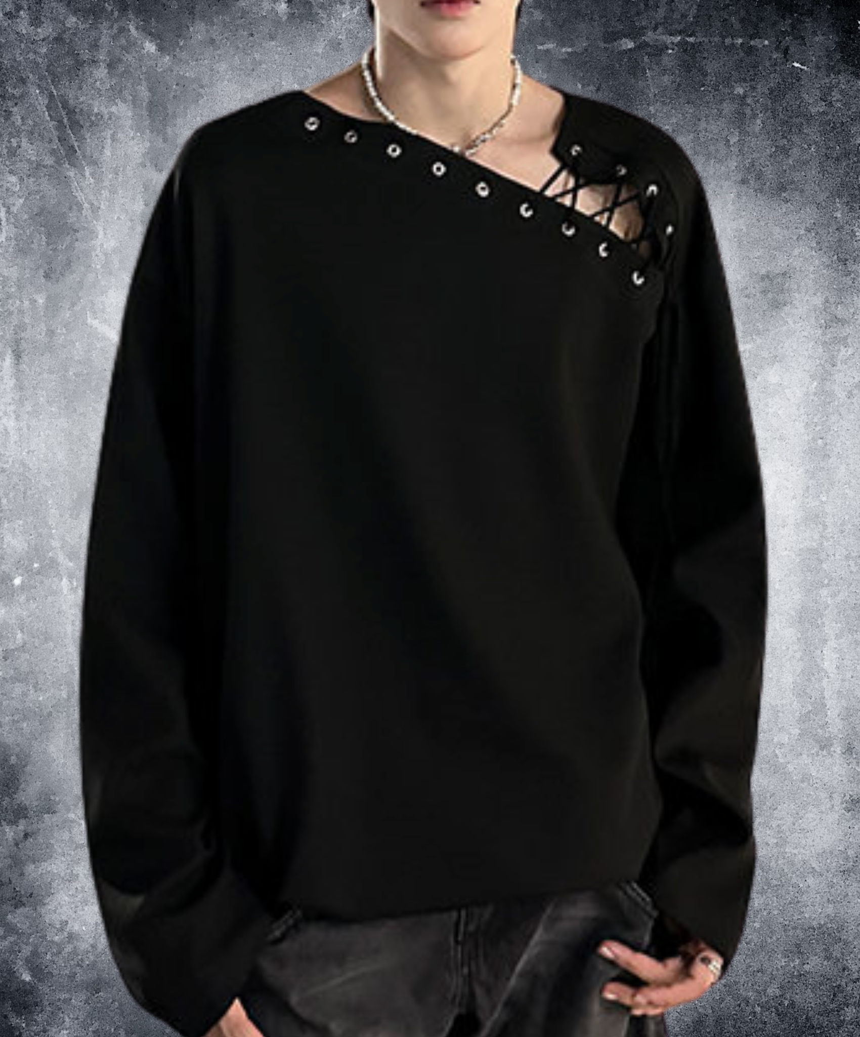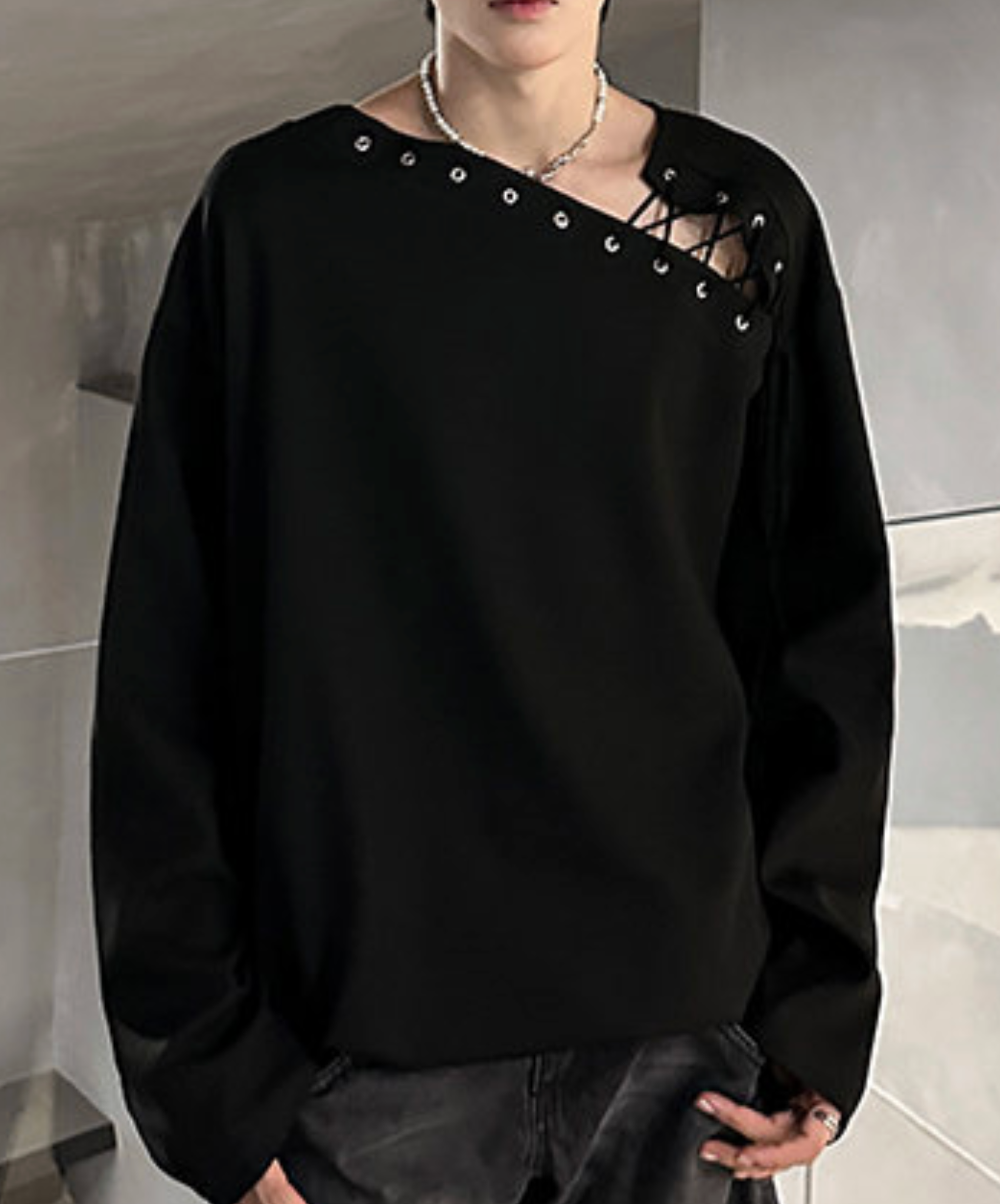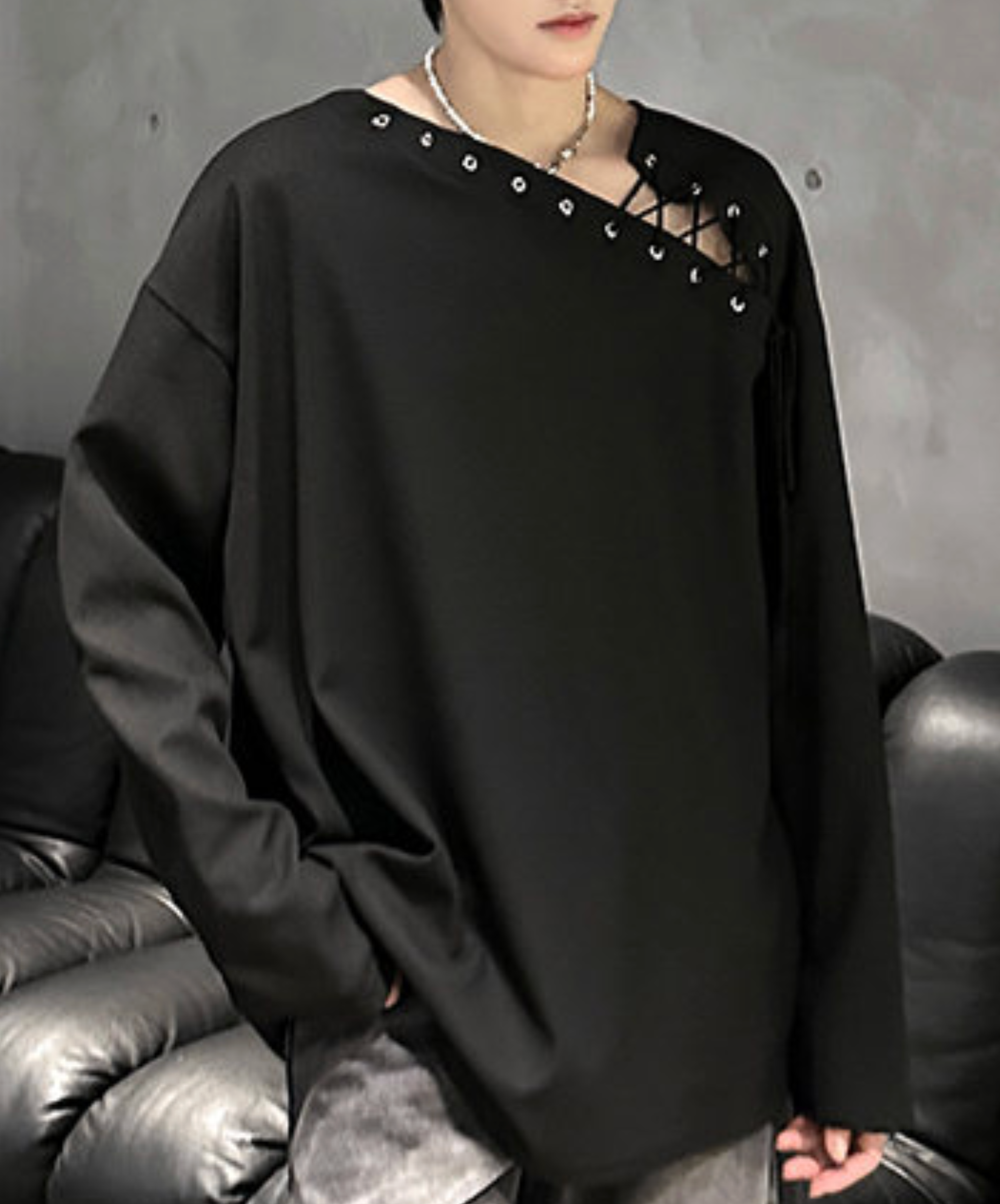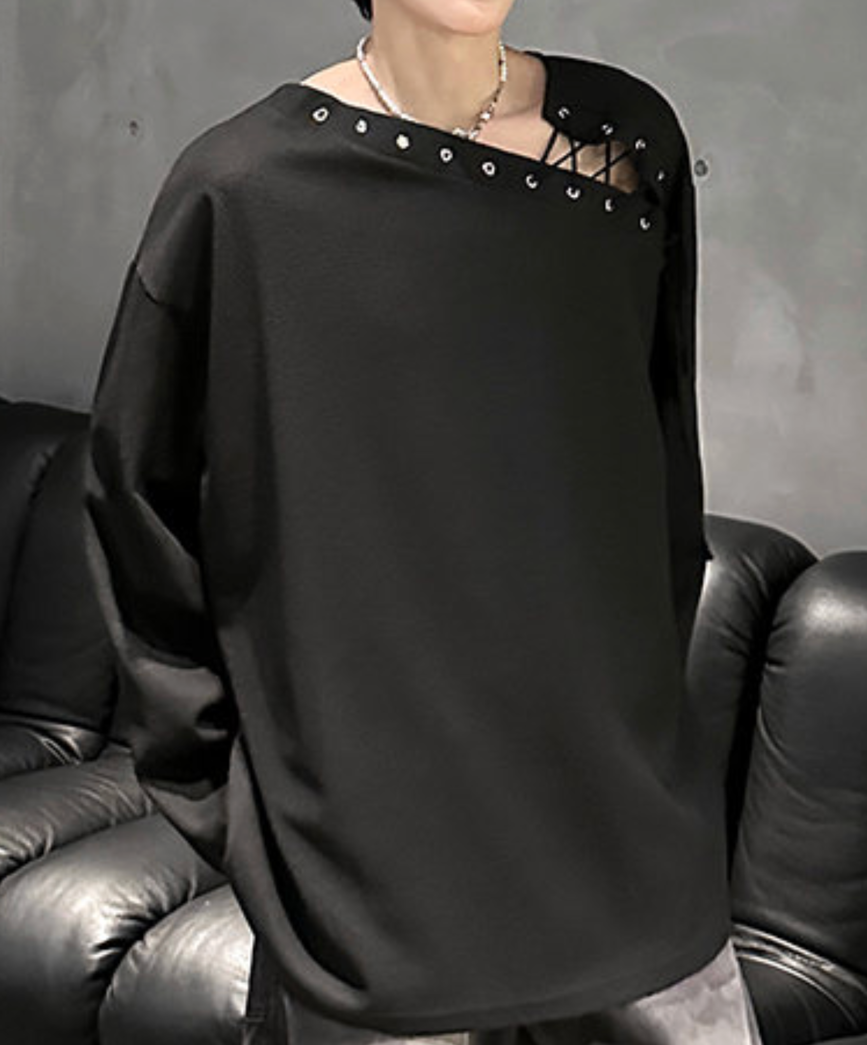 ・アシンメトリックなレースアップデザインの長袖Tシャツ。