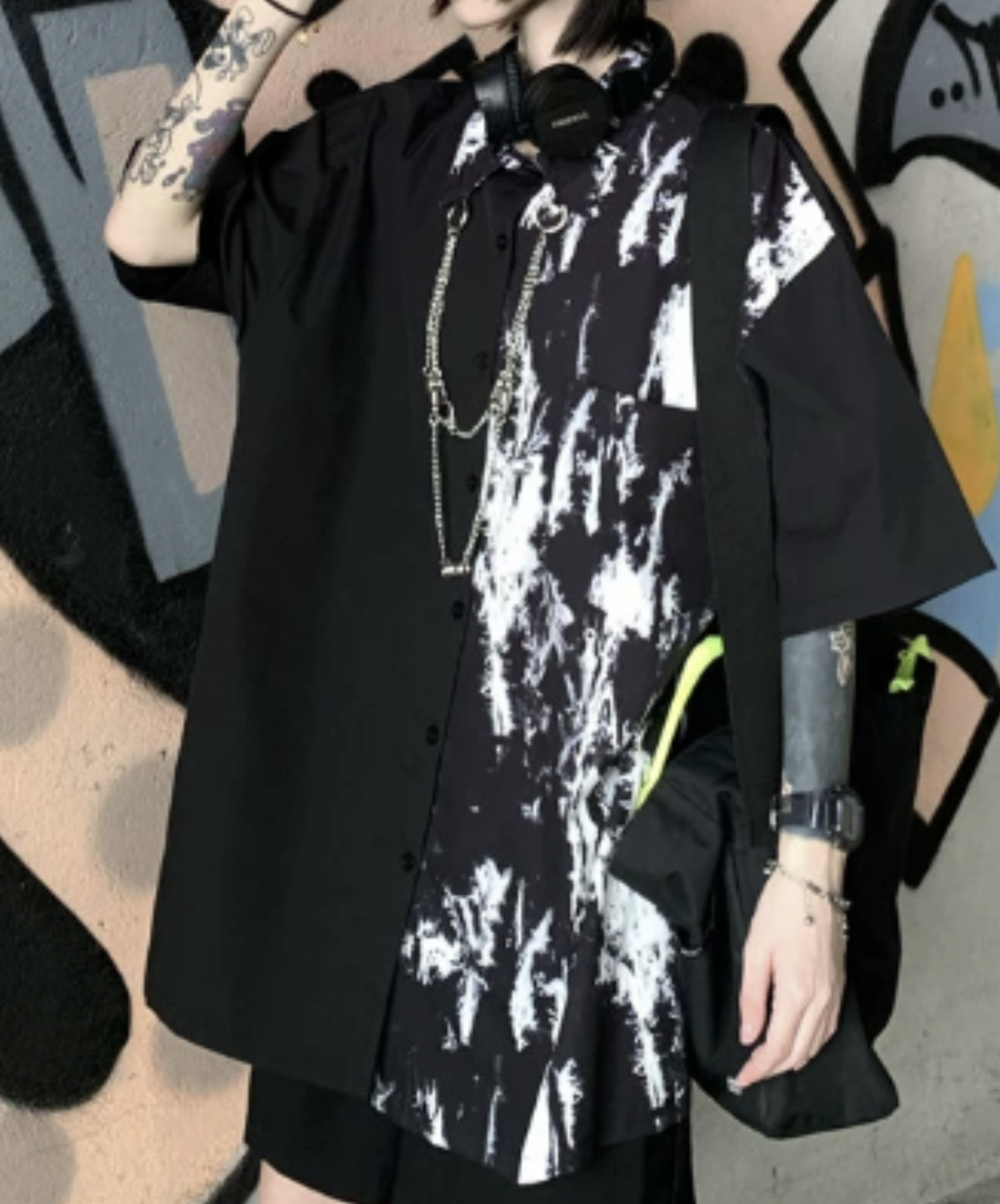 ・人目を惹く切り替えデザインとチェーン飾りが魅力のシャツ