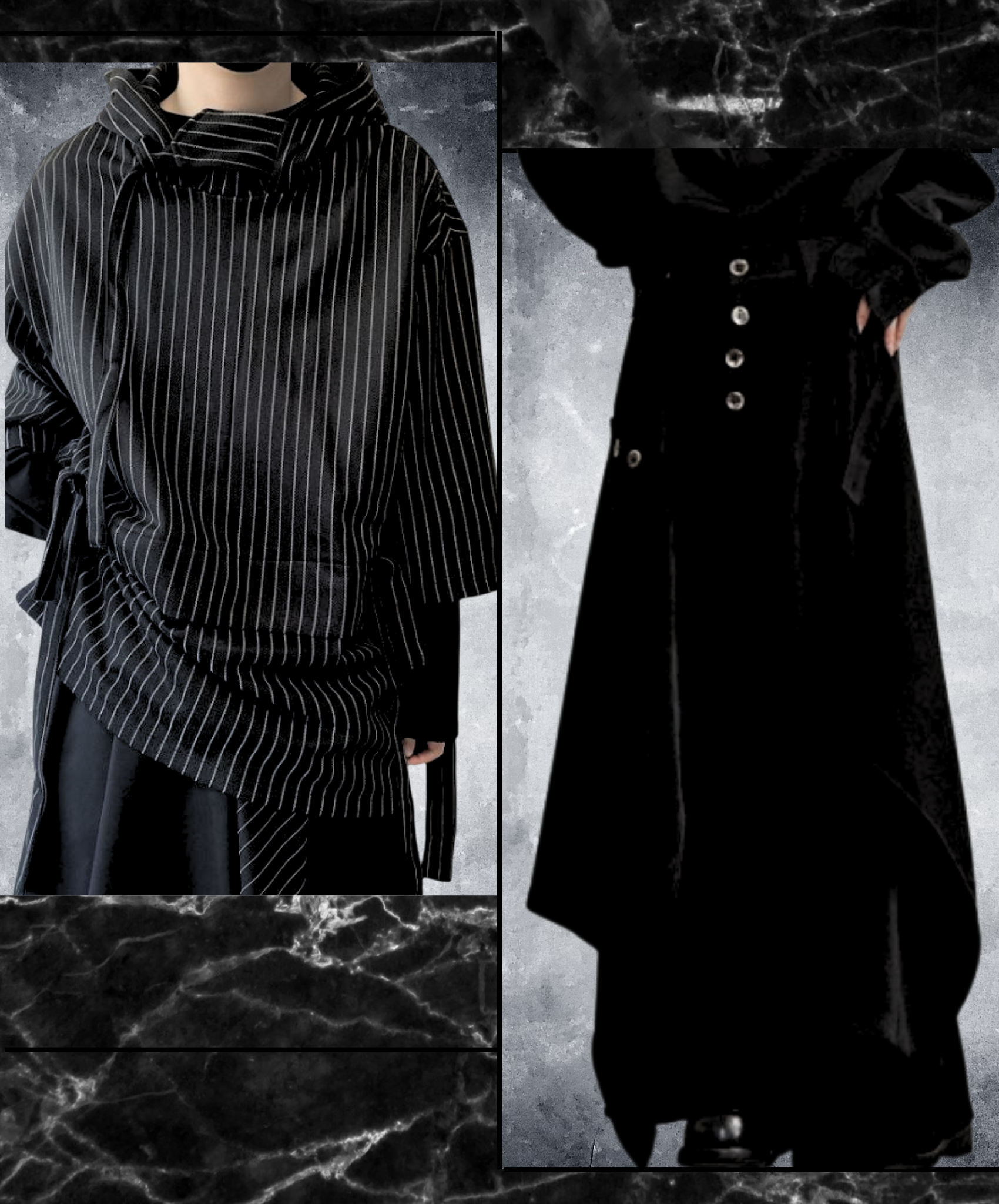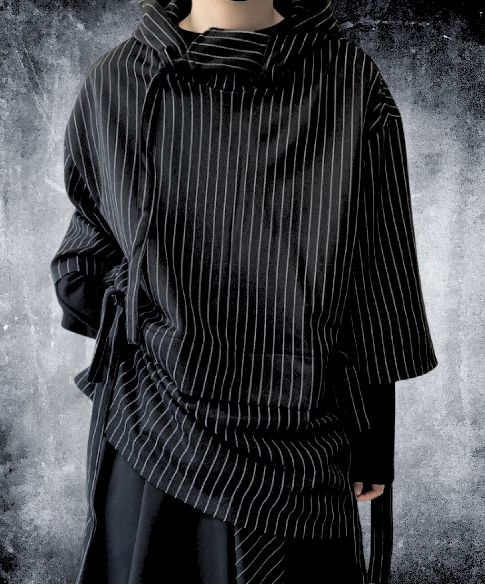 シックなストライプデザインがモードな雰囲気を創り上げるパーカーと、大胆な布の重ね合わせと独特なボタン配置が個性的なワイドパンツのセット。