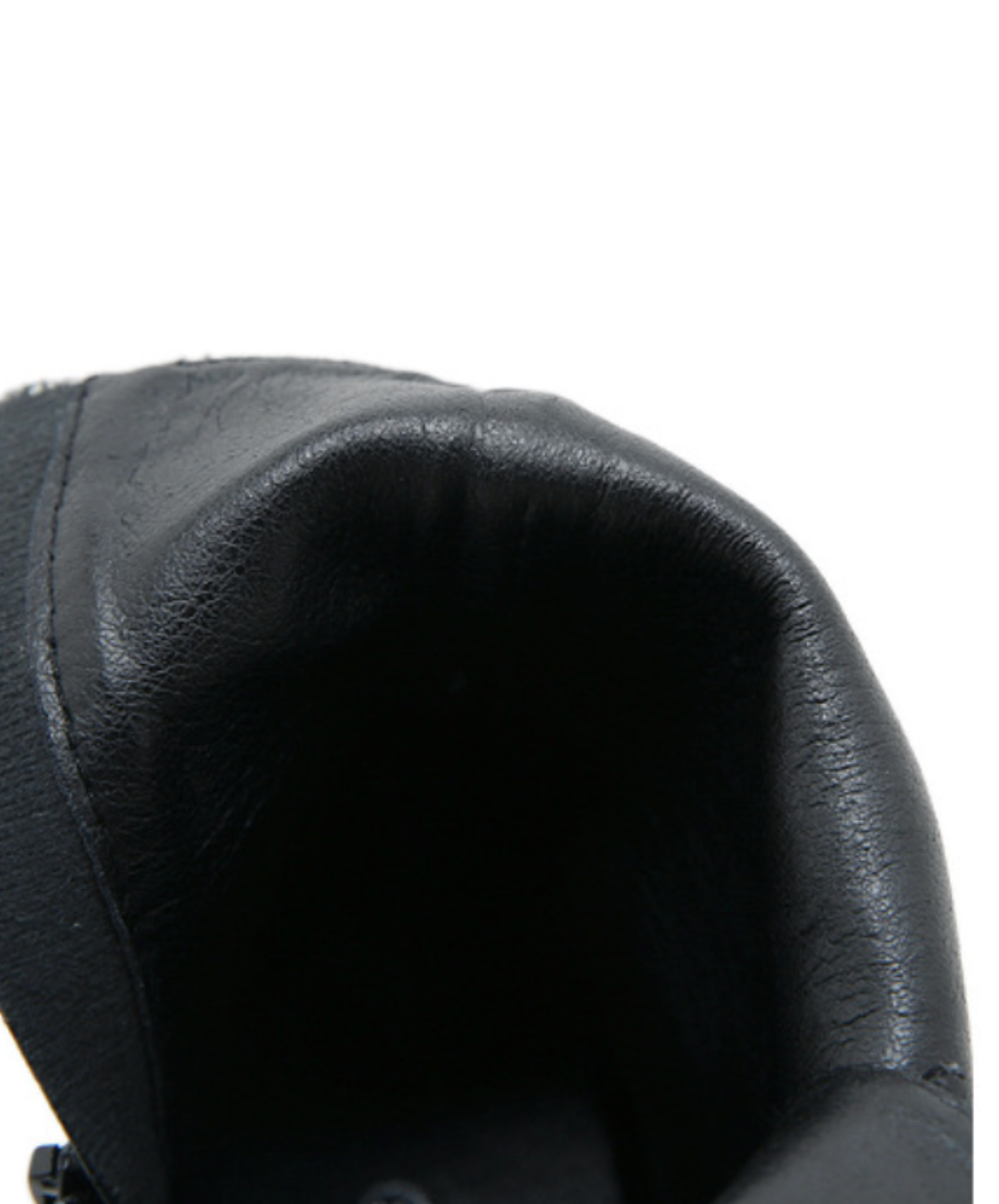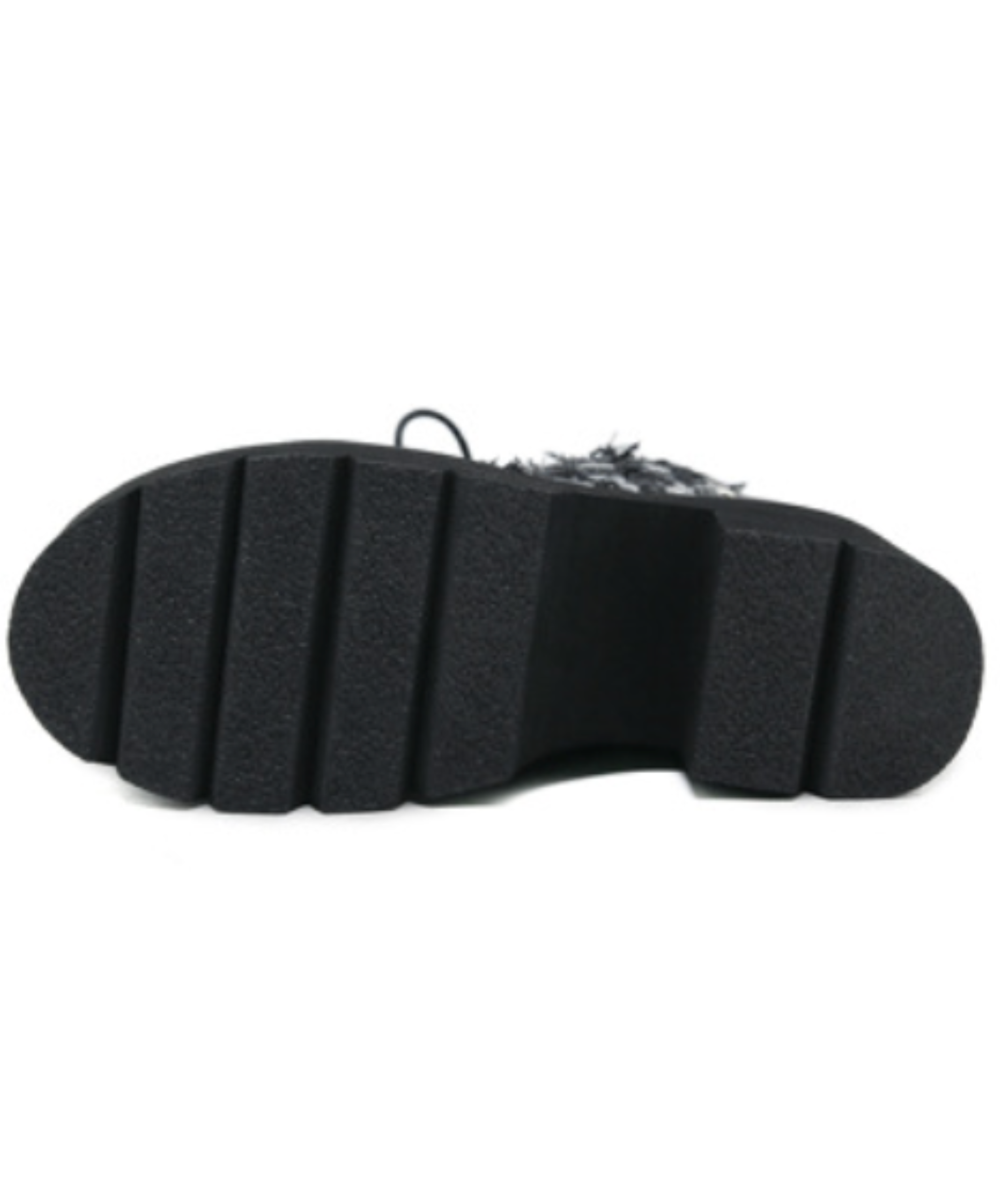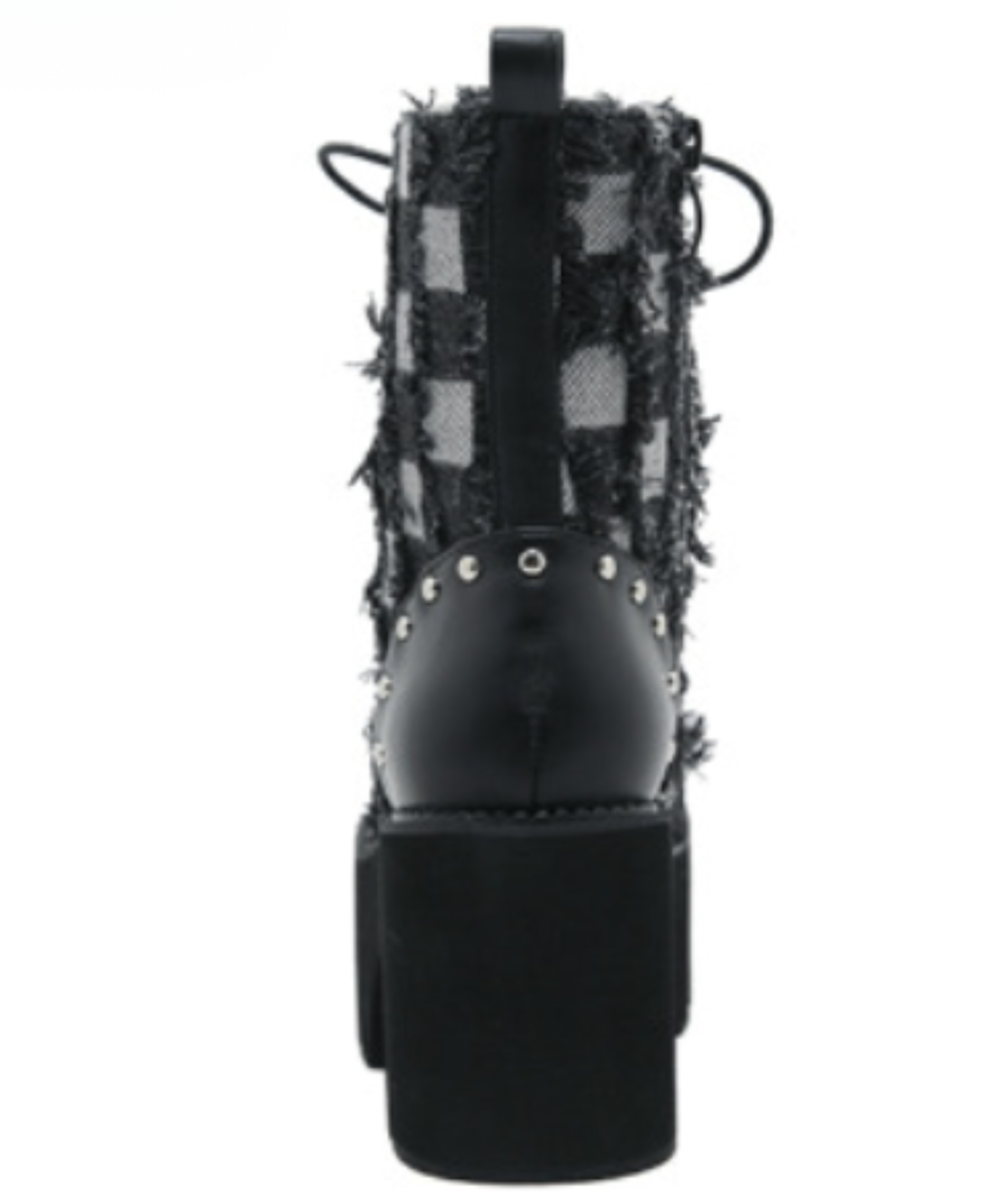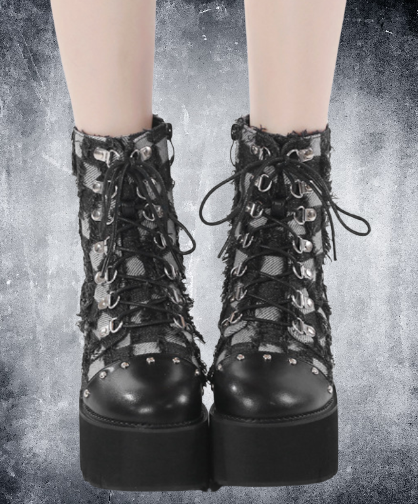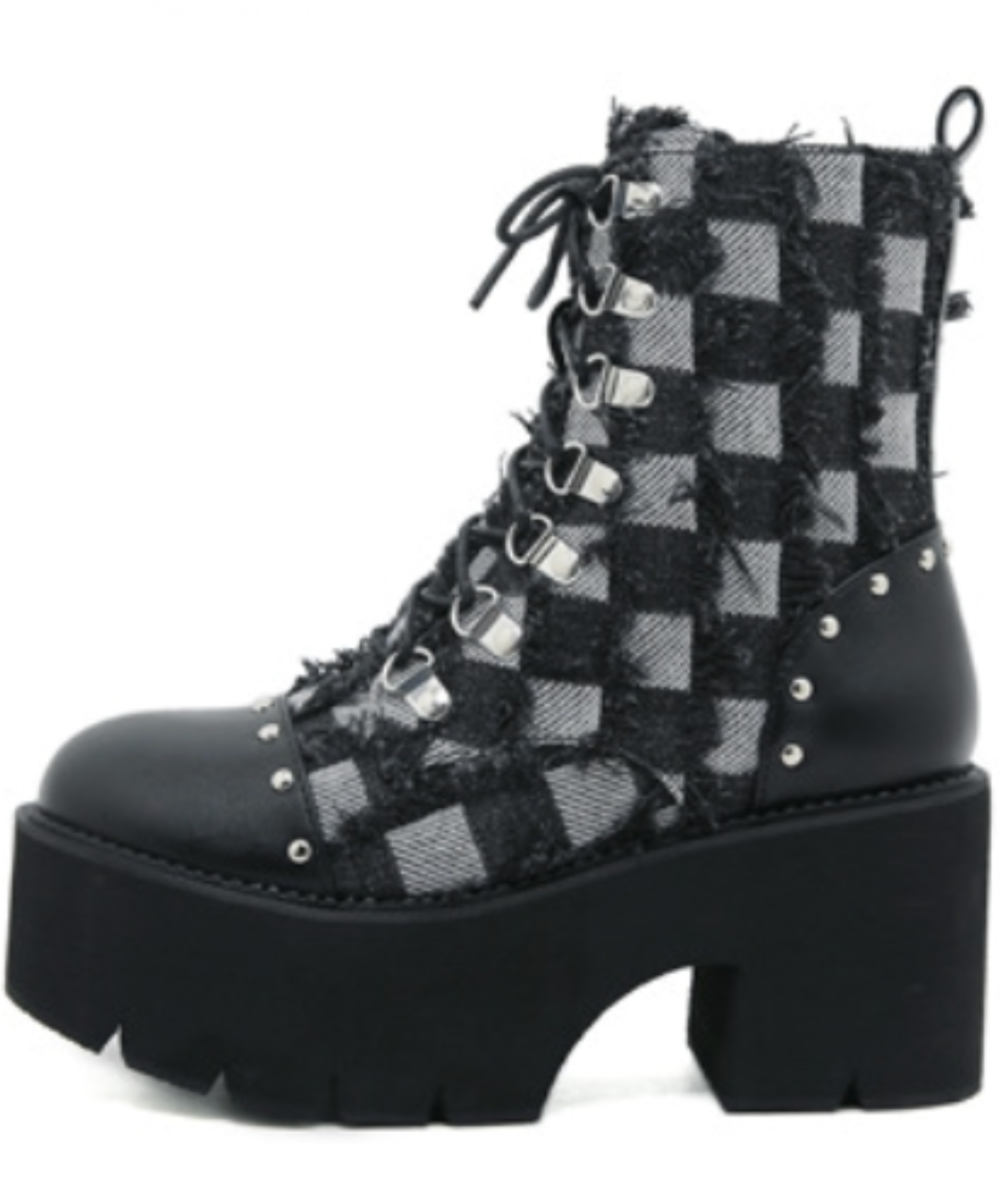 ・チェス盤のようなチェック柄の厚底ブーツ。