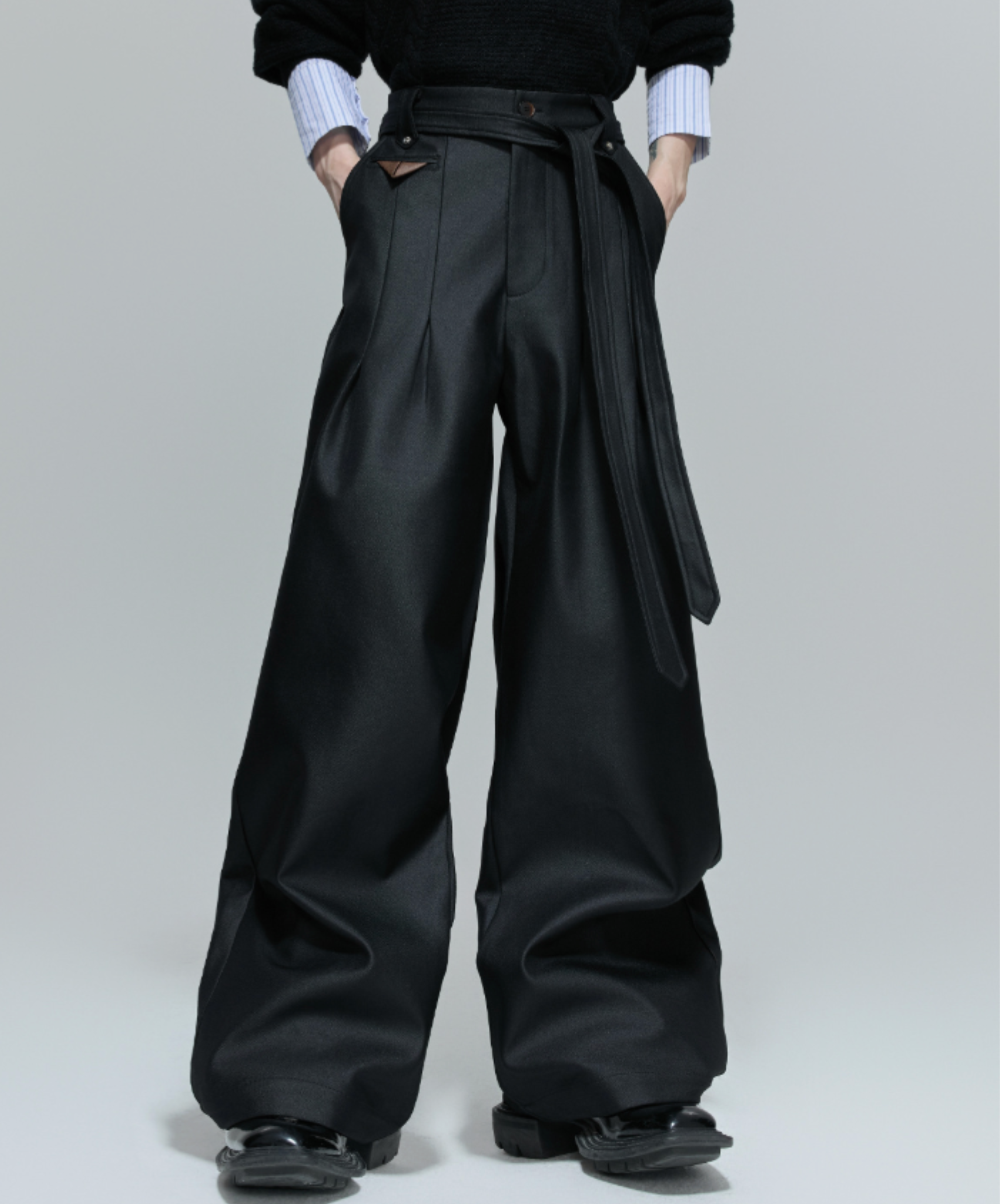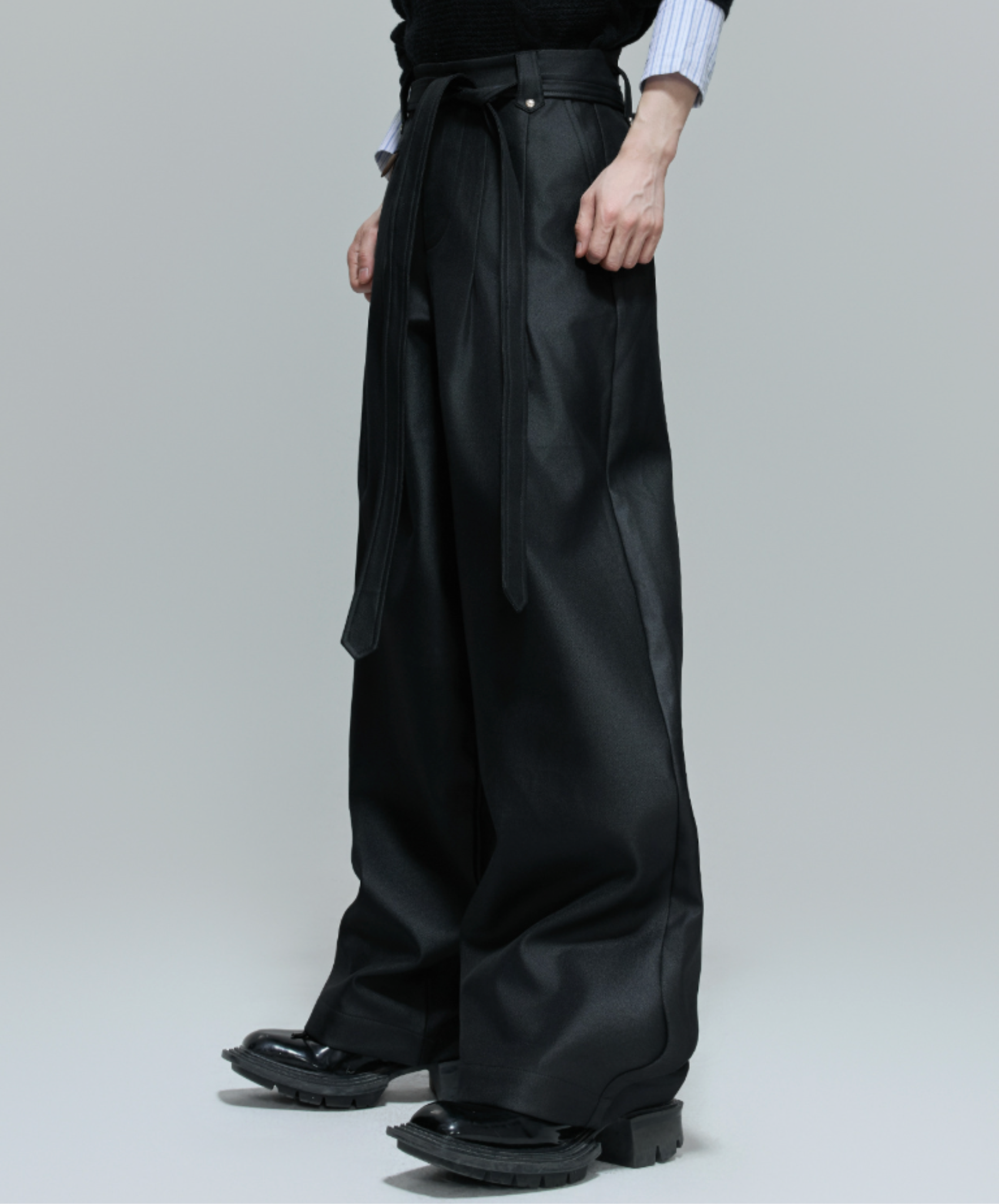 dark belt ribbon wide pants EN660