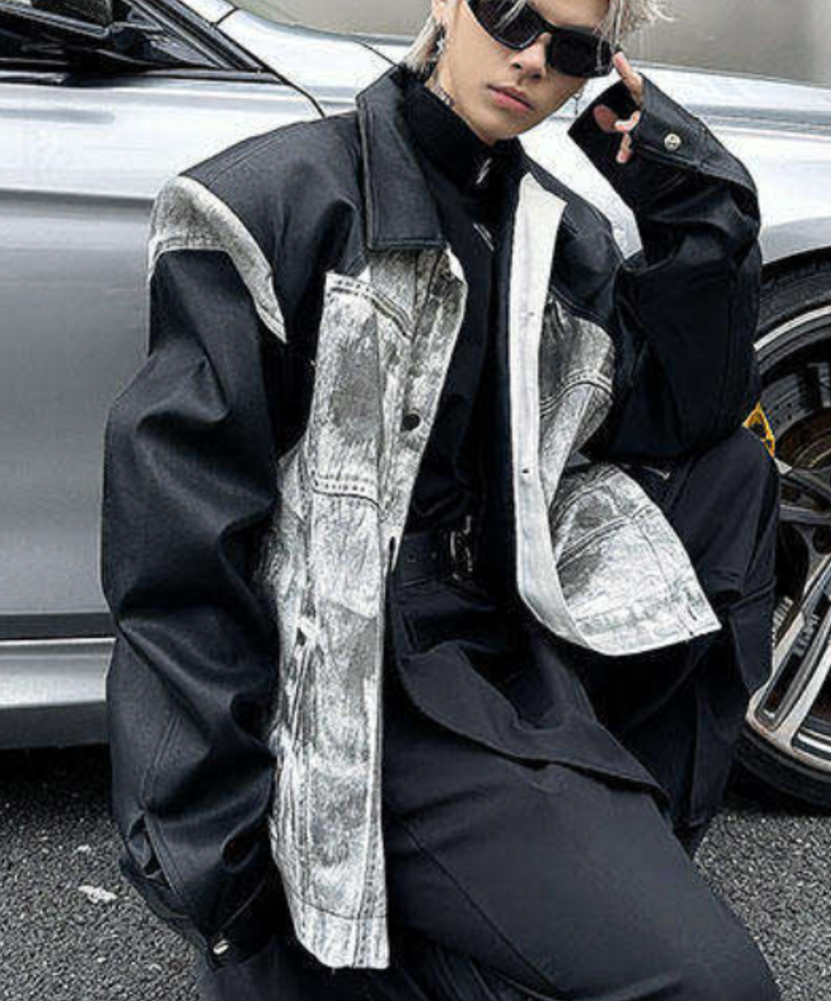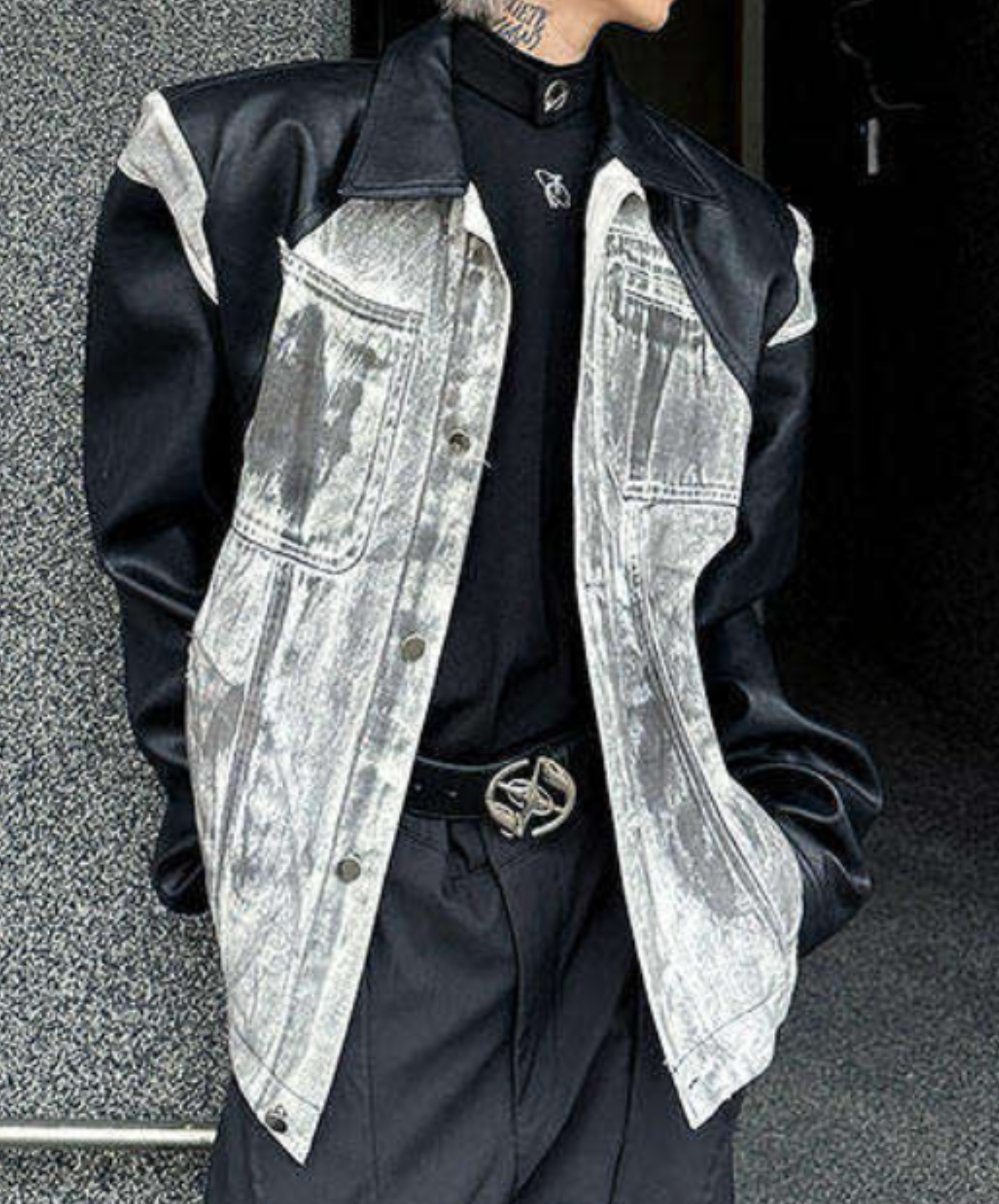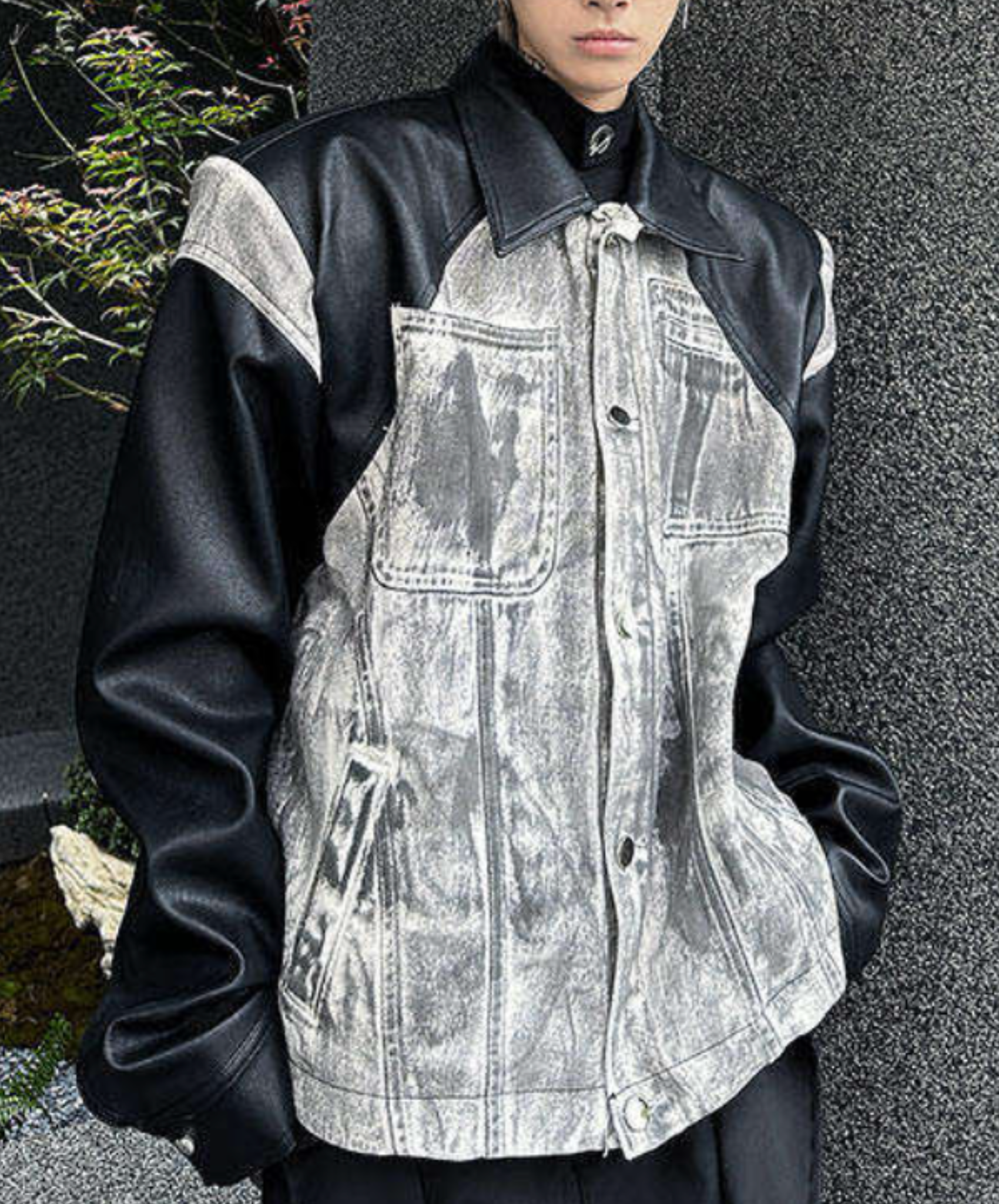 ・ハイダメージデニムプリントとPUレザーを組み合わせたジャケット。