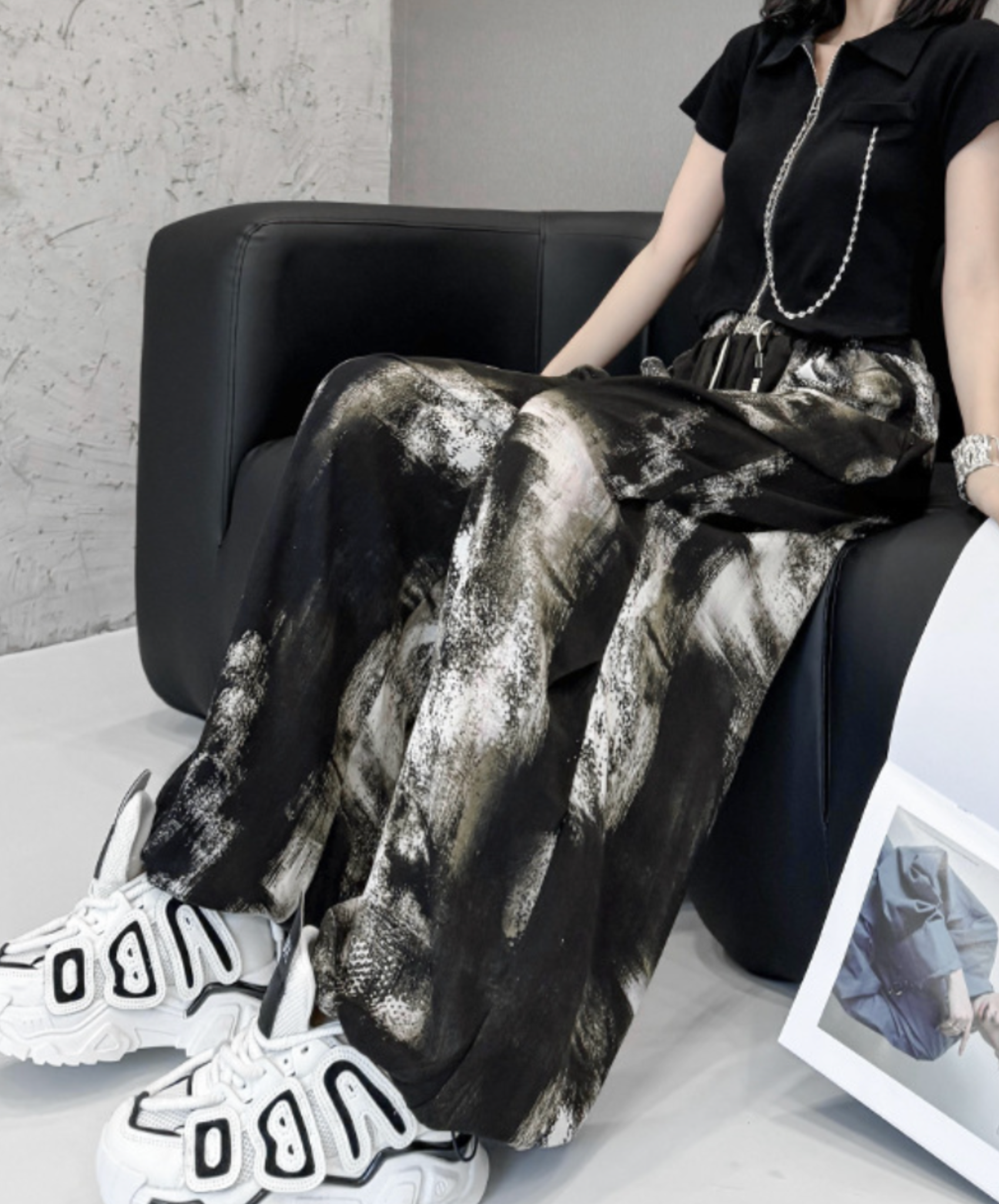 ・スプライシングデザインが個性を引き立てるワイドパンツ。