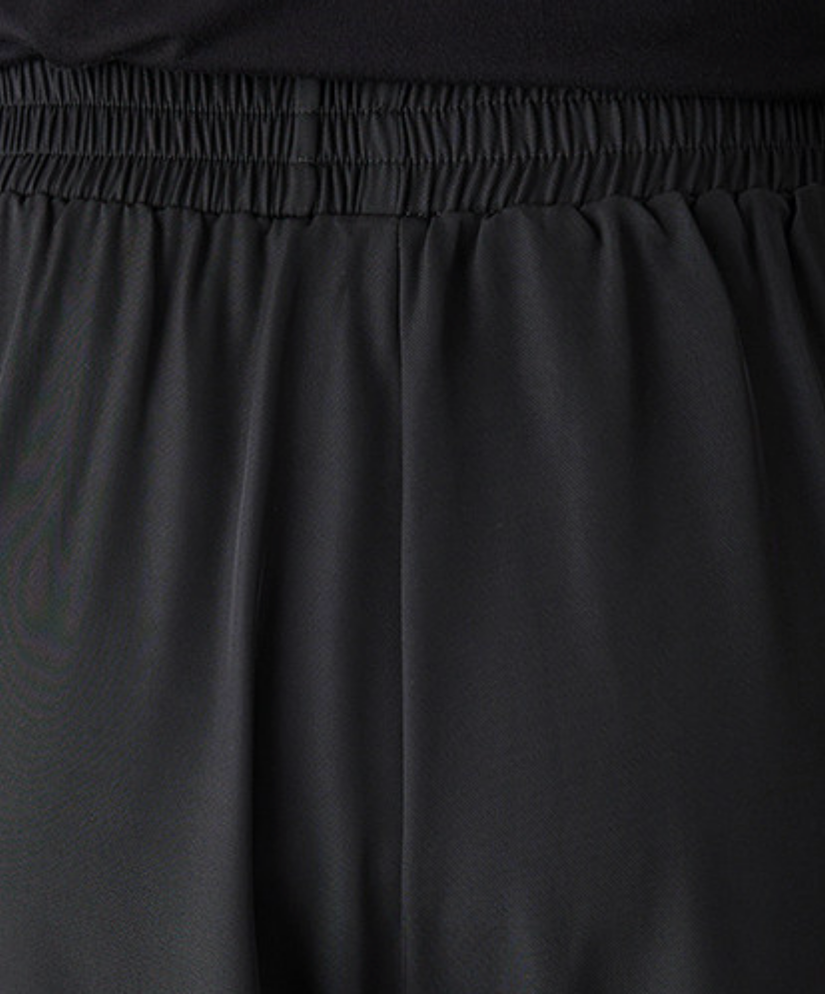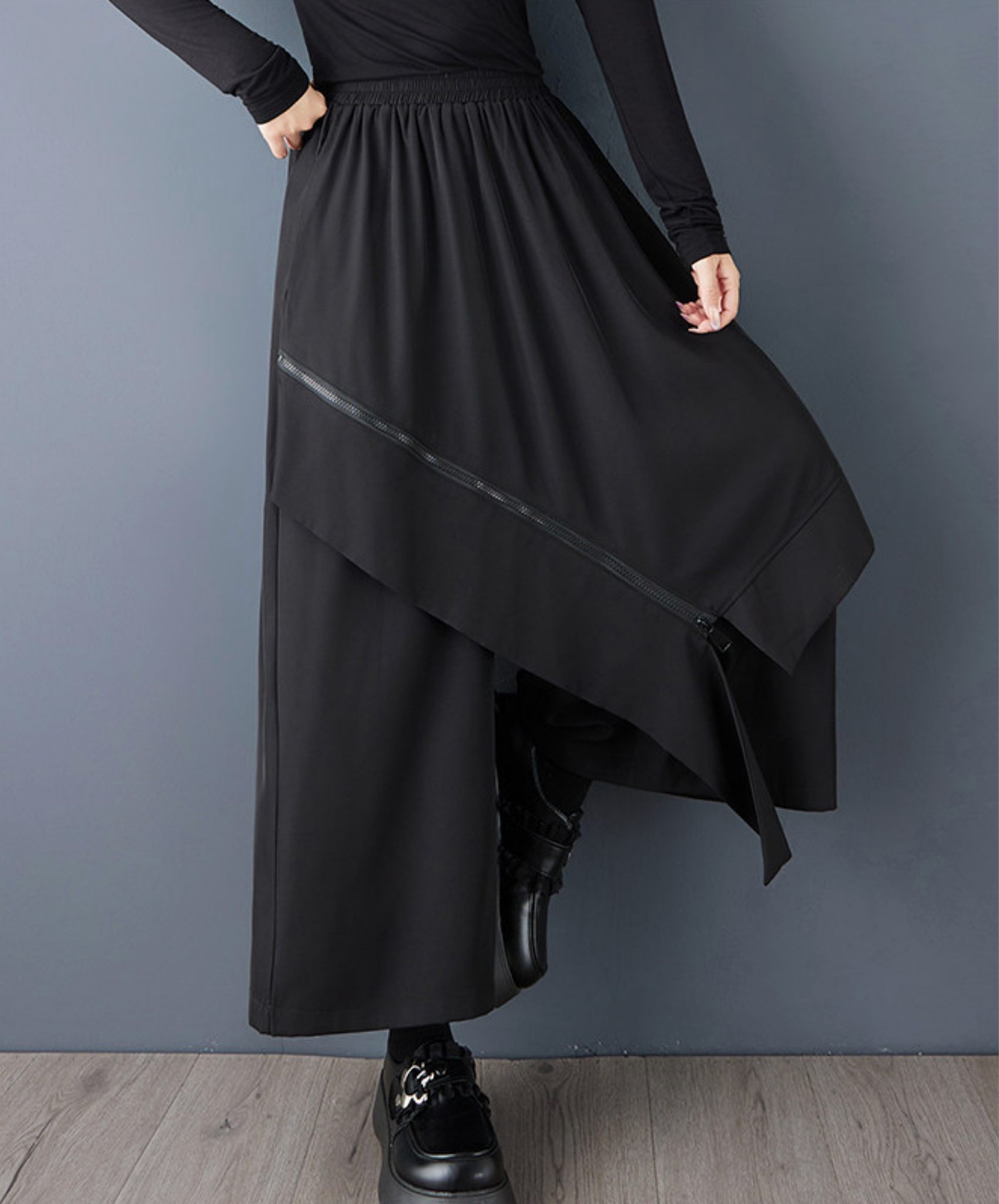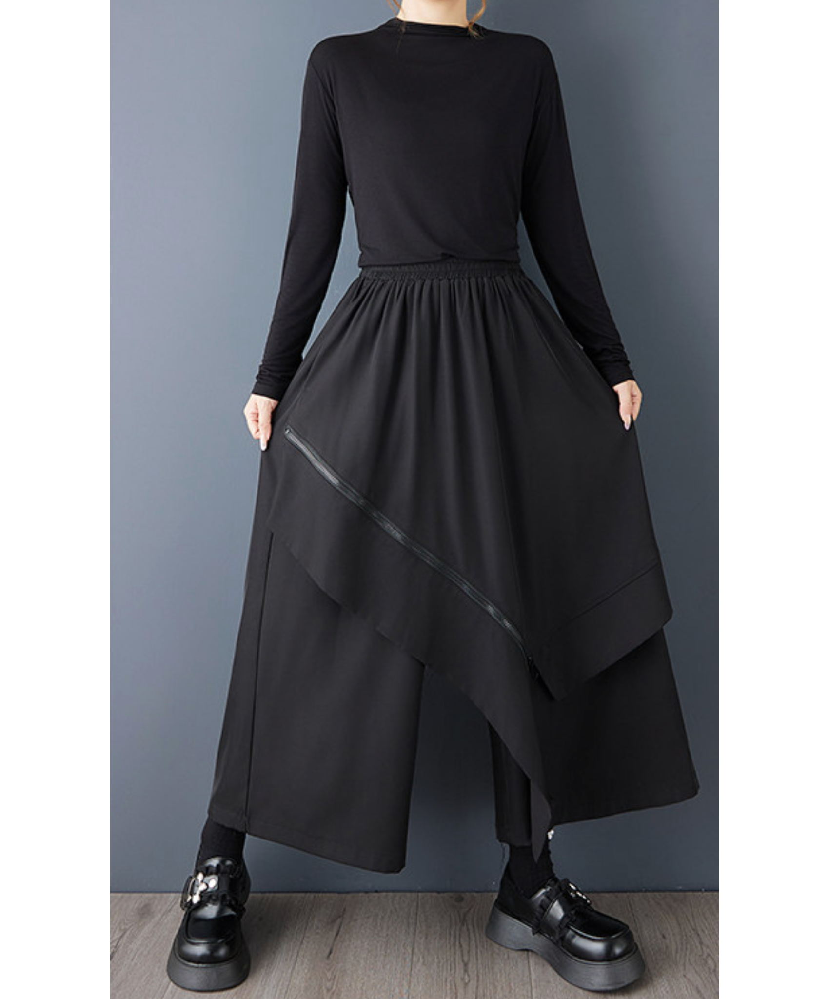 ・斜めに走るジッパーラインが特徴的なワイドパンツ。