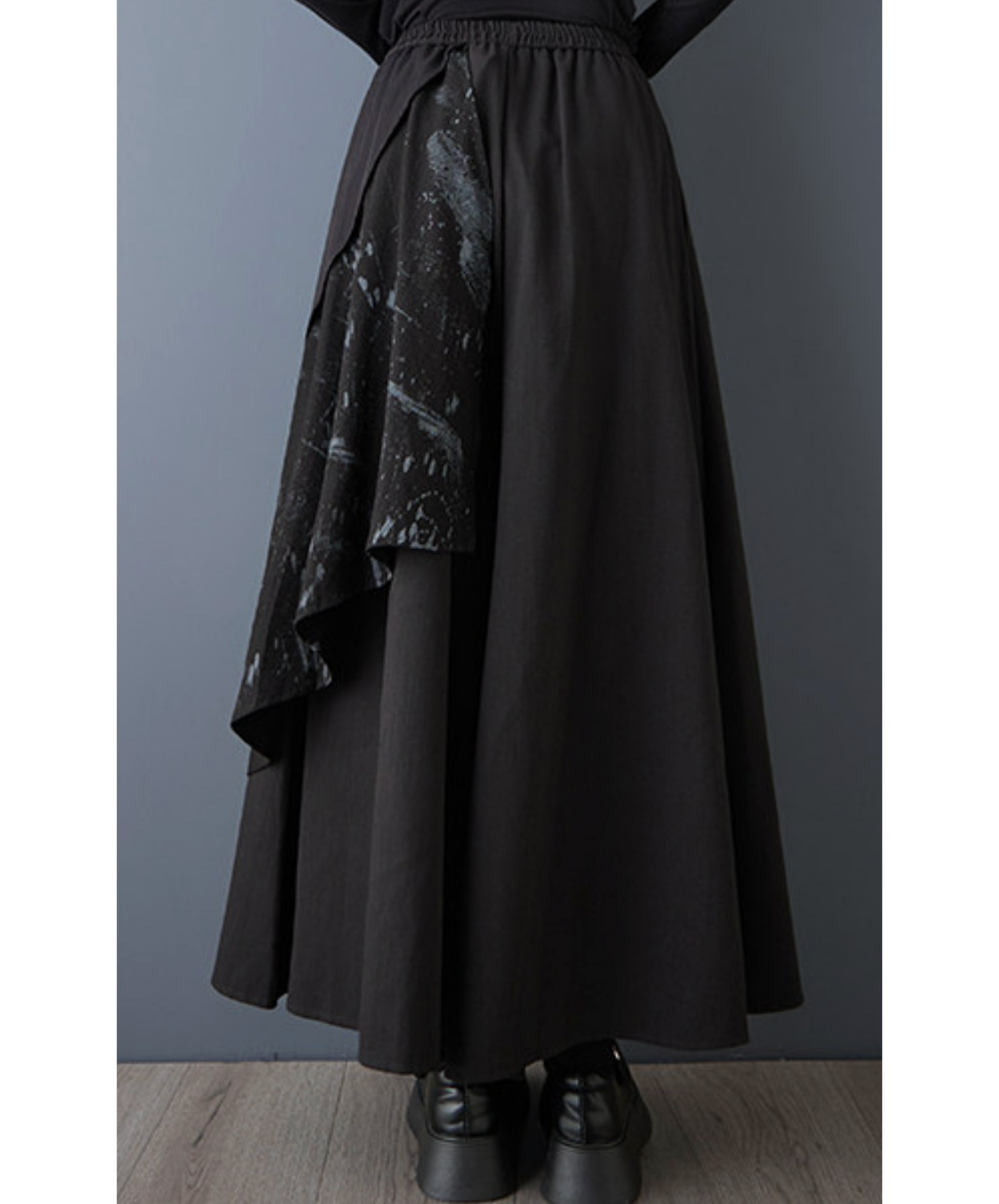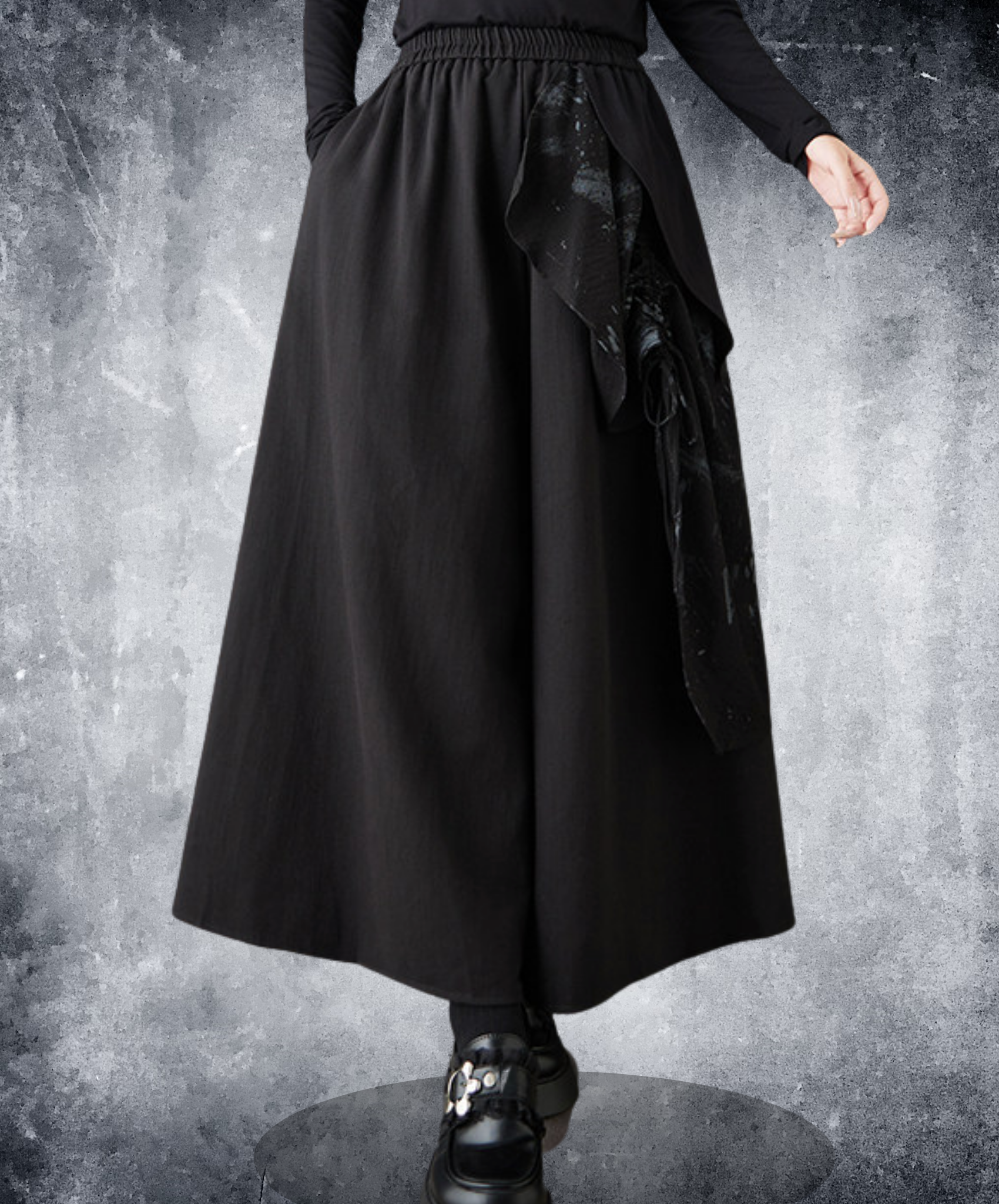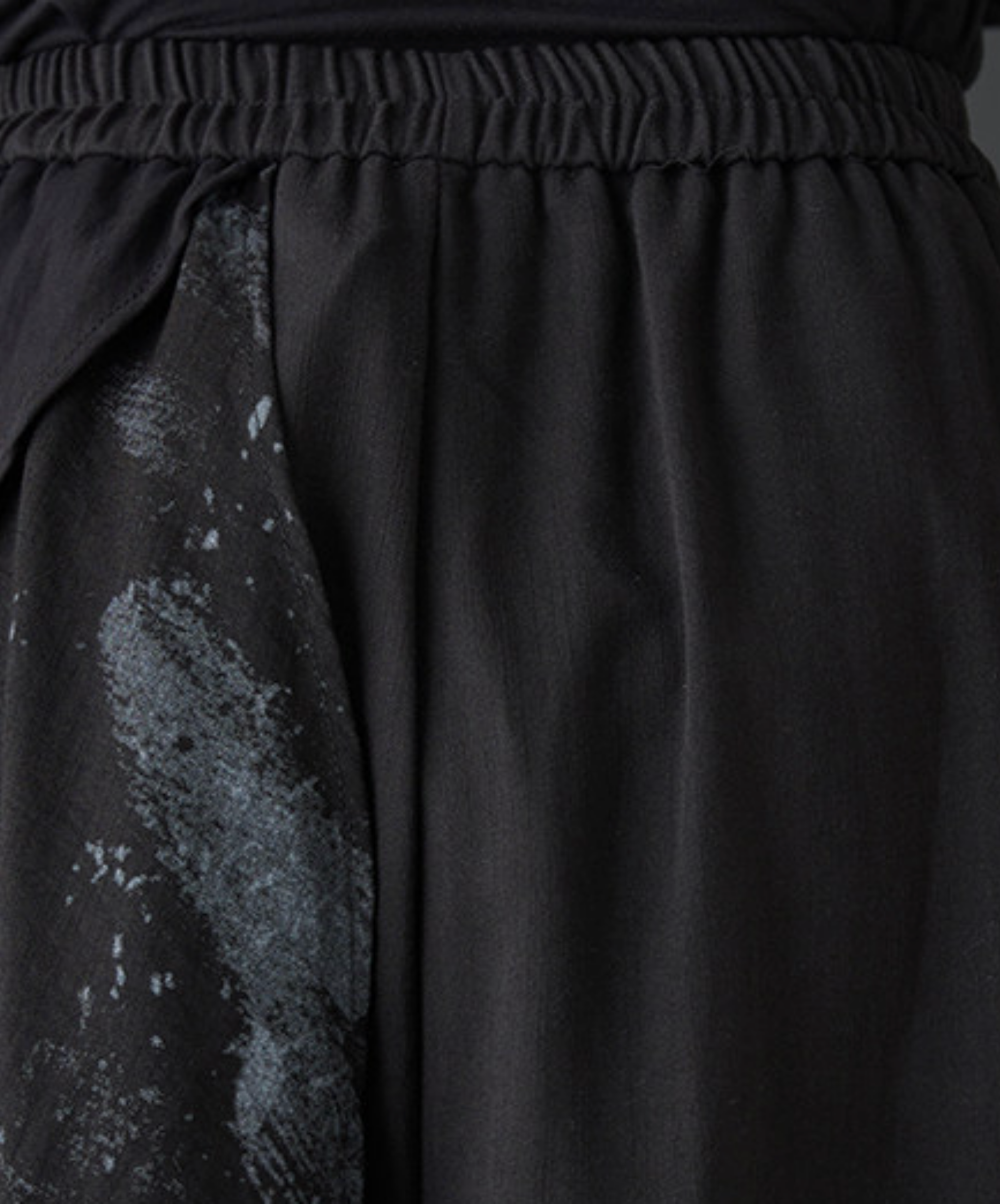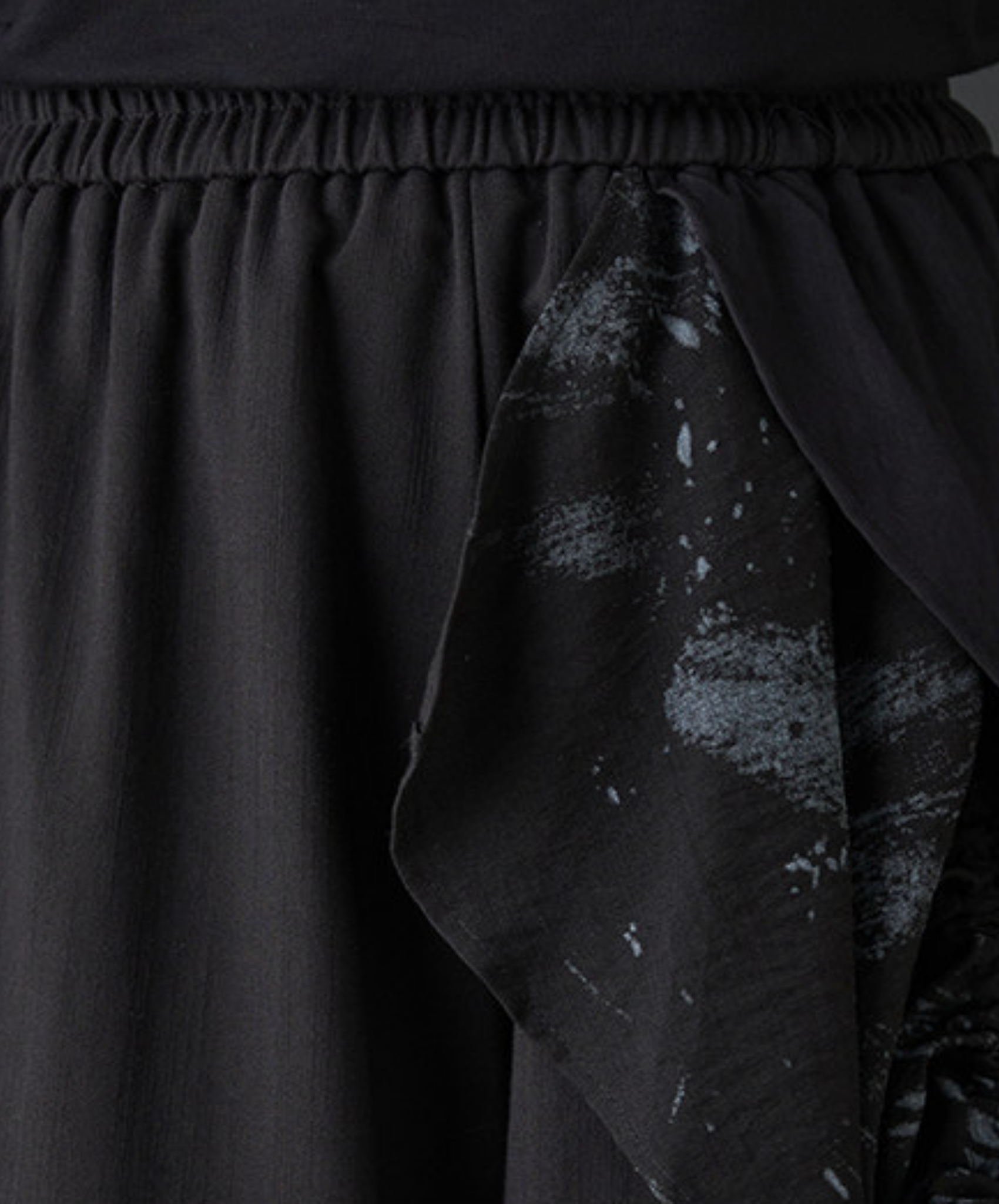 ・無地とプリント生地を組み合わせたドラマティックなワイドパンツ。