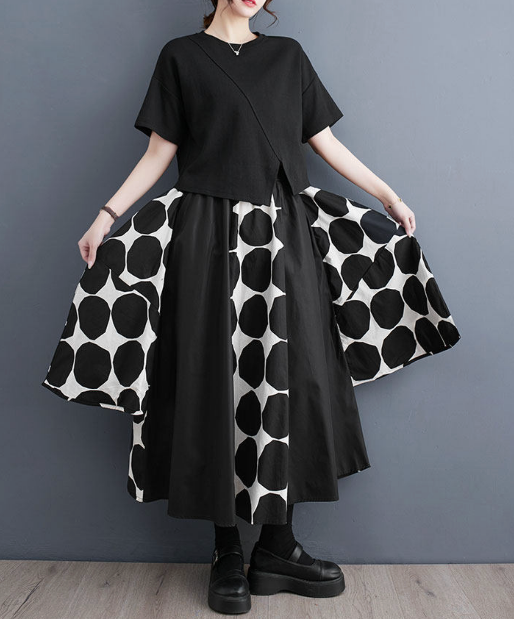 ・大きな水玉模様が遊び心を感じさせるワイドパンツ。